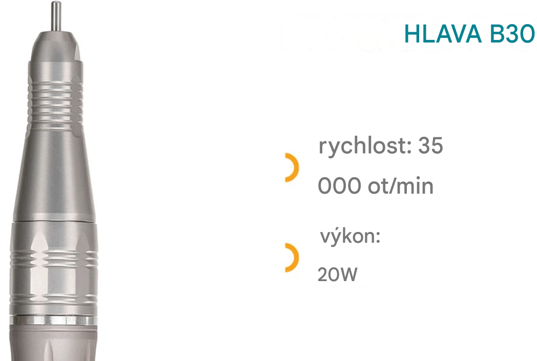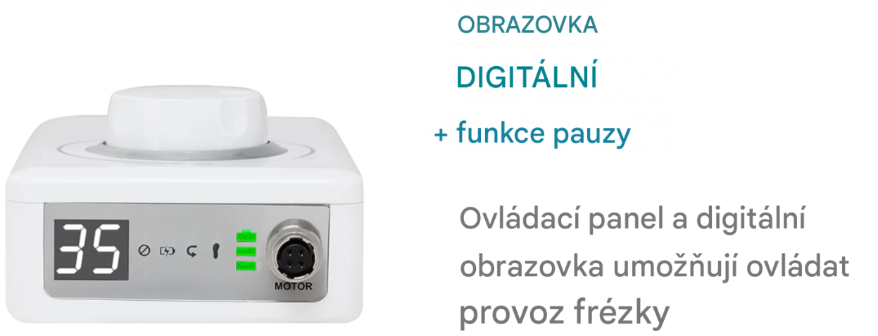 Pomocí knoflíku můžete nastavit otáčky hlavice až na 35 000 ot./min , což umožňuje efektivní přizpůsobení individuálním potřebám a v důsledku toho pohodlné provádění široké škály ošetření . Užitečná tlačítka umístěná po stranách umožňují snadné přepnutí na nožní pohon, pozastavení zařízení a změnu směru otáčení, což poskytuje plnou kontrolu nad frézkou a usnadňuje její přizpůsobení pro specifické aplikace. LED indikátory umožňují sledovat stav zařízení – indikují směr otáčení, stav baterie, aktivaci nožního pohonu a stav pozastavení. Zařízení je vybaveno ochranou proti přetížení s výstražným LED signálem, který chrání motor před přehřátím , zajišťuje tak větší provozní bezpečnost a chrání zařízení před poškozením.