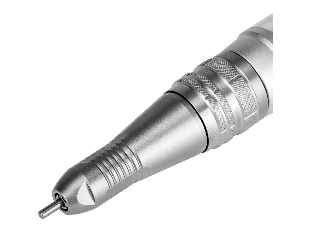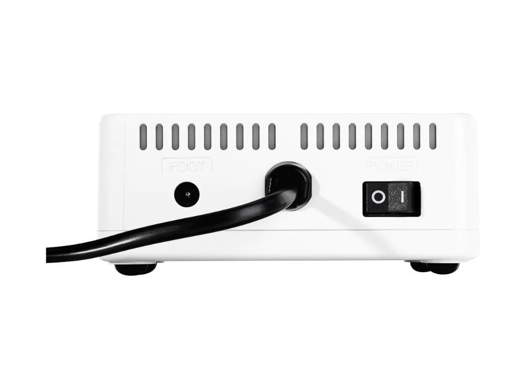 Bruska na nehty je vybavena přehledným ovládacím panelem s digitálním displejem, který hraje klíčovou roli při sledování a řízení provozu stroje. Displej zobrazuje rychlost, s jakou aktuálně pracuje hlava jednotky, a zajišťuje tak přesný a bezpečný provoz frézky. Nastavení rychlosti pomocí voliče je možné až do 30 000 otáček za minutu, což umožňuje přizpůsobení, a tedy pohodlné provádění široké škály ošetření. Systém plynulé změny směru otáčení s integrovanou pauzou zajišťuje bezpečný a pohodlný přechod mezi oběma směry práce. Kromě toho se LED dioda směru otáčení rozsvítí zeleně nebo červeně, což usnadňuje identifikaci směru frézy. Ovládací panel je rovněž vybaven funkcí pauzy, která umožňuje uživateli zastavit provoz stroje a získat tak větší kontrolu nad procesem. Díky použitým řešením je ovládání frézky intuitivní a velmi efektivní.
