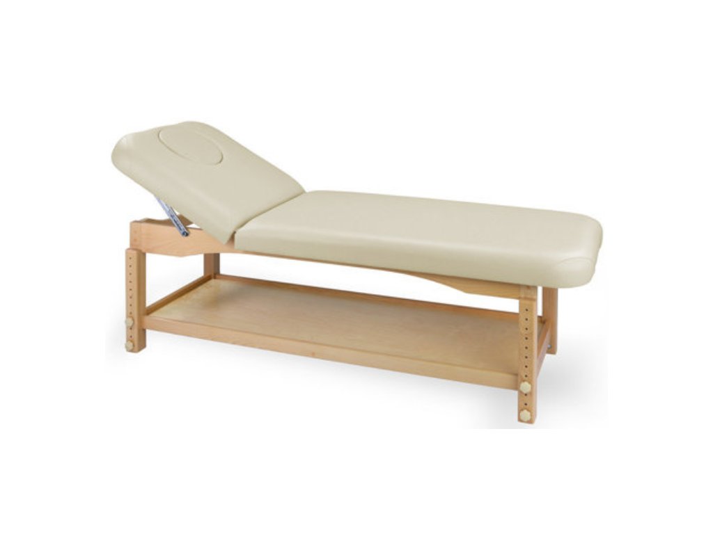Výjimečně pohodlná dvousegmentová lehátka s výškovým nastavením, vybavená praktickou poličkou na doplňky a kosmetiku. Speciální složení pěn o tloušťce 5 cm poskytuje pacientovi naprosté pohodlí během ošetření a umožňuje plnou relaxaci. Nastavitelné opěradlo umožňuje široké využití lehátka. Přírodní bukové dřevo a masivní deska stolu se zaoblenými rohy dodávají lehátku moderní a efektní vzhled.