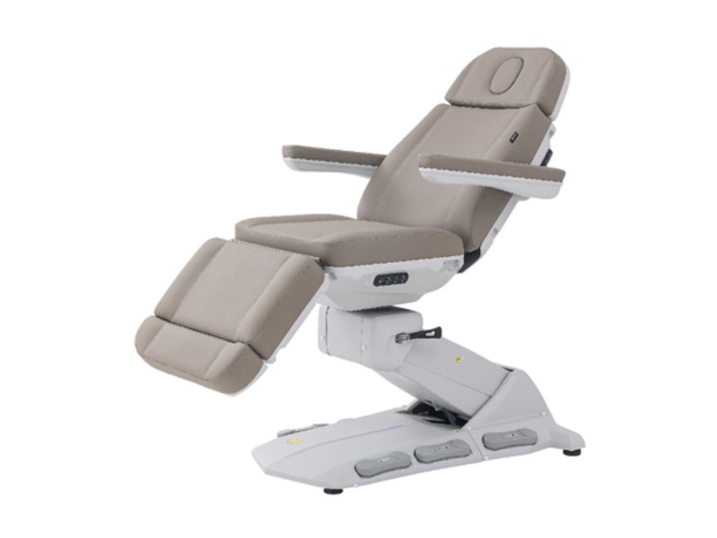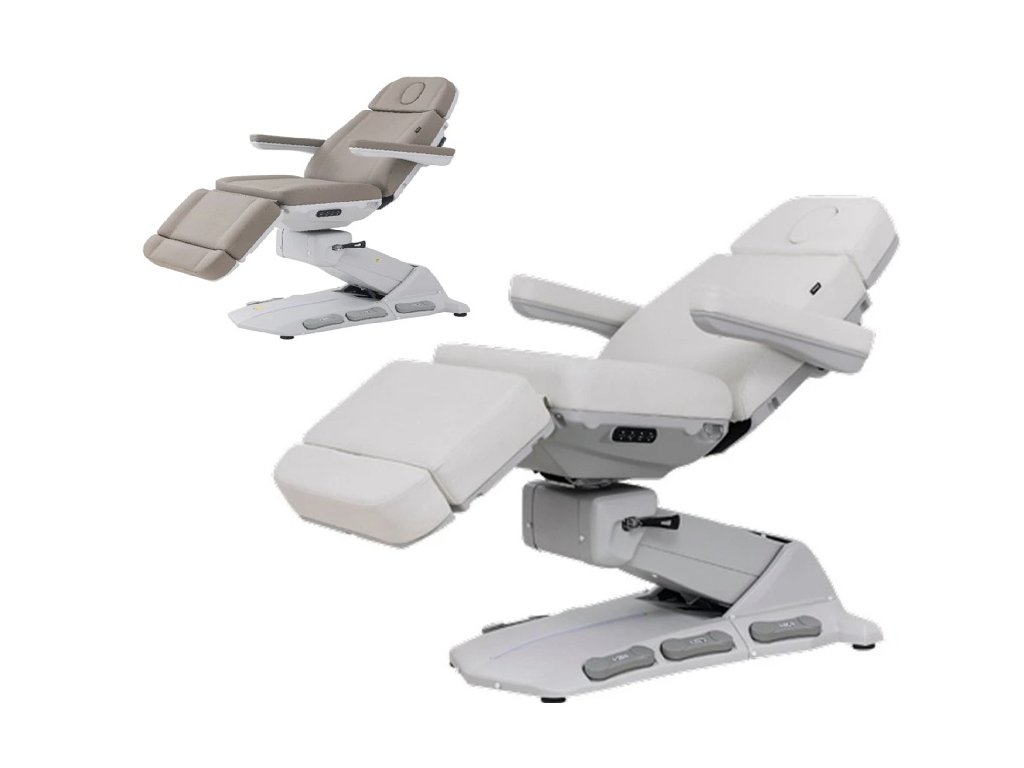 Moderní kosmetické křeslo s ultra měkkým vysoce komfortním polstrováním a velmi stabilní konstrukcí speciálně navrženou pro optimalizaci pracovního prostoru díky rotaci o 90°. 4 motory ovládají výšku, sklon opěradla, sedáku a opěrky nohou. Obsahuje 3 programovatelné paměti polohy a funkci RST pro návrat do výchozí polohy. Sklopné područky. Tlačítkové panely a zabudovaný nožní ovladač umožňují kompletní ovládání všech funkcí z libovolného místa křesla. Bílé a béžové PU čalounění vysoké kvality.