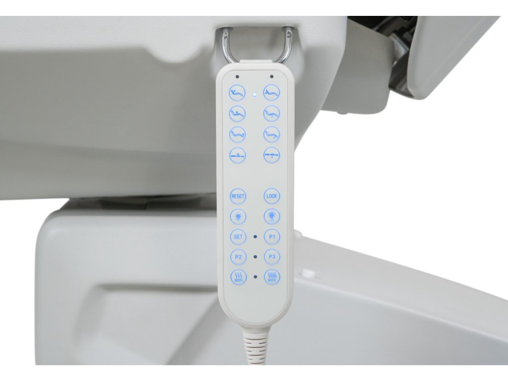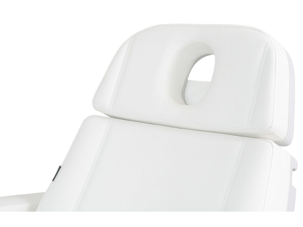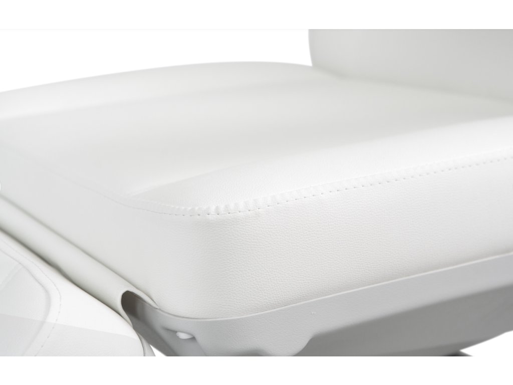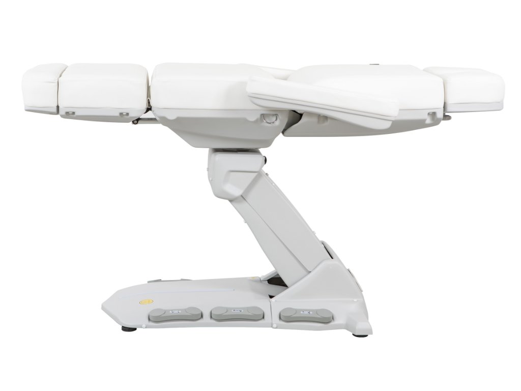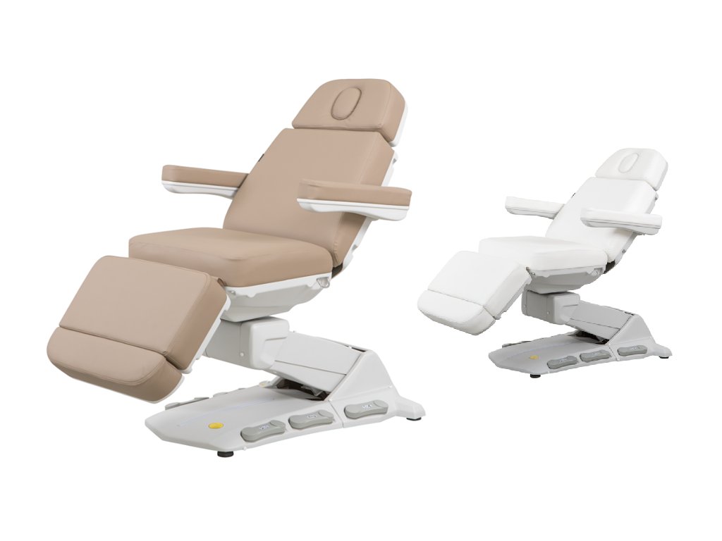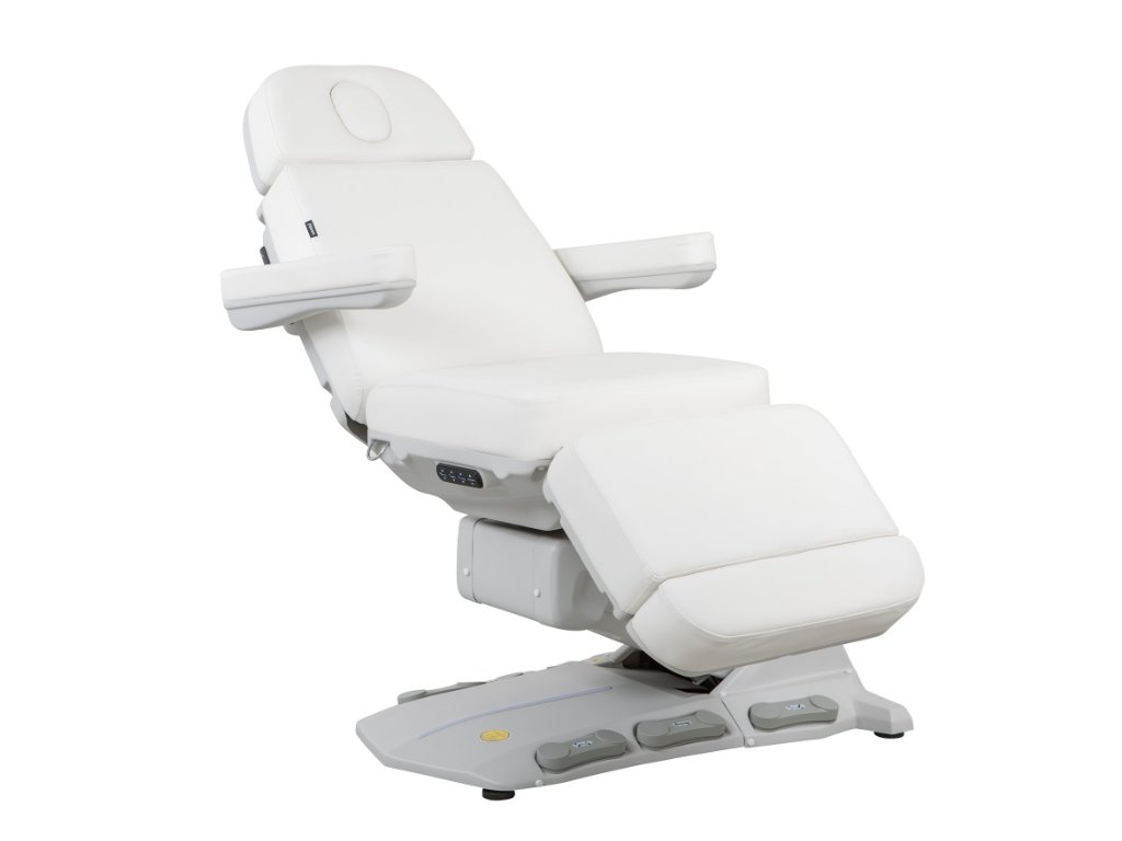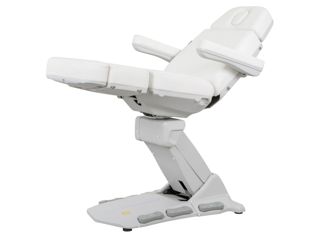 Moderní kosmetické křeslo s vyhříváním a velmi stabilní konstrukcí speciálně navrženou pro optimalizaci pracovního prostoru díky rotaci o 110°. 4 motory ovládají výšku, sklon opěradla, sedáku a opěrky nohou. Obsahuje 3 programovatelné paměti polohy a funkci RST pro návrat do výchozí polohy. Sklopné područky. Tlačítkové panely a zabudovaný nožní ovladač umožňují kompletní ovládání všech funkcí z libovolného místa křesla. Vysoce kvalitní bílé a béžové PU čalounění a držák papírové role v ceně.