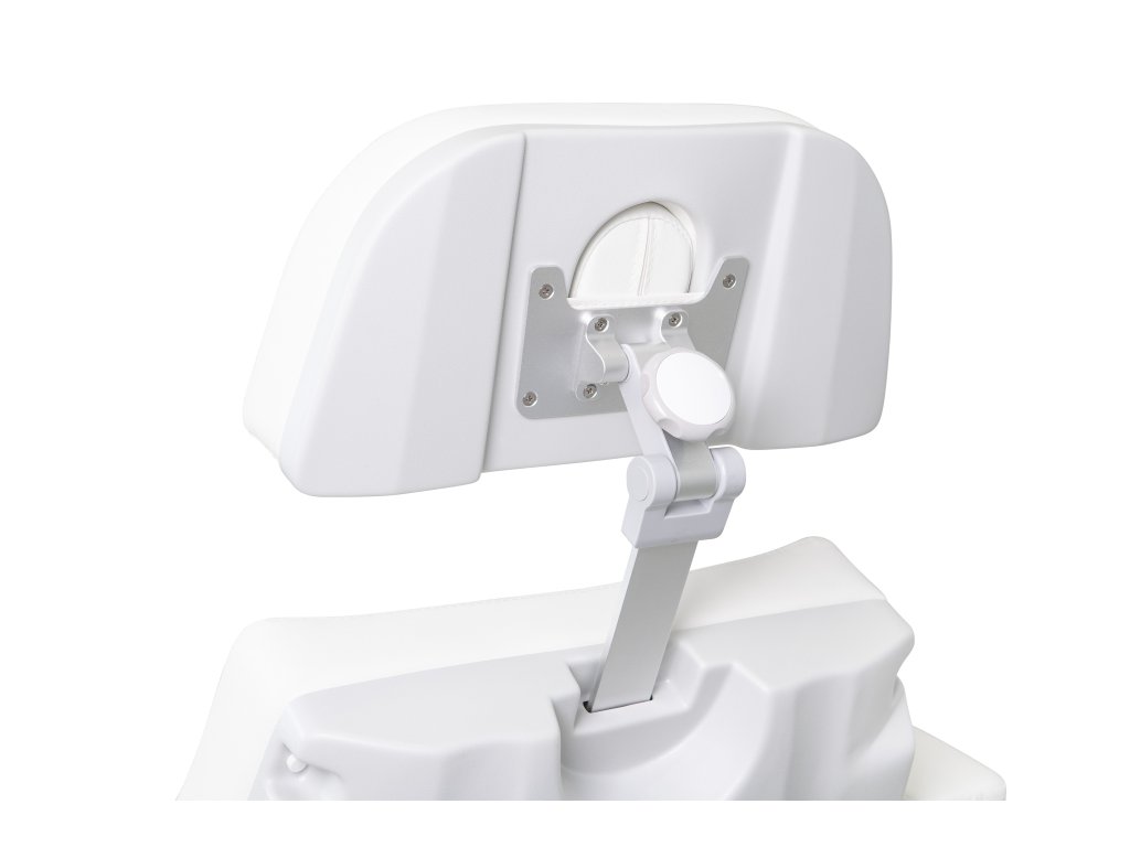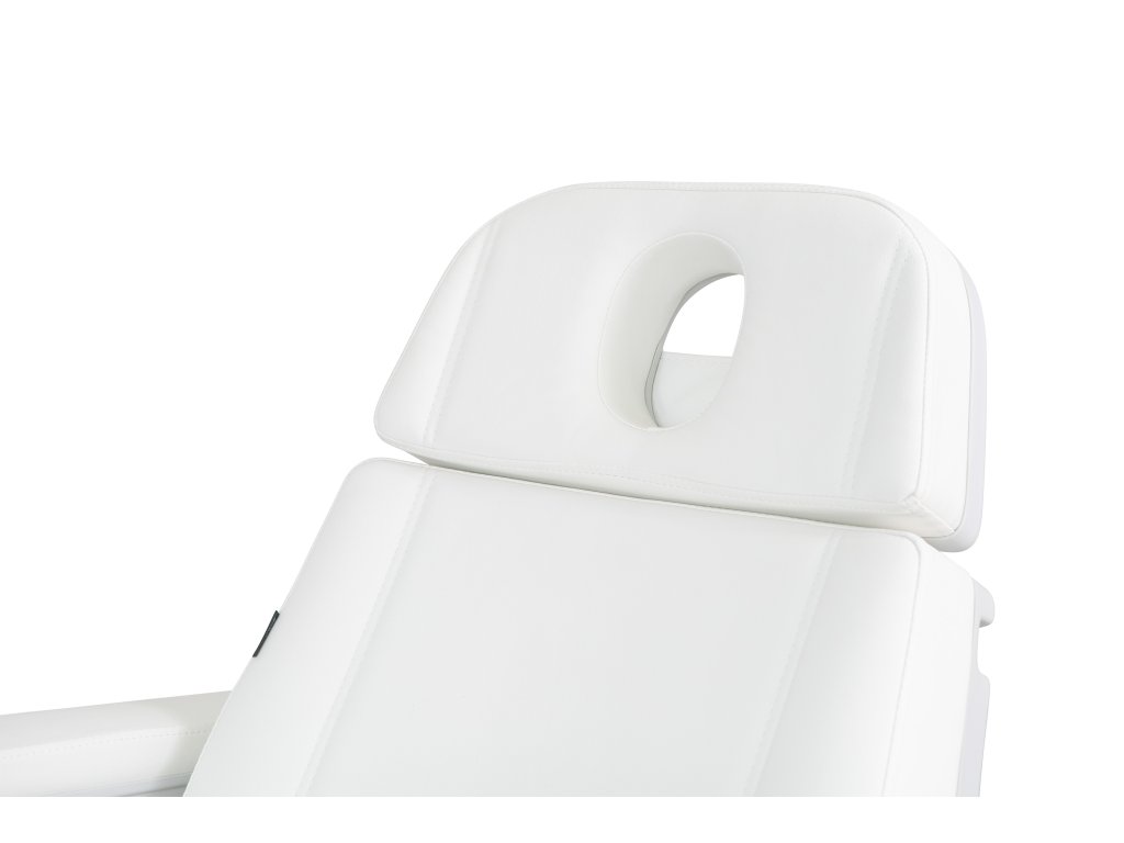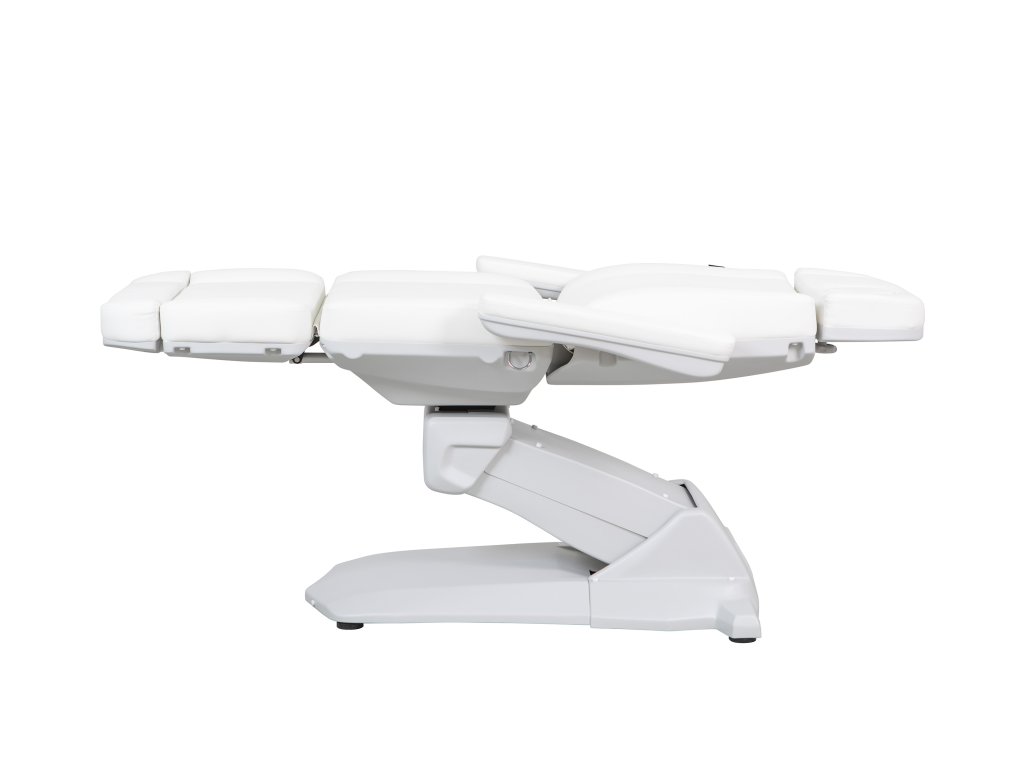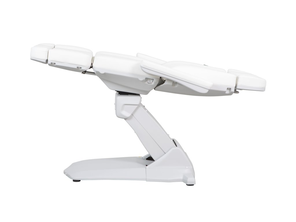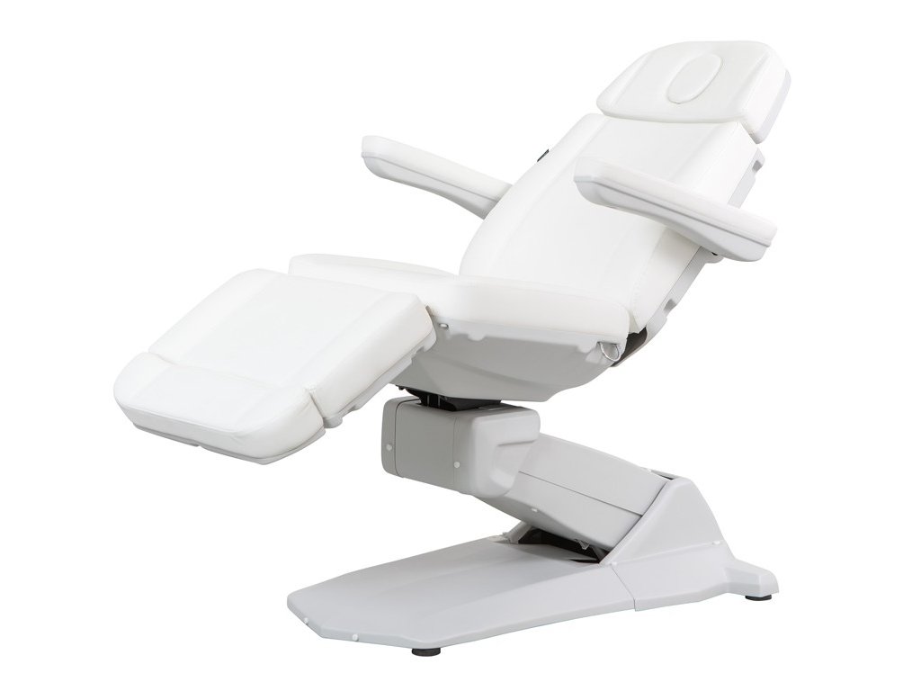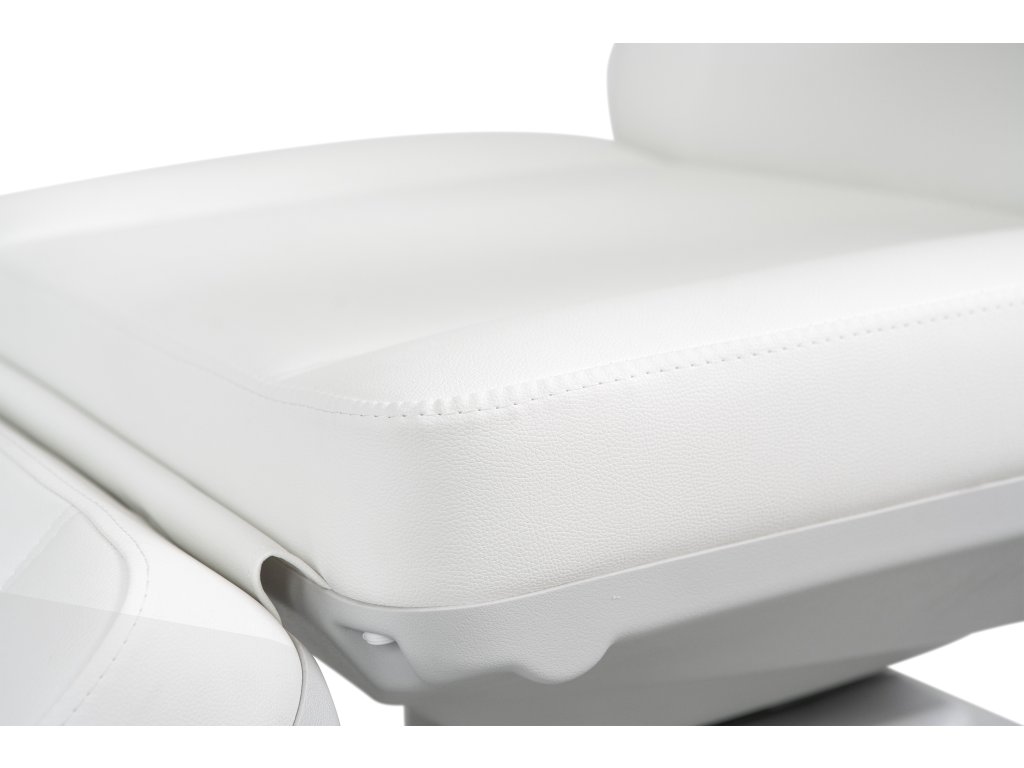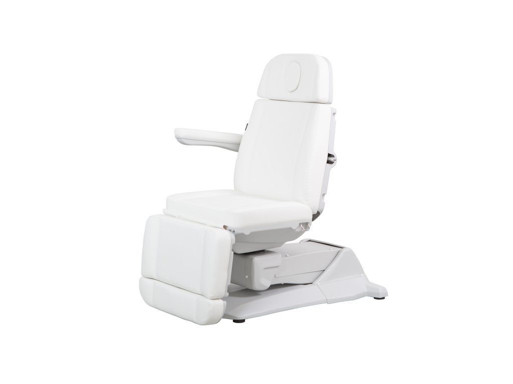 Moderní špičkové kosmetické křeslo s velmi stabilní konstrukcí, speciálně navržená pro optimalizaci pracovního prostoru. Disponuje 4 motory, které ovládají výšku, sklon opěradla, sklon sedáku a opěrky nohou. Sklopné područky. Vysoce kvalitní bílé PU čalounění.