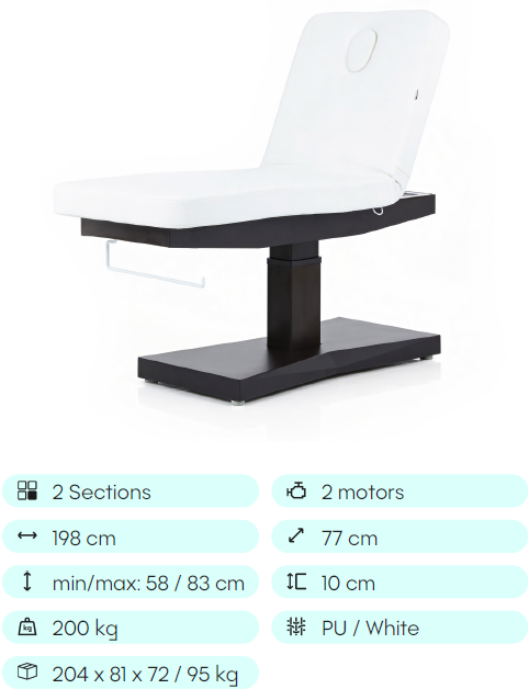 Elektrické nastavení výšky a opěradla s motorem na sloupku, který zajišťuje vysokou rychlost nastavení. Jednodílná matrace se 2 částmi navržená pro zajištění maximálního pohodlí během procedur, se zátkou otvoru. Ovládání ručním ovladačem a funkcí reset pro rychlý a pohodlný přístup na lůžko a vstávání z něj. Čalouněná snadno čistitelným PU, upevněná na elegantní dřevěné základně v hnědé barvě. Navržena pro optimalizaci každodenní práce, je ideální jak pro masáže, tak pro ošetření obličeje a těla.