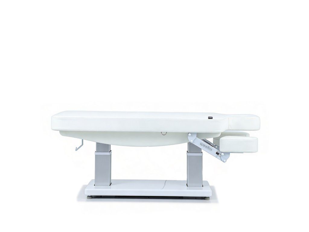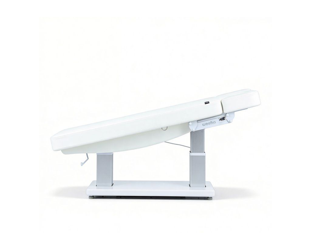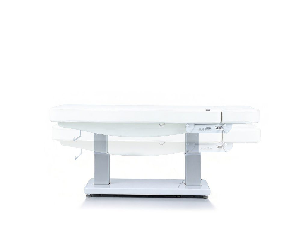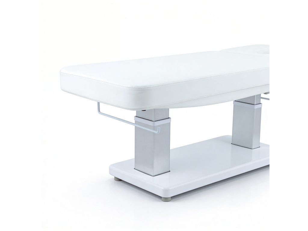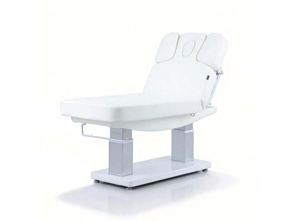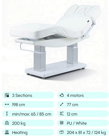Elektrické nastavení výšky, opěradla a opěrky nohou s Trendelenburgovou, Anti-Trendelenburgovou a Antigravitační polohou. Rychlý sloupkový motor usnadňuje plynulé nastavení do více poloh a optimalizuje tak každodenní práci v kabině. Jednodílná třídílná matrace s polstrováním SuperSoft, navržená pro maximální pohodlí pacienta. Je vybavena zátkou pro otvor pro obličej a nezávisle nastavitelným systémem loketních opěrek, který zlepšuje relaxaci krční páteře během ošetření v poloze obličejem dolů. Ovládání ručním ovladačem s funkcí resetování a digitální obrazovkou pro přesné nastavení teploty. Čalouněná PU pěnou s vysokou hustotou a upevněná na elegantním bílém dřevěném podnoží.