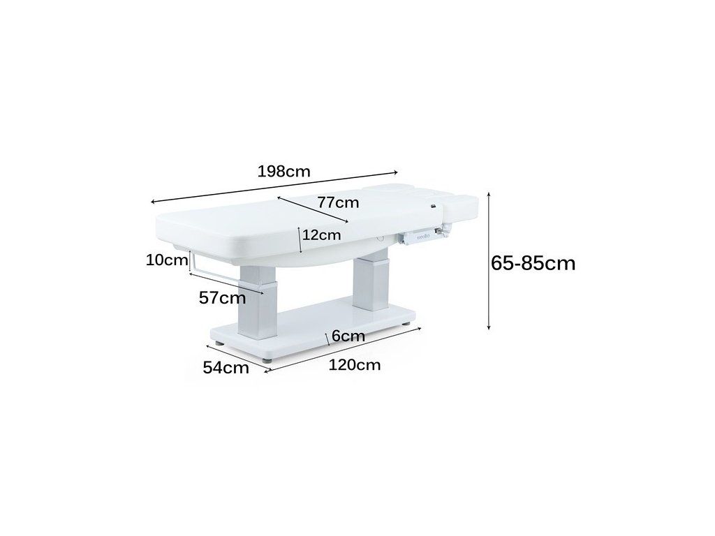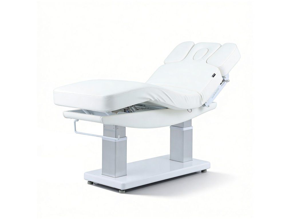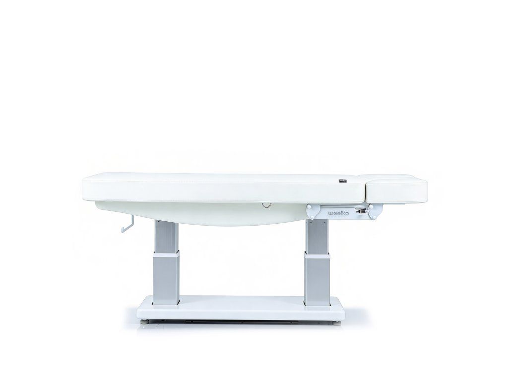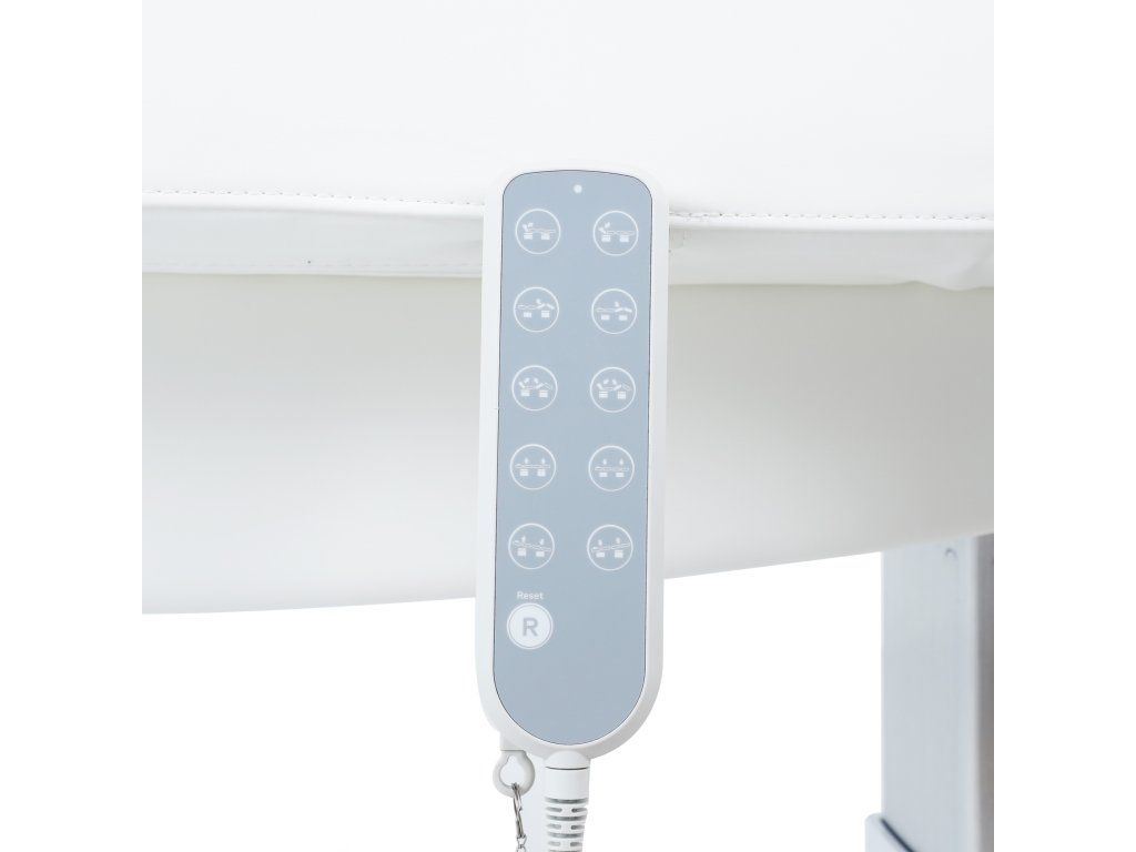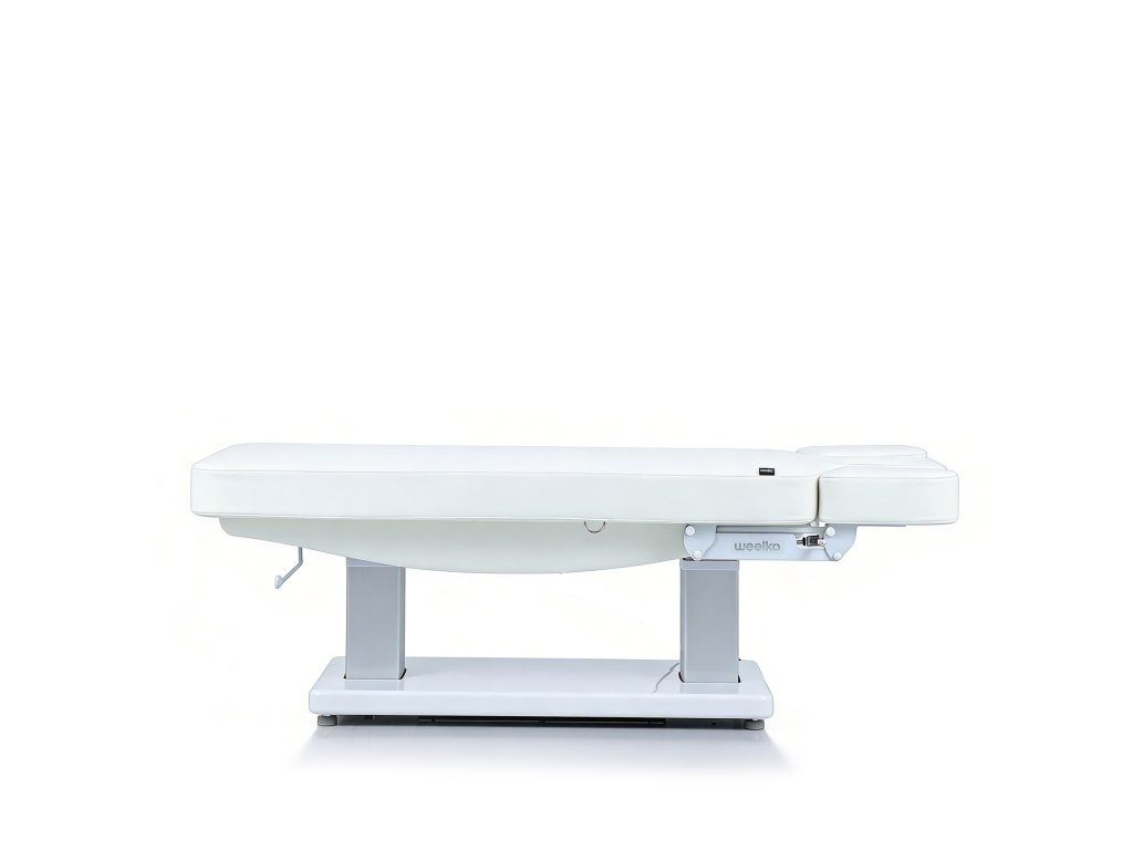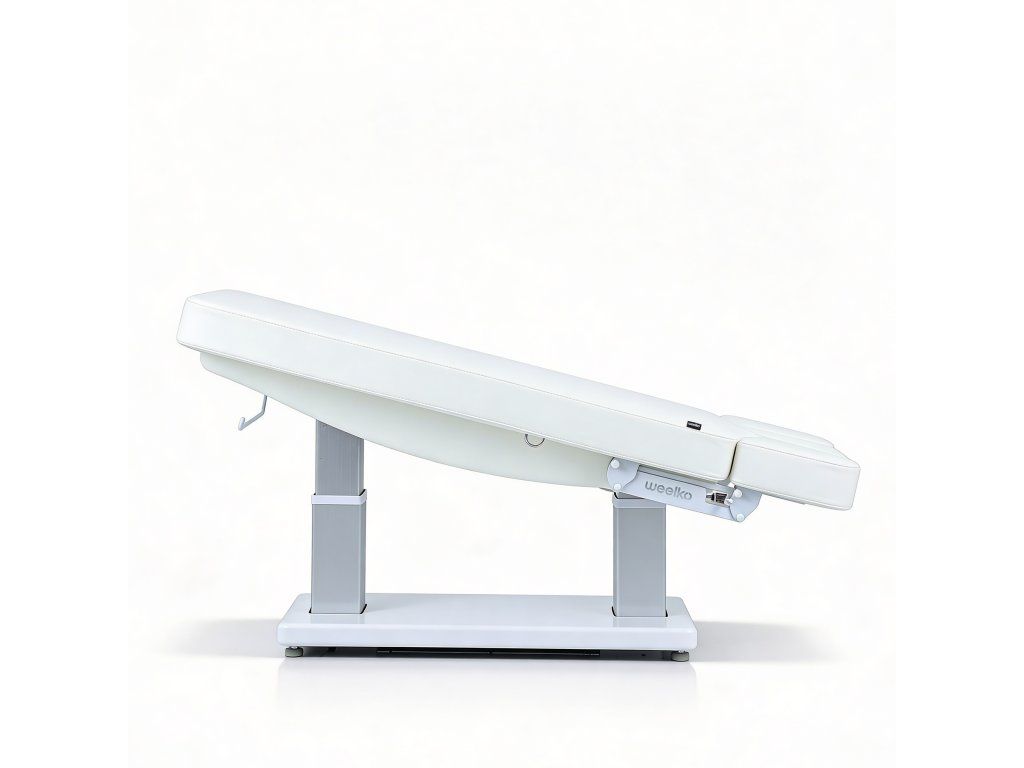 Elektrické nastavení výšky, opěradla a opěrky nohou s Trendelenburgovou, Anti-Trendelenburgovou a Antigravitační polohou. Rychlý sloupkový motor usnadňuje plynulé nastavení do více poloh a optimalizuje tak každodenní práci v kabině. Jednodílná třídílná matrace s polstrováním SuperSoft, navržená pro maximální pohodlí pacienta. Je vybavena zátkou pro otvor pro obličej a nezávisle nastavitelným systémem loketních opěrek, který zlepšuje relaxaci krční páteře během ošetření v poloze obličejem dolů. Ovládání ručním ovladačem s funkcí resetování a digitální obrazovkou pro přesné nastavení teploty. Čalouněná PU pěnou s vysokou hustotou a upevněná na elegantním bílém dřevěném podnoží.