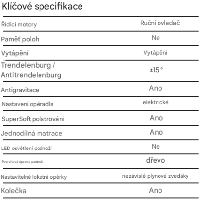 - Rychlejší sloupkový motor pro nastavení výšky a více poloh, včetně Tren- a Antitrendelenburgova.