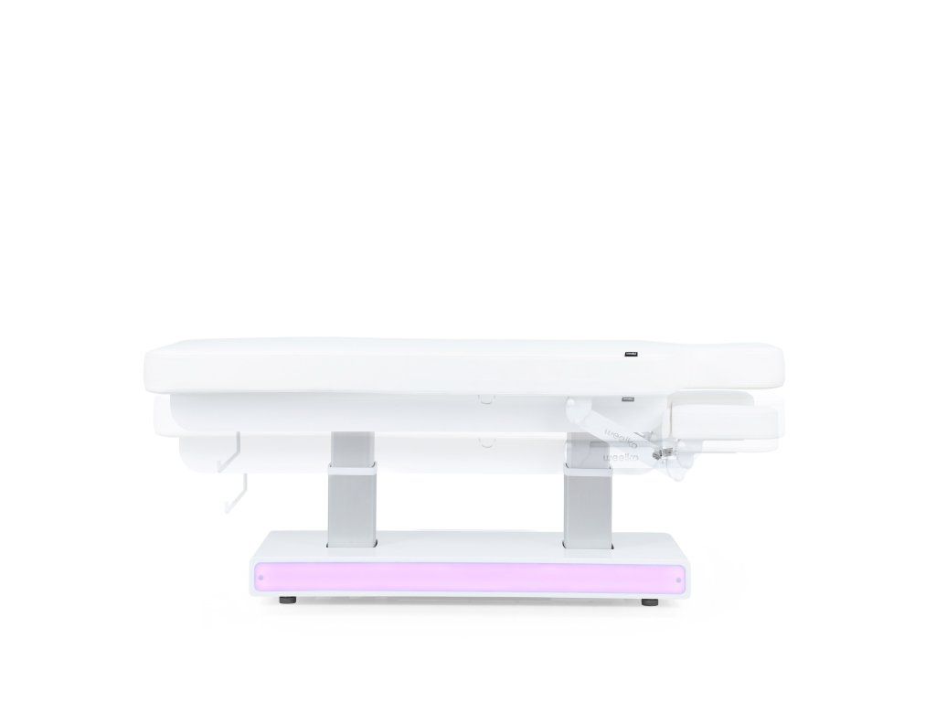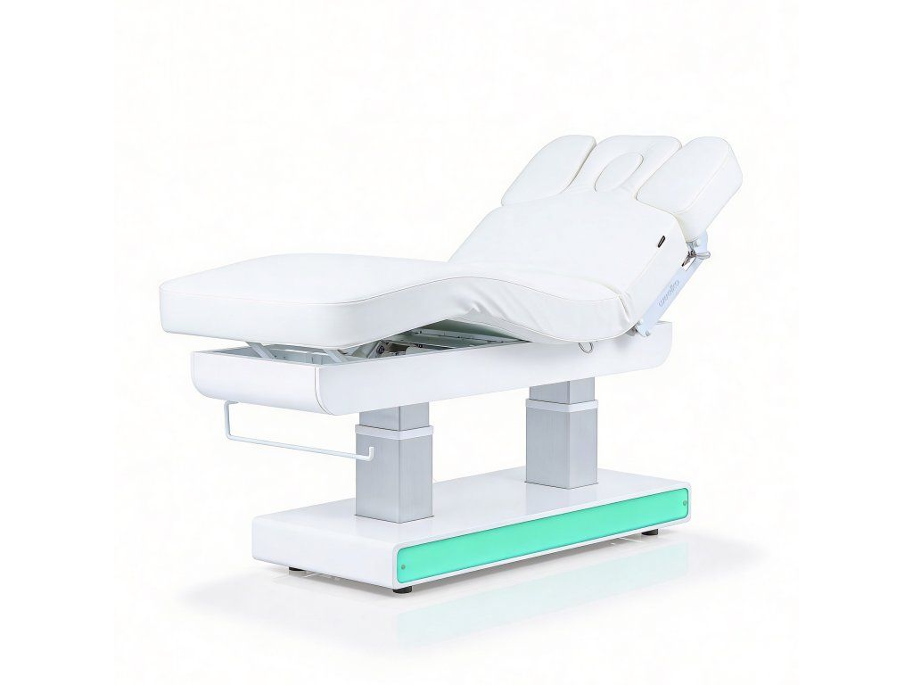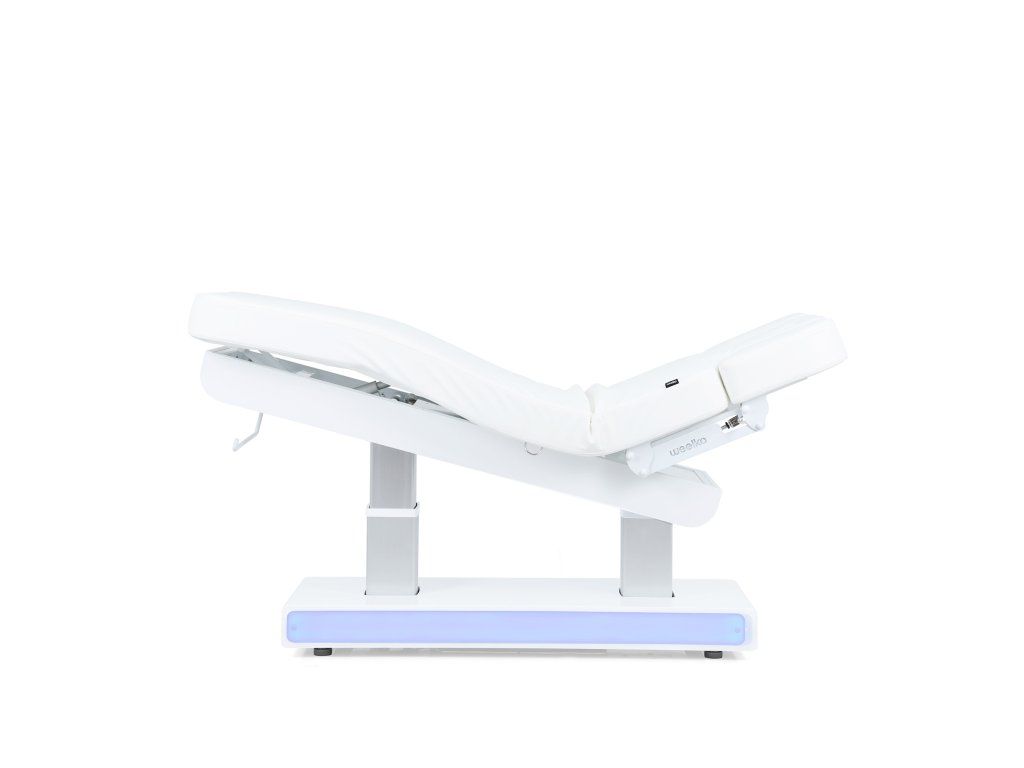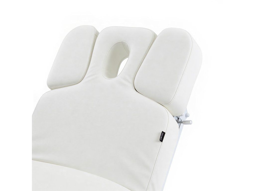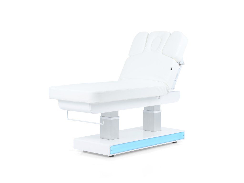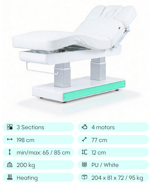 Je navržena pro maximální pohodlí a efektivitu v kabině a umožňuje elektrické nastavení výšky, opěradla a opěrky nohou s polohami Trendelenburg, Anti-Trendelenburg a Antigravity. Je vybavena jednodílnou třídílnou matrací se zátkou pro otvor pro obličej a zahrnuje nezávisle nastavitelný systém loketních opěrek, který je ideální pro zajištění maximální relaxace krční páteře během ošetření v poloze obličeje dolů. Základna je vyrobena ze dřeva s vysoce kvalitním bílým lakem a zahrnuje LED osvětlení s vyměnitelnými barvami pro vytvoření atmosféry přizpůsobené každému ošetření. Ovládání pomocí ručního ovladače s funkcí resetování, která usnadňuje přesné přizpůsobení každému ošetření a optimalizuje každodenní práci. Čalouněná PU pěnou s vysokou hustotou. Držák na role je součástí standardní výbavy.