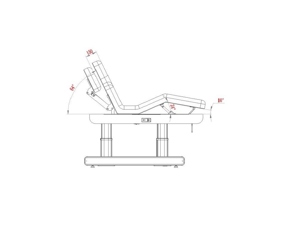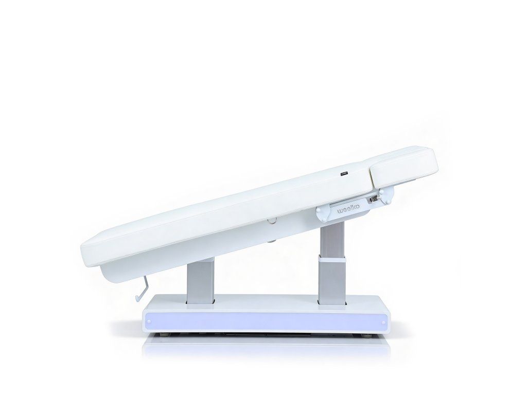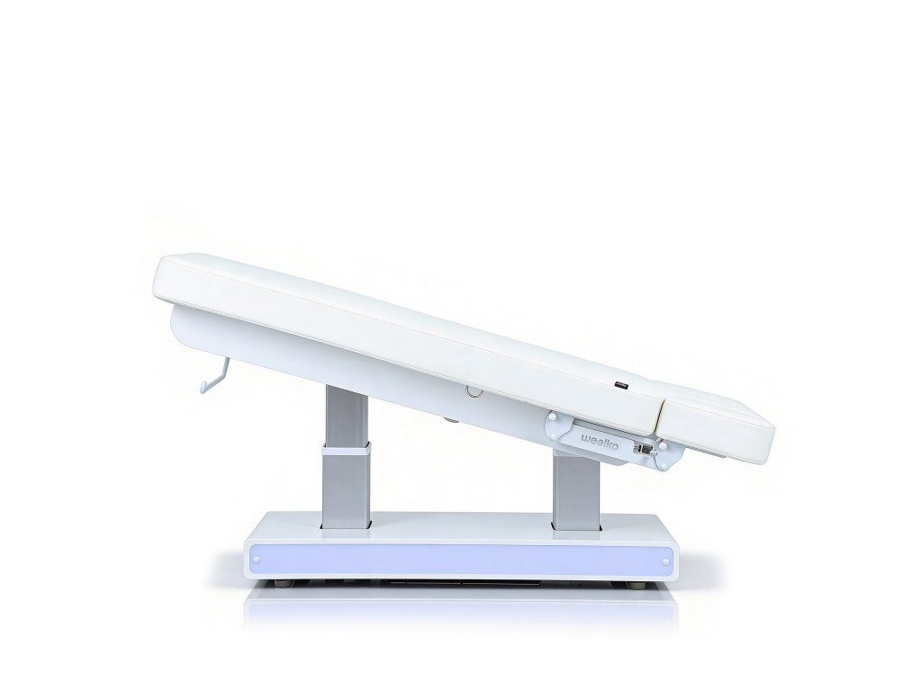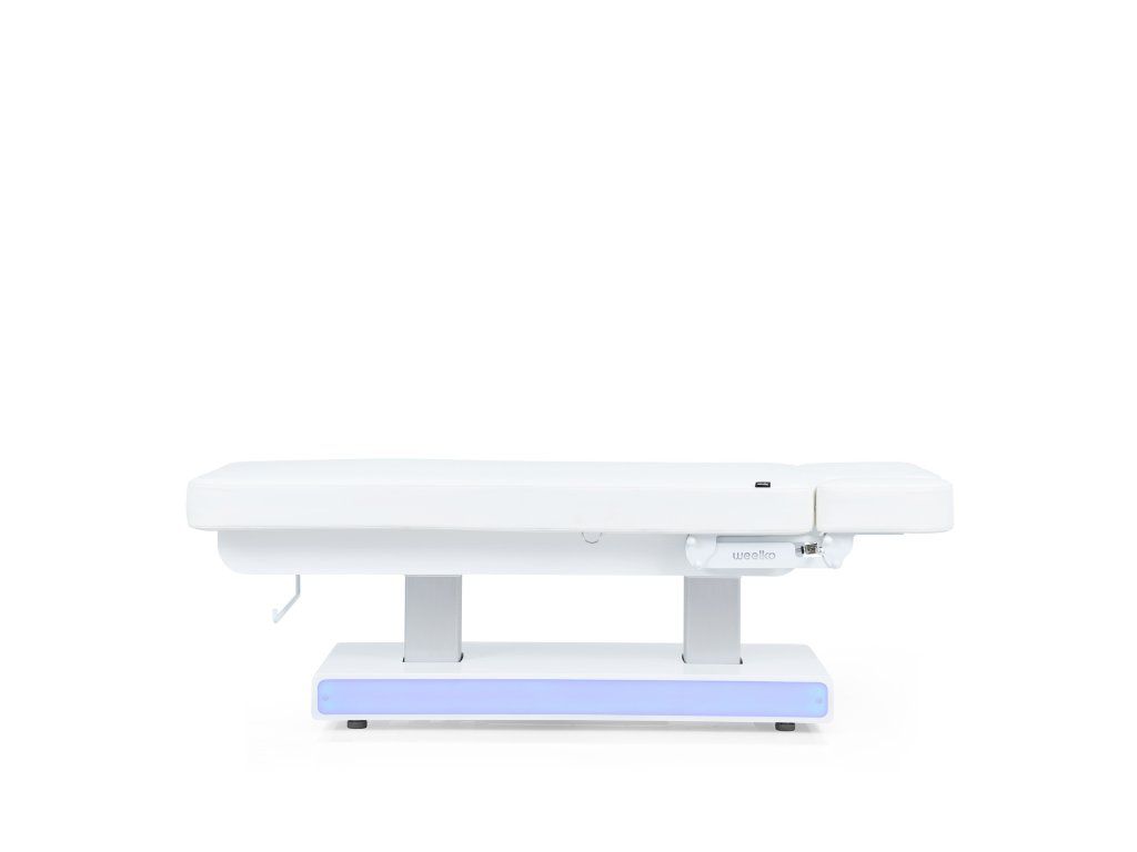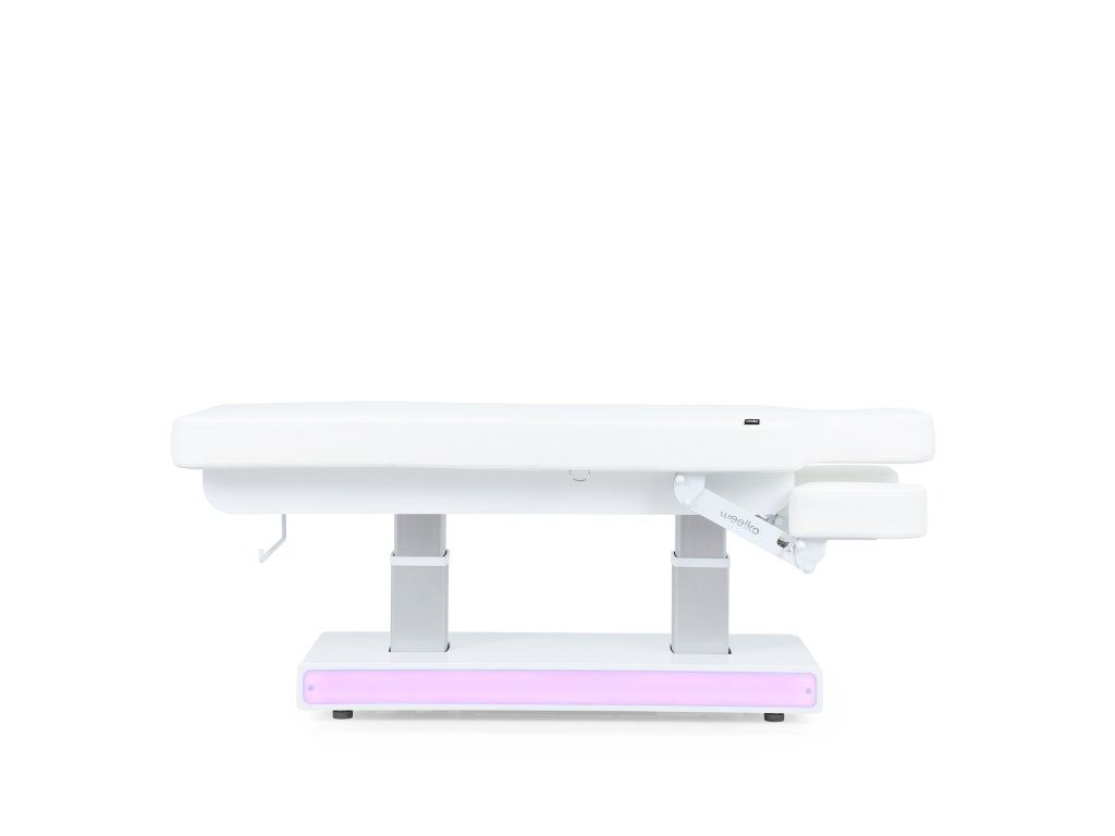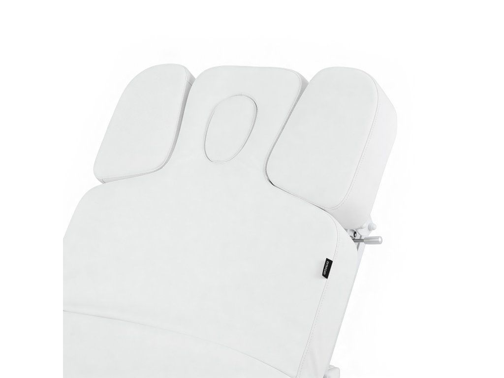 Je navržena pro maximální pohodlí a efektivitu v kabině a umožňuje elektrické nastavení výšky, opěradla a opěrky nohou s polohami Trendelenburg, Anti-Trendelenburg a Antigravity. Je vybavena jednodílnou třídílnou matrací se zátkou pro otvor pro obličej a zahrnuje nezávisle nastavitelný systém loketních opěrek, který je ideální pro zajištění maximální relaxace krční páteře během ošetření v poloze obličeje dolů. Základna je vyrobena ze dřeva s vysoce kvalitním bílým lakem a zahrnuje LED osvětlení s vyměnitelnými barvami pro vytvoření atmosféry přizpůsobené každému ošetření. Ovládání pomocí ručního ovladače s funkcí resetování, která usnadňuje přesné přizpůsobení každému ošetření a optimalizuje každodenní práci. Čalouněná PU pěnou s vysokou hustotou. Držák na role je součástí standardní výbavy.