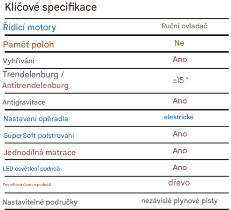 - Rychlý sloupkový motor pro nastavení výšky a více poloh, včetně Trendelenburgu a Anti-Trendelenburgu.