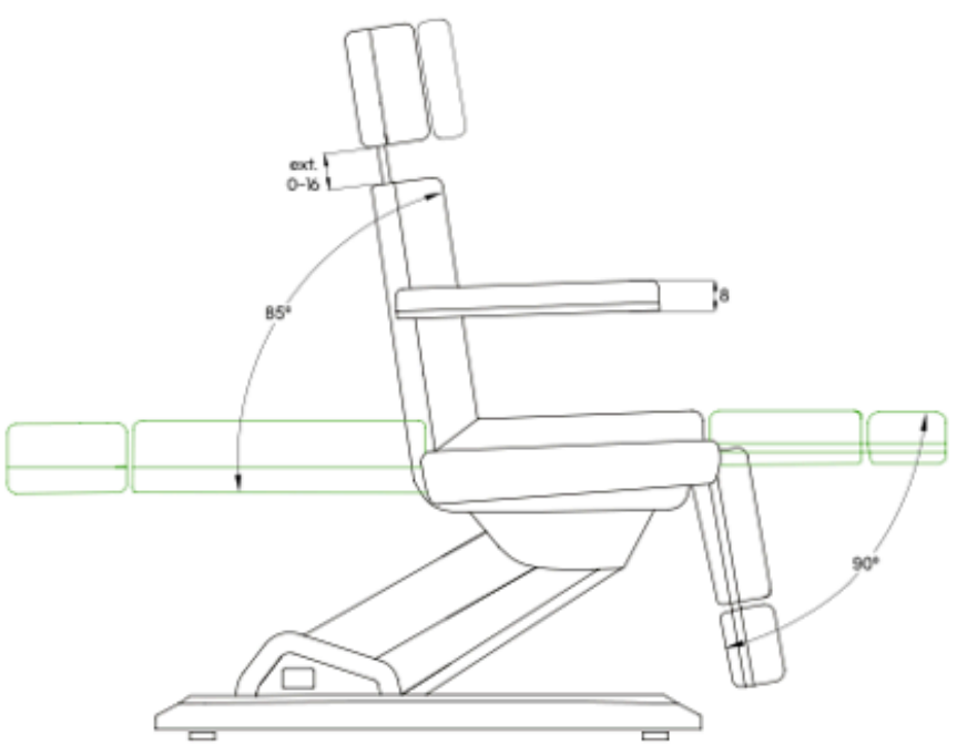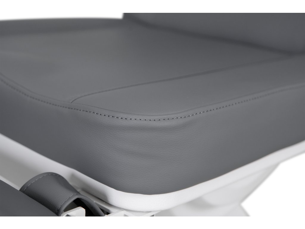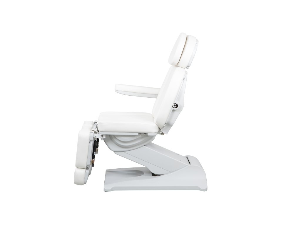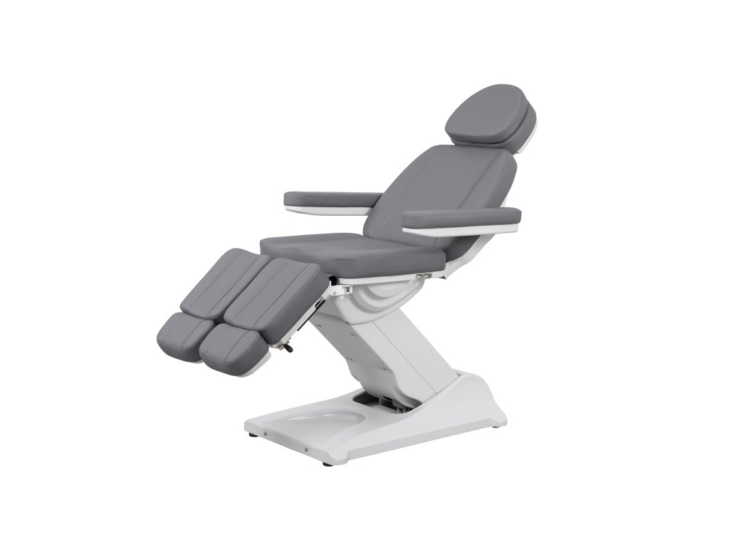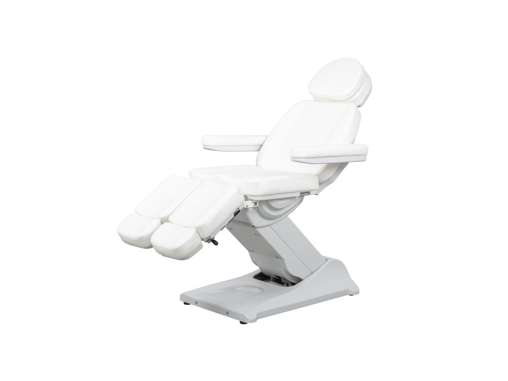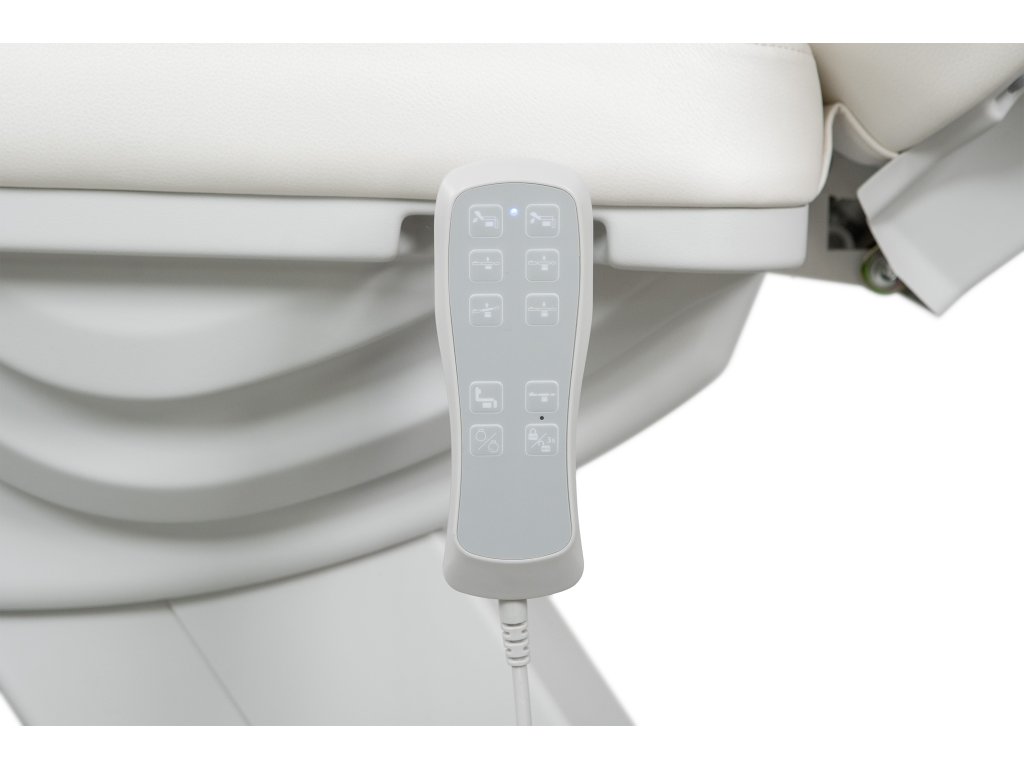Špičková pedikérská židle s velmi stabilní strukturou. Vybaveno 3 motory, které řídí výšku, opěradlo a sklon sedáku. Výškově nezávisle nastavitelné podnožky