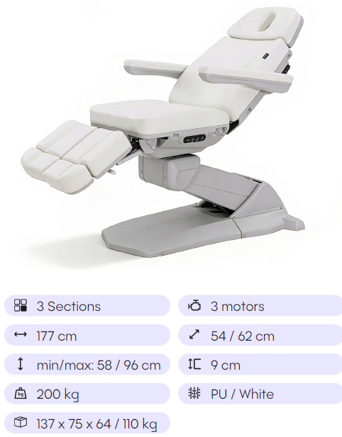 Elektrické nastavení výšky a opěradla s antigravitační funkcí. Kombinace pohybů v maximální výšce nabízí profesionálovi možnost pracovat ve stoje a vyniká také vynikající přístupností k sedadlu. Opěrka nohou je nezávisle nastavitelná pomocí plynového pístu a má boční otvor pro opěrky nohou, což je ideální pro pohodlné umístění hydromasážní vany a usnadnění přístupu profesionála k nohám klienta. 3-dílná matrace s výsuvnou částí pro hlavu a nohy, úhlově nastavitelná opěrka hlavy s konektorem pro otvor pro obličej. Skládací, odnímatelné a synchronizované loketní opěrky se sedadlem. Ovládání ručním ovladačem a integrovanými tlačítky s pamětí poloh. Čalouněno PU pěnou s vysokou hustotou.