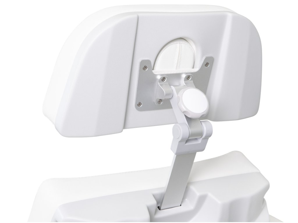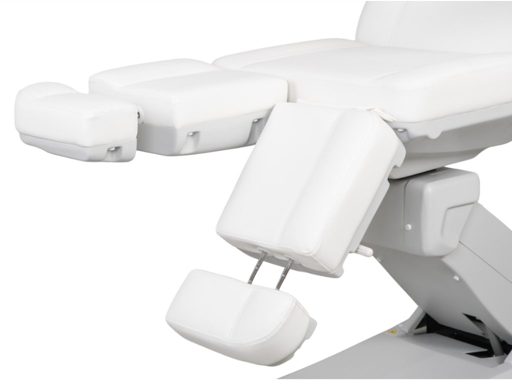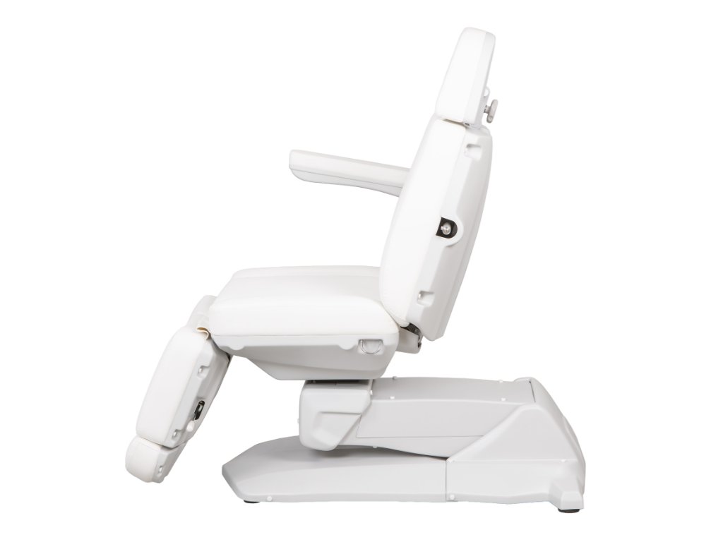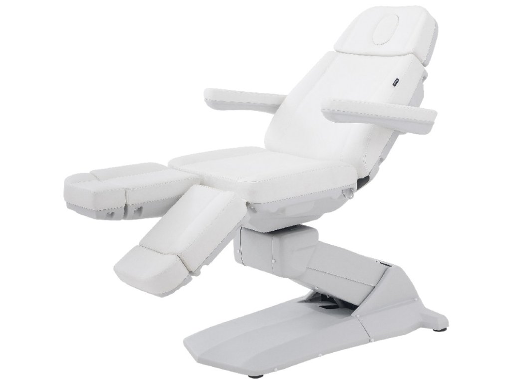 Moderní špičkové pedikérské křeslo s velmi stabilní konstrukcí. Vybaveno 3 motory, které ovládají výšku, sklon opěradla a úhel sedáku. Opěrky nohou jsou výškově nastavitelné nezávisle plynovým pístem. Skládací loketní opěrky a nastavitelná opěrka hlavy s otvorem pro obličej. Čalouněné vysoce kvalitní bílou PU, snadno se čistí.