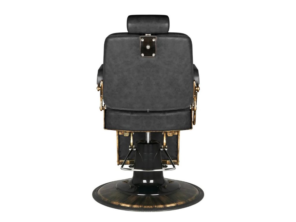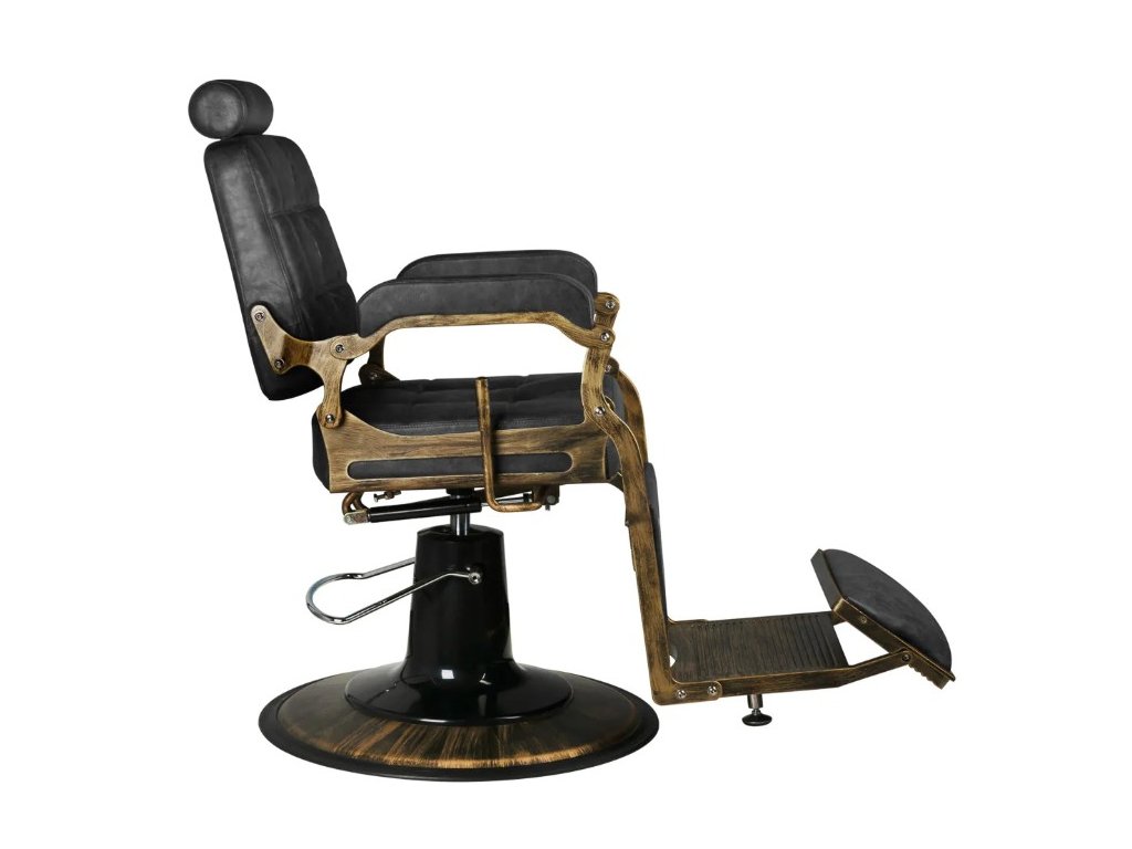 Holičské křeslo v retro stylu zaujme svým elegantním designem inspirovaným automobilovou klasikou. Pevná, kulatá základna zajišťuje stabilitu a pohodlí při používání. Sedák je vyplněn odolnou pěnou odolnou proti deformaci a čalouněn syntetickou kůží příjemnou na dotek, která zaručuje pohodlí a odolnost po mnoho let. Díky použitým materiálům je zařízení také odolné vůči vlhkosti a snadno se čistí. Prošívané čalounění v odstínu černé, vyrobené s důrazem na detail, zdůrazňuje luxusní charakter nábytku. Stylizované kovové područky a rám v odstínu starozlata dodávají celku jedinečný charakter.