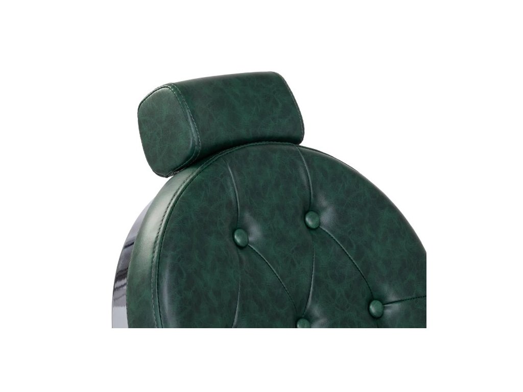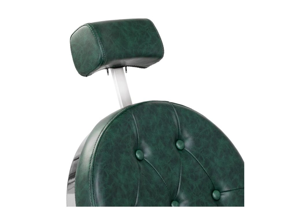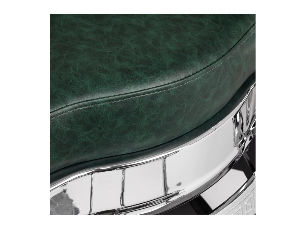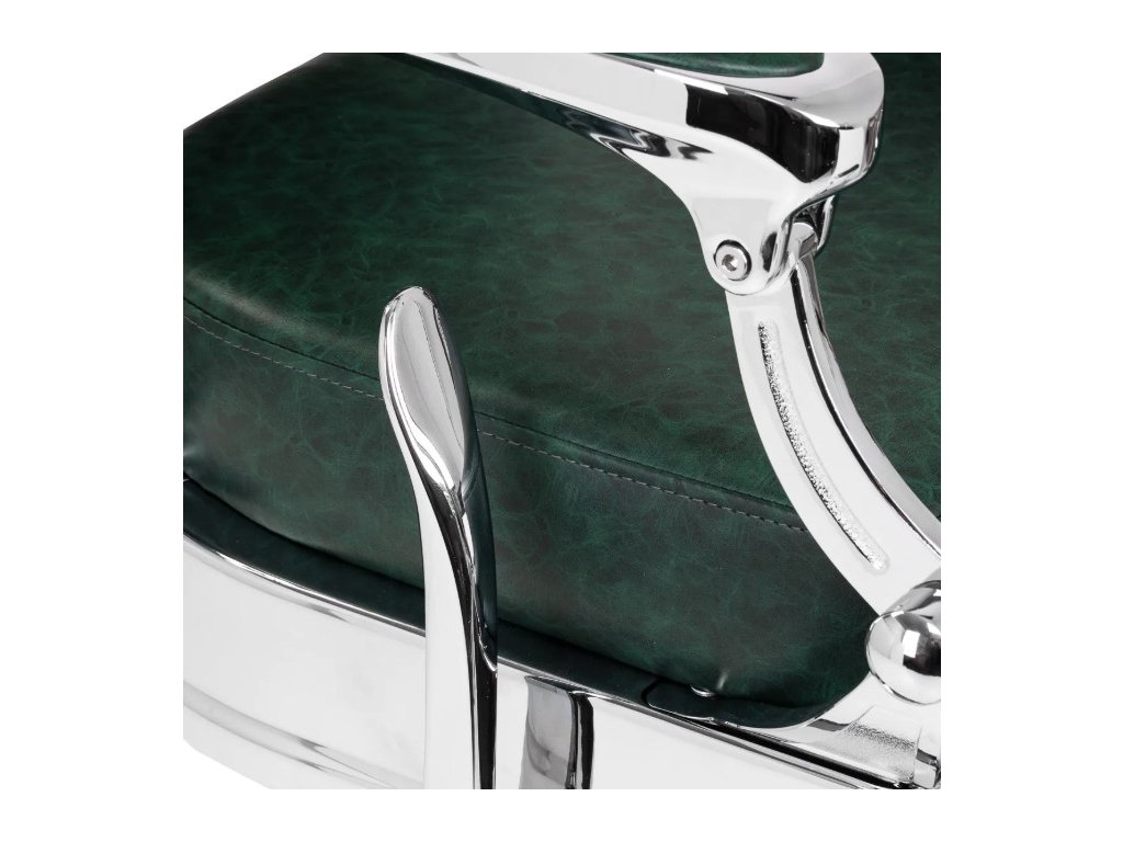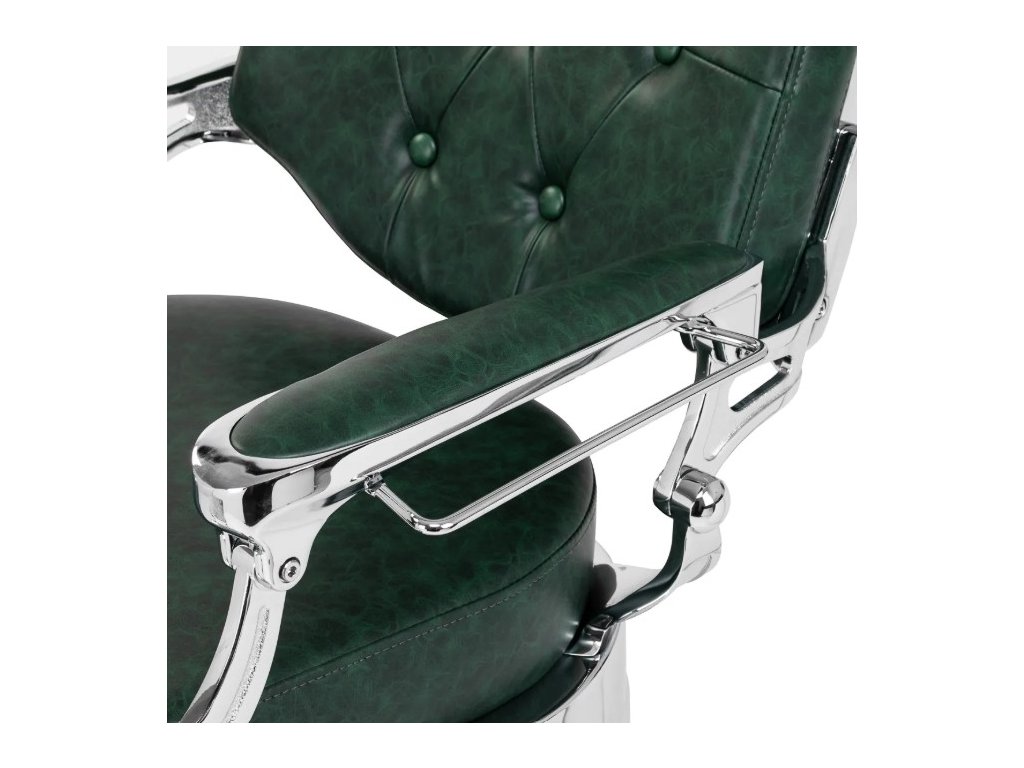 Pevná konstrukce základny zajišťuje stabilitu a vysoký komfort používání. Výplň sedáku z odolné pěny odolné proti deformaci a čalounění z na dotek příjemné syntetické kůže s polomatnou povrchovou úpravou zajišťují odolnost nábytku a jeho pohodlné používání po dlouhou dobu. Díky nim je zařízení také odolné proti vlhkosti, trvanlivé a snadno se čistí. Potah v odstínech zelené s prošíváním a ozdobnými knoflíky mu dodává jedinečný charakter. Křeslo s charakteristickým designem, odkazujícím na vintage styl, dokonale zapadá do atmosféry holičských salonů a zdůrazňuje jejich jedinečnou atmosféru.