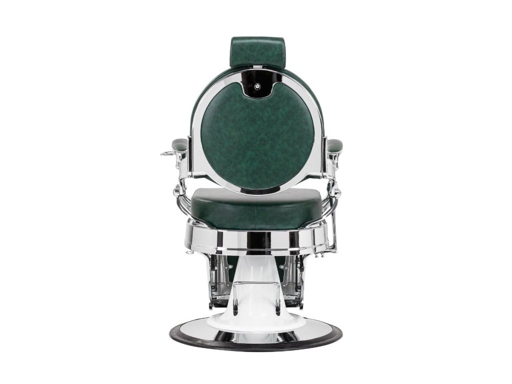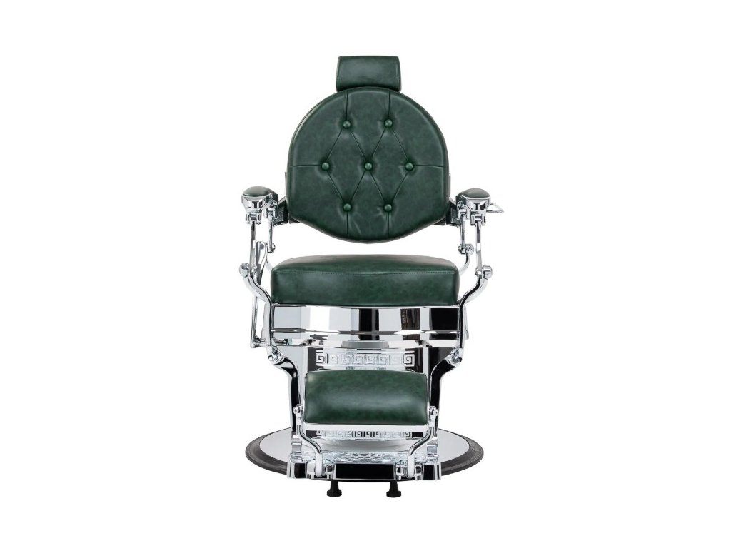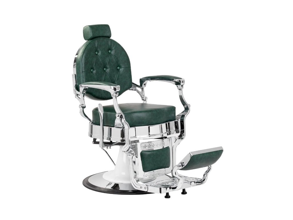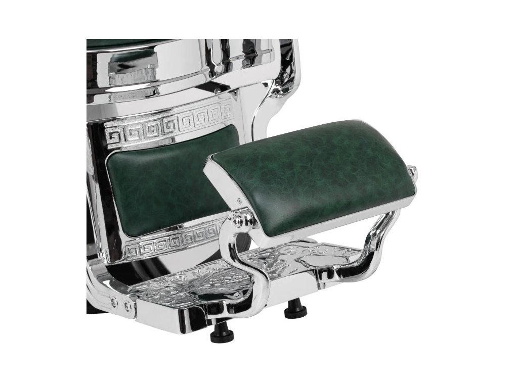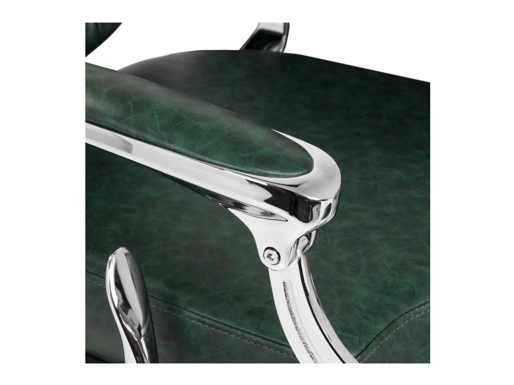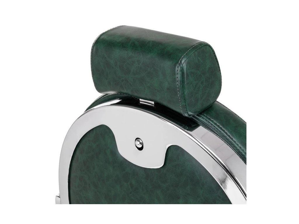 Pevná konstrukce základny zajišťuje stabilitu a vysoký komfort používání. Výplň sedáku z odolné pěny odolné proti deformaci a čalounění z na dotek příjemné syntetické kůže s polomatnou povrchovou úpravou zajišťují odolnost nábytku a jeho pohodlné používání po dlouhou dobu. Díky nim je zařízení také odolné proti vlhkosti, trvanlivé a snadno se čistí. Potah v odstínech zelené s prošíváním a ozdobnými knoflíky mu dodává jedinečný charakter. Křeslo s charakteristickým designem, odkazujícím na vintage styl, dokonale zapadá do atmosféry holičských salonů a zdůrazňuje jejich jedinečnou atmosféru.