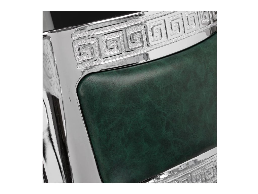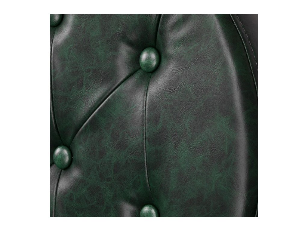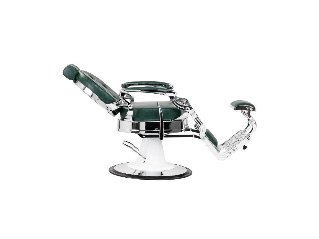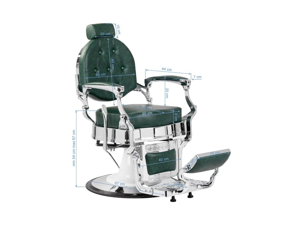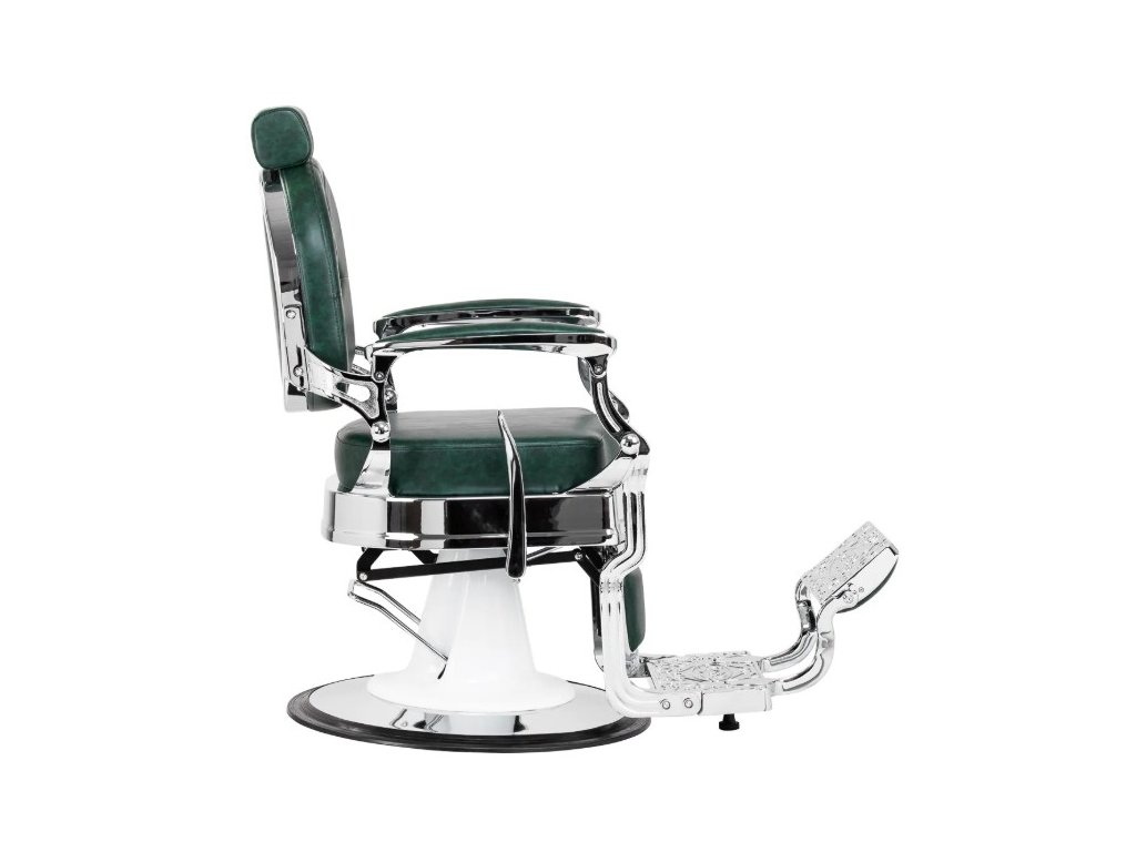 Pevná konstrukce základny zajišťuje stabilitu a vysoký komfort používání. Výplň sedáku z odolné pěny odolné proti deformaci a čalounění z na dotek příjemné syntetické kůže s polomatnou povrchovou úpravou zajišťují odolnost nábytku a jeho pohodlné používání po dlouhou dobu. Díky nim je zařízení také odolné proti vlhkosti, trvanlivé a snadno se čistí. Potah v odstínech zelené s prošíváním a ozdobnými knoflíky mu dodává jedinečný charakter. Křeslo s charakteristickým designem, odkazujícím na vintage styl, dokonale zapadá do atmosféry holičských salonů a zdůrazňuje jejich jedinečnou atmosféru.