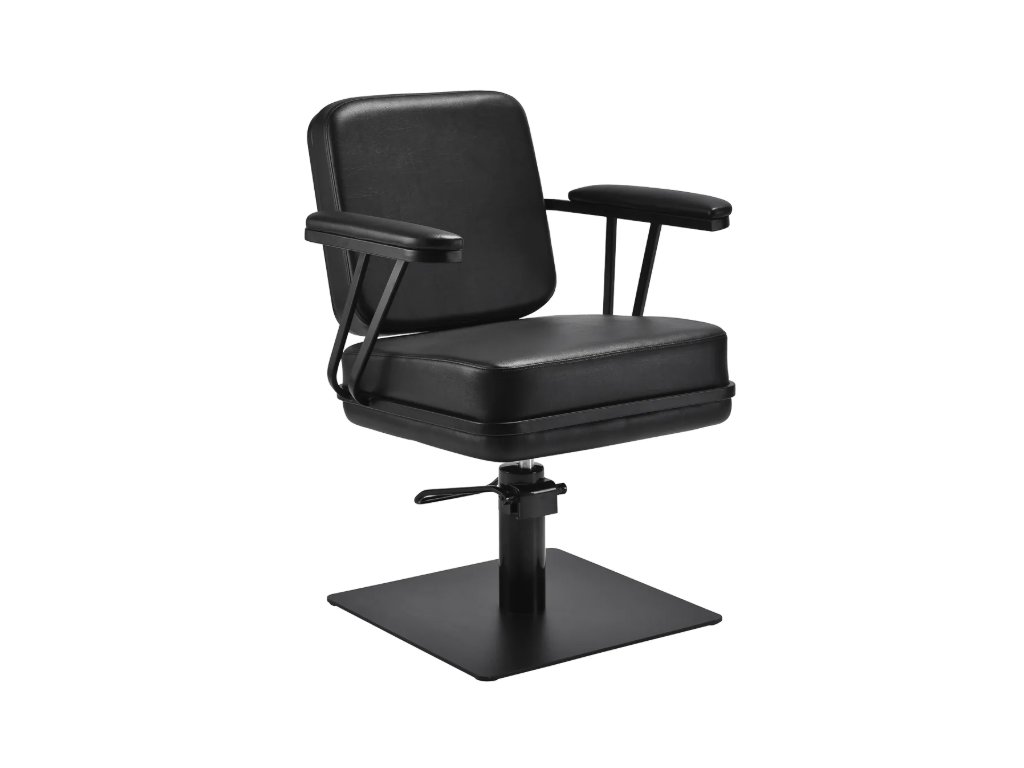 Profilované křeslo poskytuje oporu bederní páteře a vysoký komfort používání, zatímco čalouněné područky umožňují správné umístění ramen zákazníka. Stabilní čtvercová základna v matné černé barvě podtrhuje stylový vzhled a příjemná na dotek syntetická kůže v odstínech černé zaručuje pohodlí při dlouhých procedurách, odolnost, odolnost proti vlhkosti a snadné čištění. Moderní design dodává interiéru jedinečný charakter a křeslo se hodí jak do moderních, tak do klasických interiérů, kde podtrhuje profesionální image salonu.