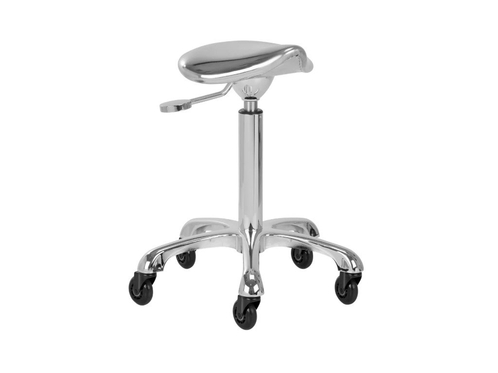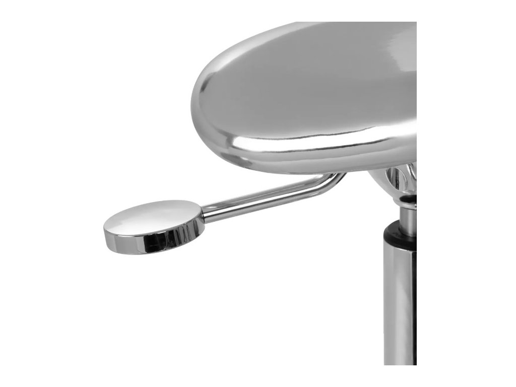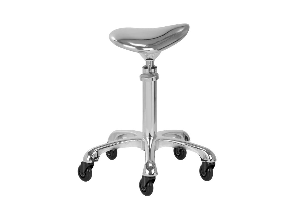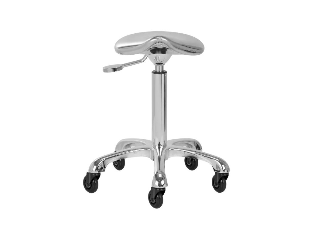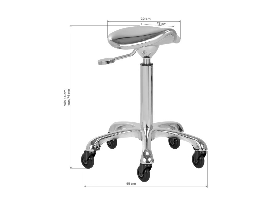 Jedinečný vzhled stoličky je nezapomenutelný, vypadá mimořádně elegantně a bude stylovým prvkem každého interiéru. Je ideální jak pro kadeřnictví, tak pro kosmetické salony. Chromovaný rám a stabilní pětiramenná základna spolu s gumovými koly zajišťují bezpečné používání, značnou mobilitu a schopnost přizpůsobit se vlastním potřebám. Sedák správně tvarovaný do tvaru sedla, vyplněný pěnou, která není náchylná k deformaci, zaručuje pohodlí pro uživatele. Potah vyrobený z lesklé syntetické kůže ve stříbrných tónech se snadno čistí, má dlouhou životnost a je odolný vůči vlhkosti.