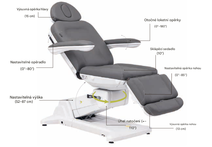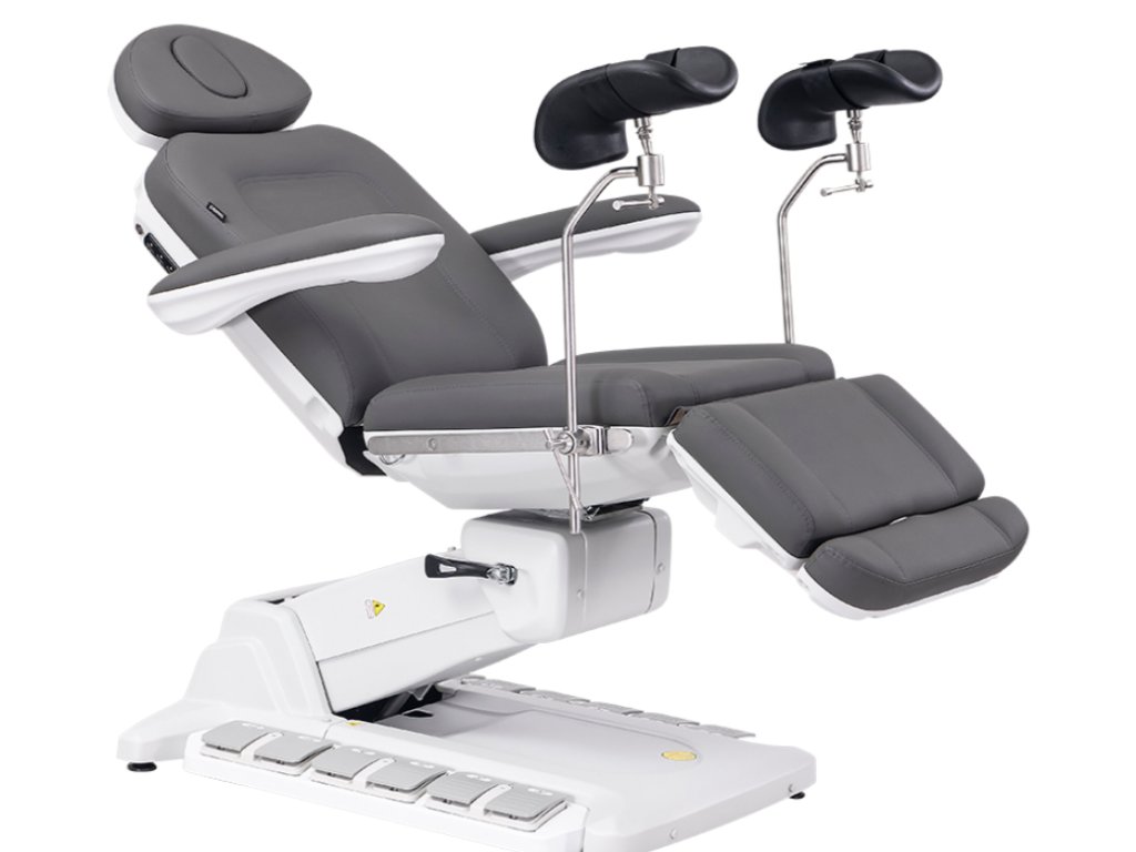 Luxusní gynekologické křeslo s velmi stabilní konstrukcí speciálně navrženou pro optimalizaci pracovního prostoru díky rotaci o 120°.