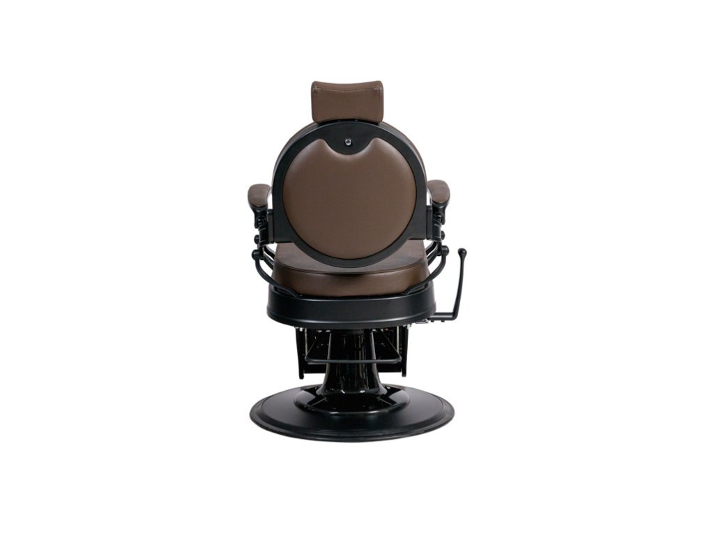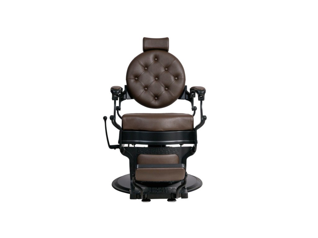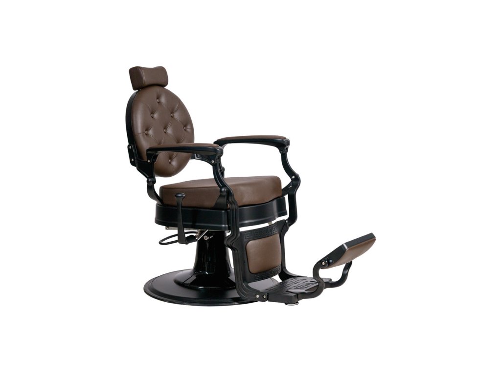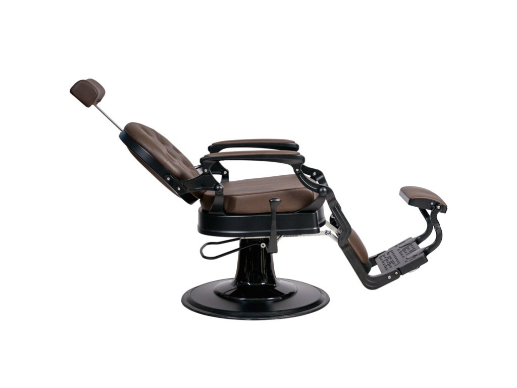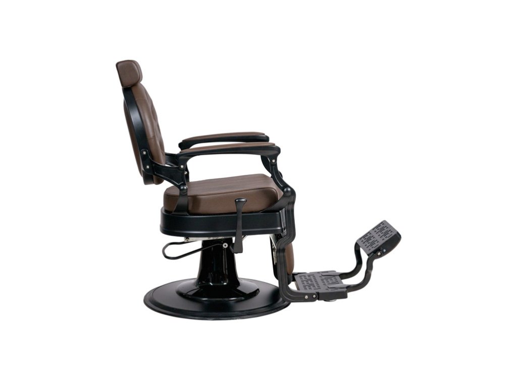 Sofistikované holičské křeslo s celokovovým rámem ze vstřikovaného hliníku. Kulatá základna a kompletní struktura s matnou černou povrchovou úpravou. Oboustranná podnožka. Vysoce kvalitní hydraulické čerpadlo. Sedák s pěnou s vysokou hustotou pro maximální pohodlí a odolnost. Tmavě hnědé čalounění.