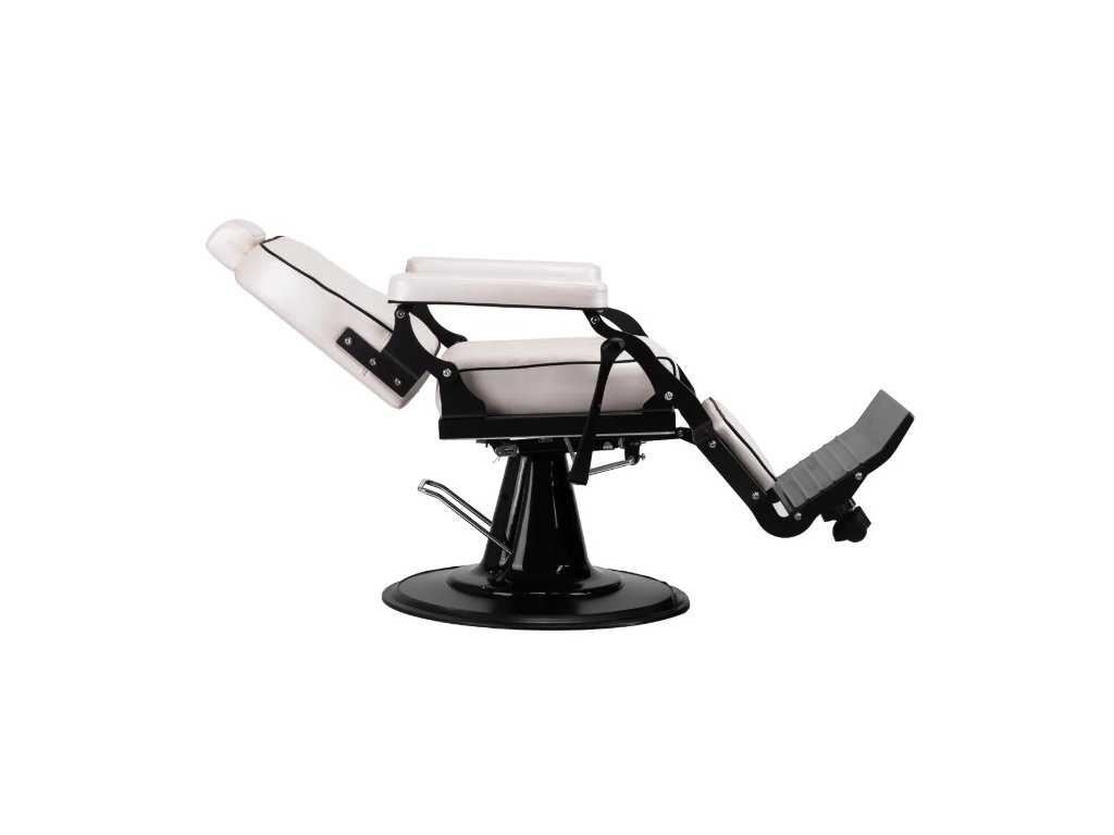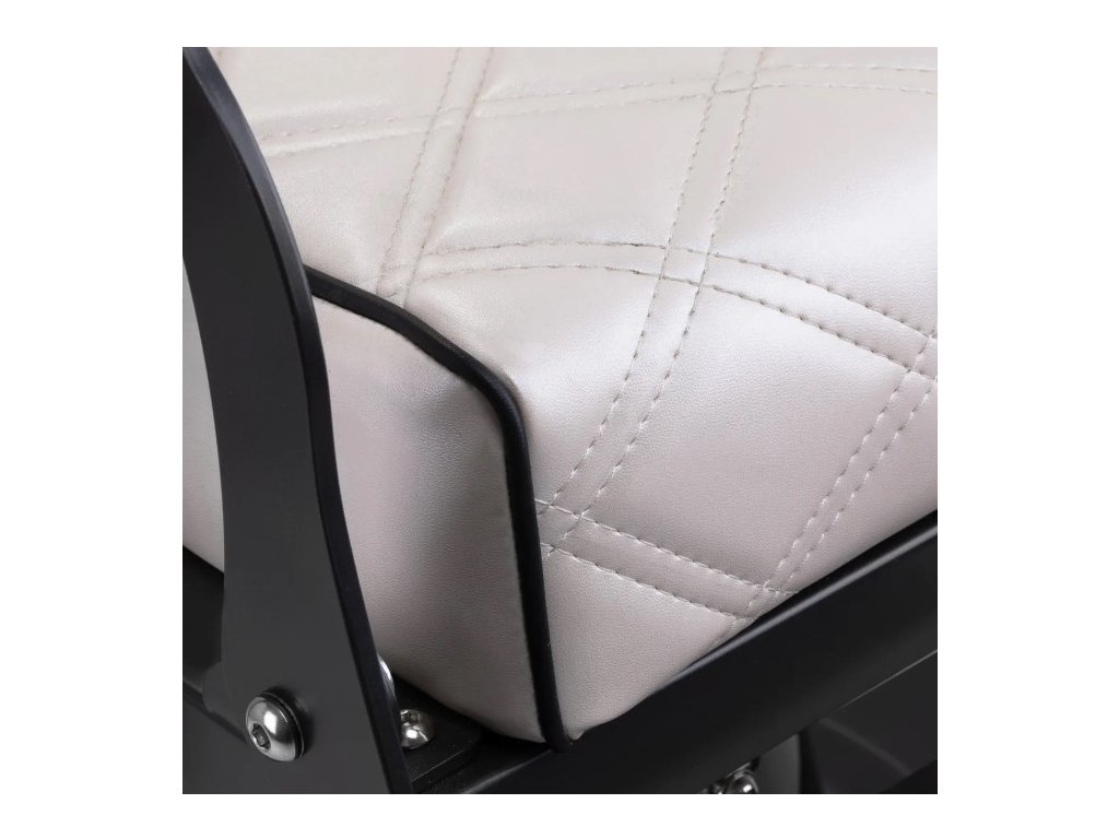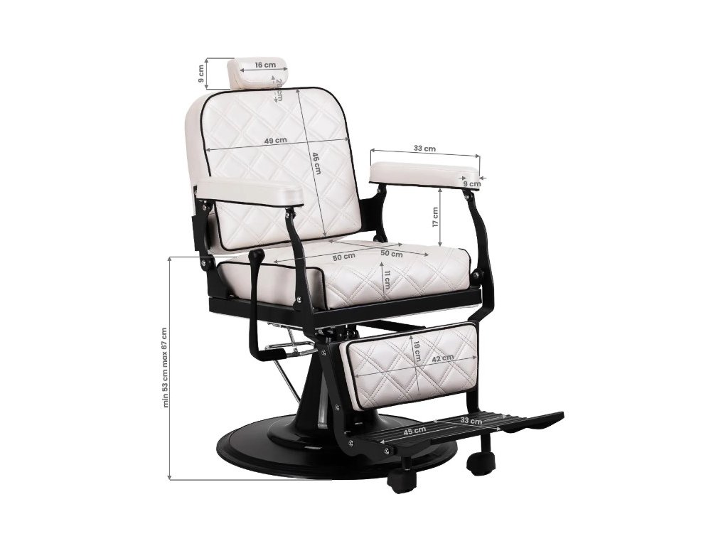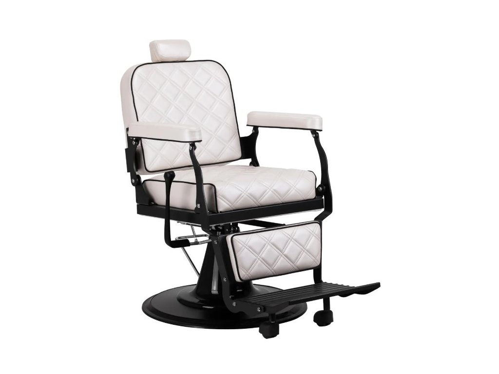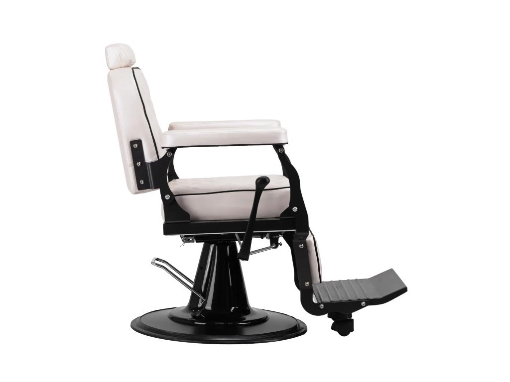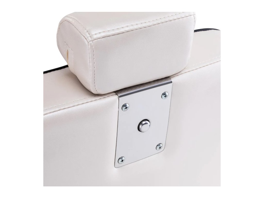 Pevná základna zajišťuje stabilitu a vysoký komfort používání. Výplň sedáku z pěny odolné proti deformaci a čalounění z na dotek příjemné syntetické kůže s perleťovou povrchovou úpravou zajišťují odolnost nábytku a pohodlné používání po dlouhou dobu. Tyto materiály jsou odolné proti vlhkosti, odolné proti opotřebení a snadno se čistí. Krémový odstín čalounění dodává křeslu jedinečný charakter a jeho elegantní styl dokonale ladí s dekorem holičských salonů.