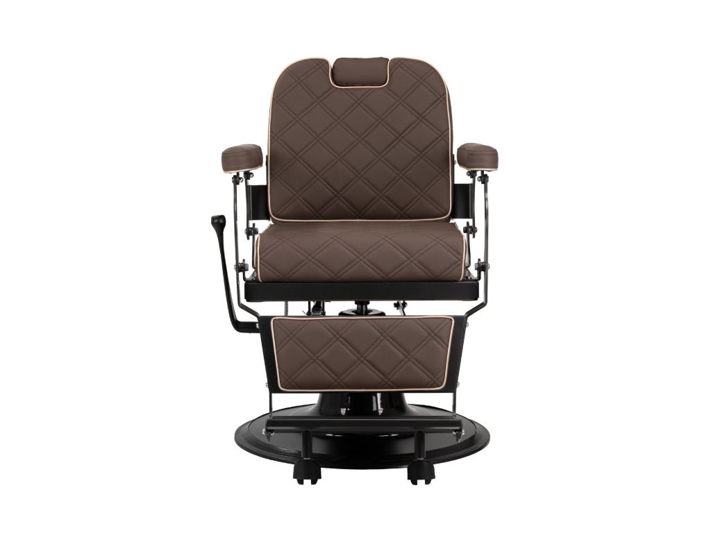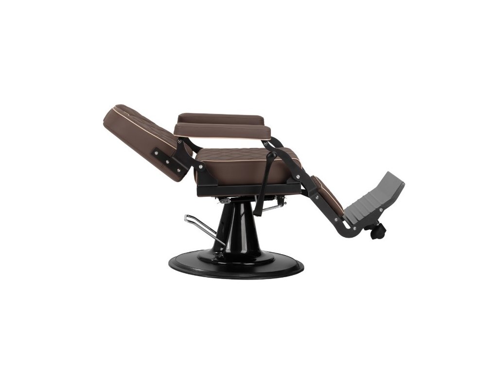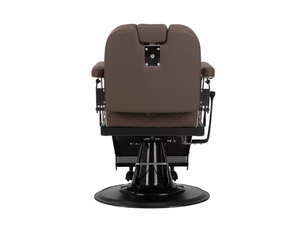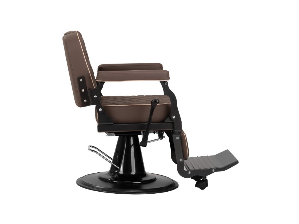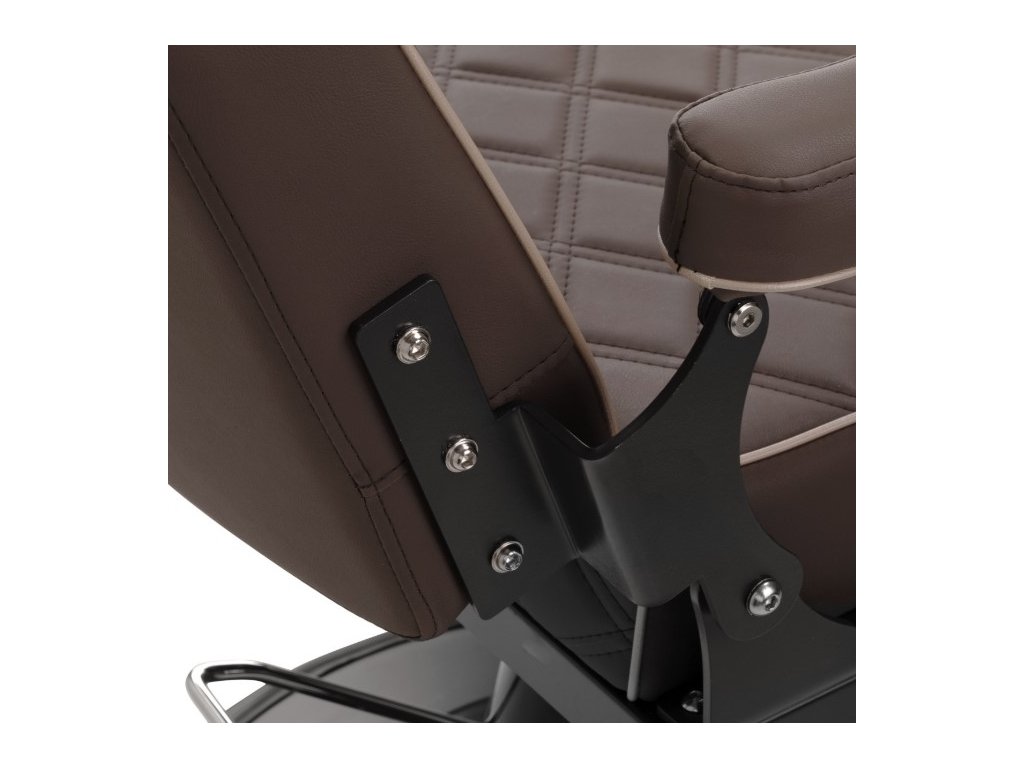 Pevná konstrukce zajišťuje stabilitu a vysoký komfort používání. Sedák je vyplněn pěnou odolnou proti deformacím a čalounění z měkké, matné syntetické kůže dodává nábytku odolnost a pohodlí. Materiály odolné proti vlhkosti jsou nejen trvanlivé, ale také se snadno čistí. Hnědý odstín čalounění dodává křeslu jedinečný charakter a jeho elegantní styl se dokonale hodí k dekoru každého holičského salonu.