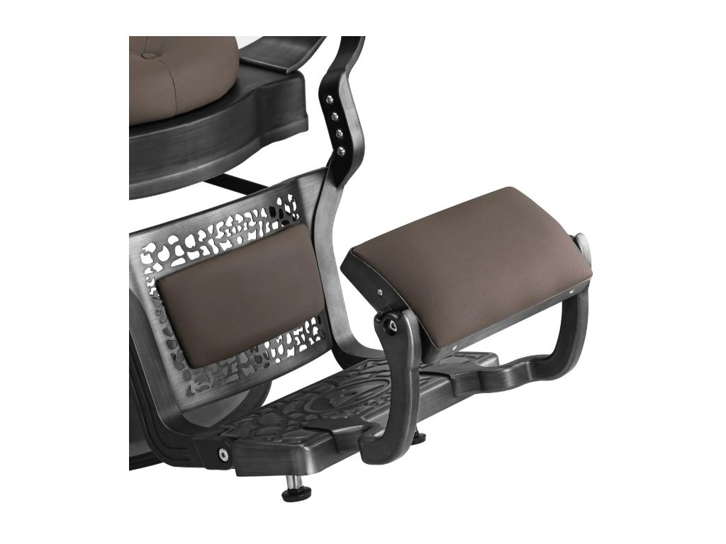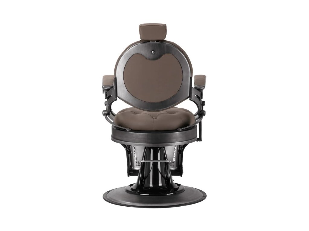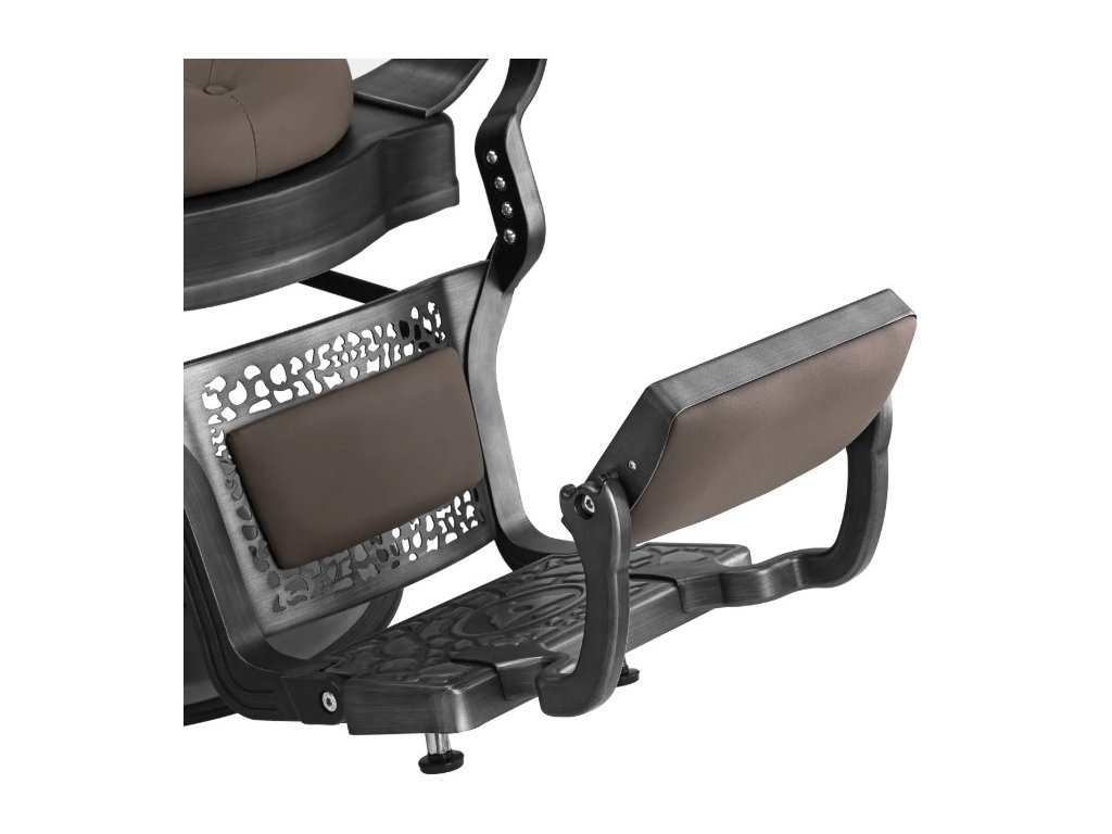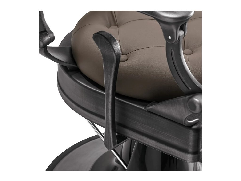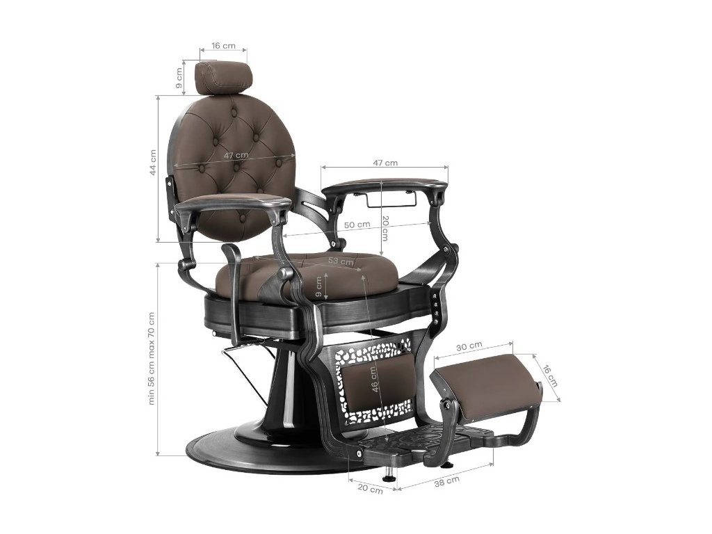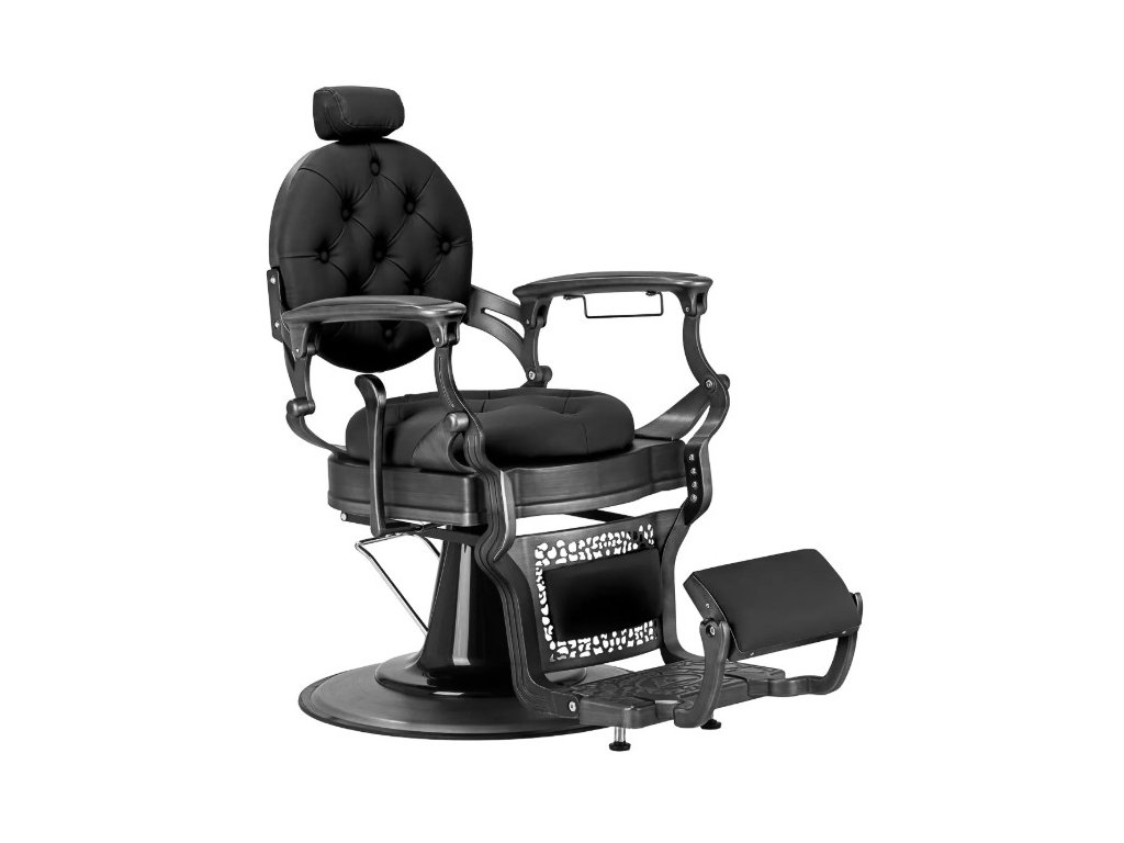 Pevná konstrukce základny zajišťuje stabilitu a vysoký komfort používání. Výplň sedáku z odolné pěny odolné proti deformaci a čalounění z na dotek příjemné syntetické kůže s matnou povrchovou úpravou zajišťují odolnost nábytku a jeho pohodlné používání po dlouhou dobu. Díky použitým materiálům je zařízení také odolné proti vlhkosti, trvanlivé a snadno se čistí. Potah v odstínech černé s prošíváním a ozdobnými knoflíky a zdobená podnožka mu dodávají jedinečný charakter. Křeslo s charakteristickým designem, odkazujícím na vintage styl, dokonale zapadá do atmosféry holičských salonů a zdůrazňuje jejich jedinečnou atmosféru.