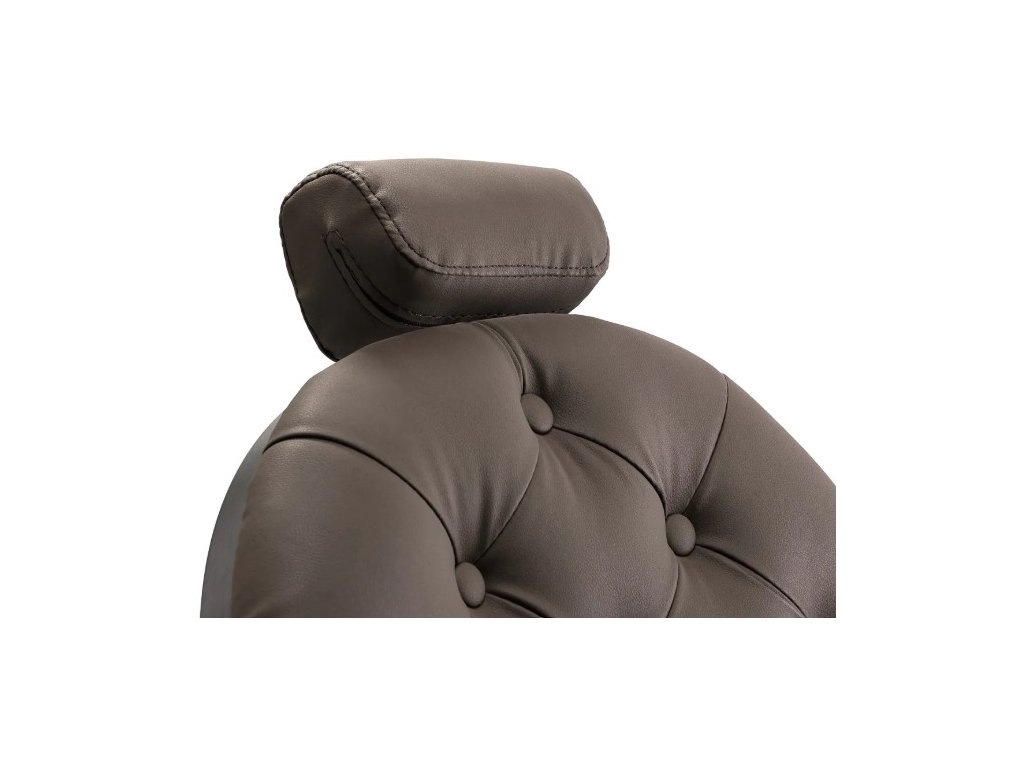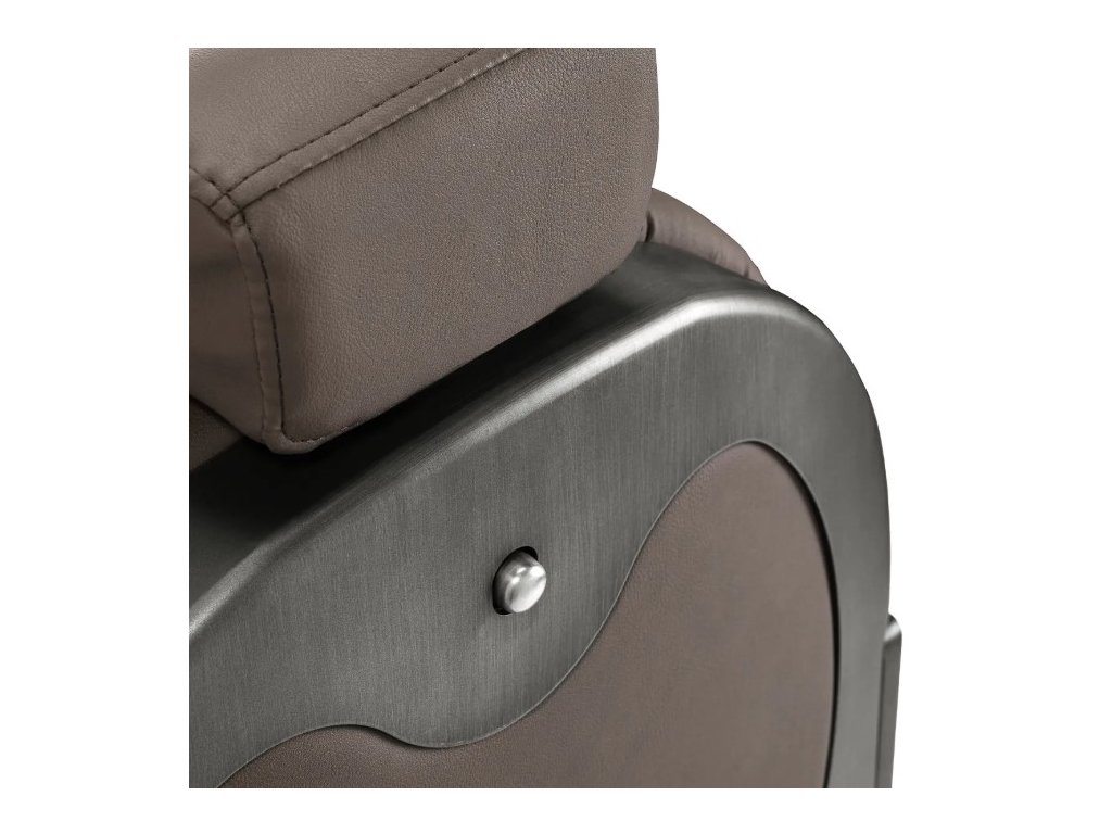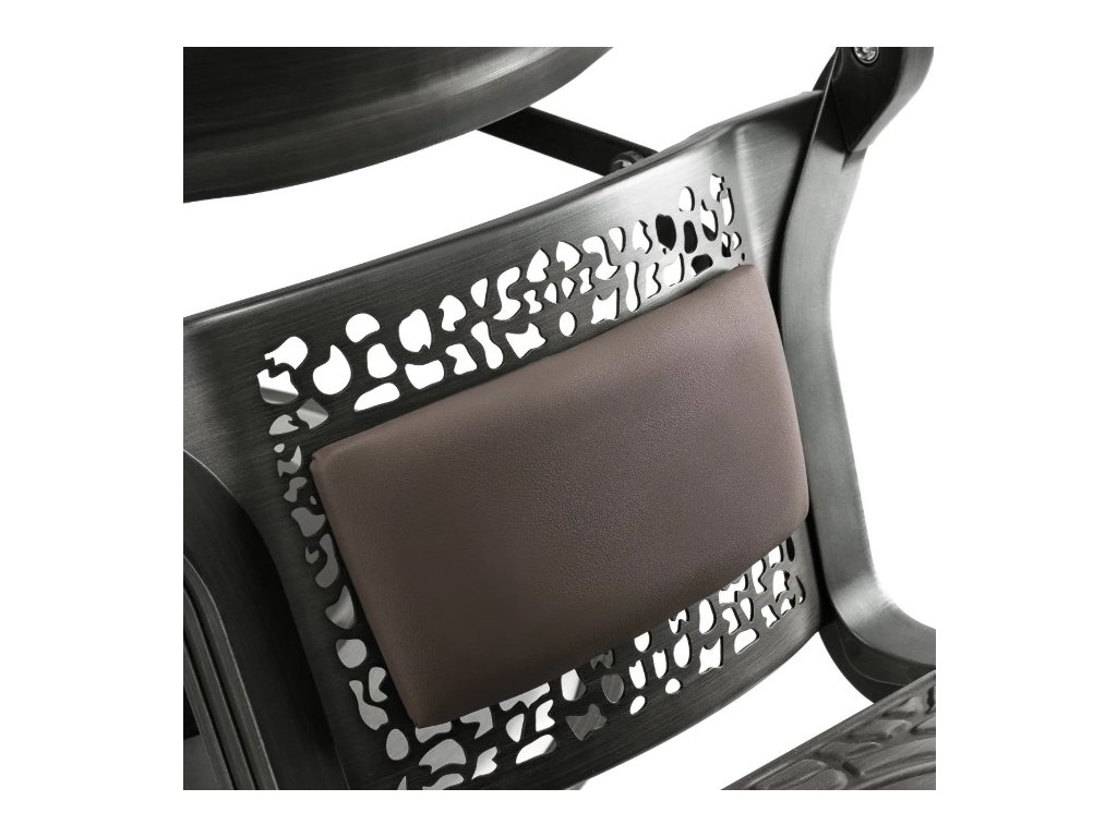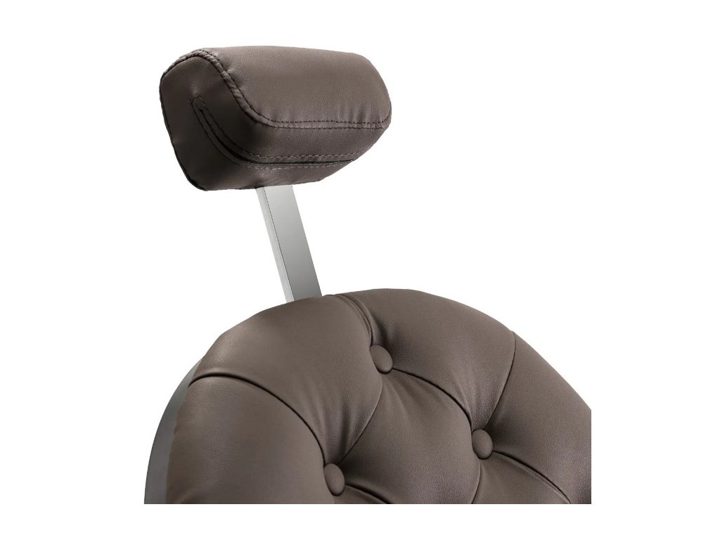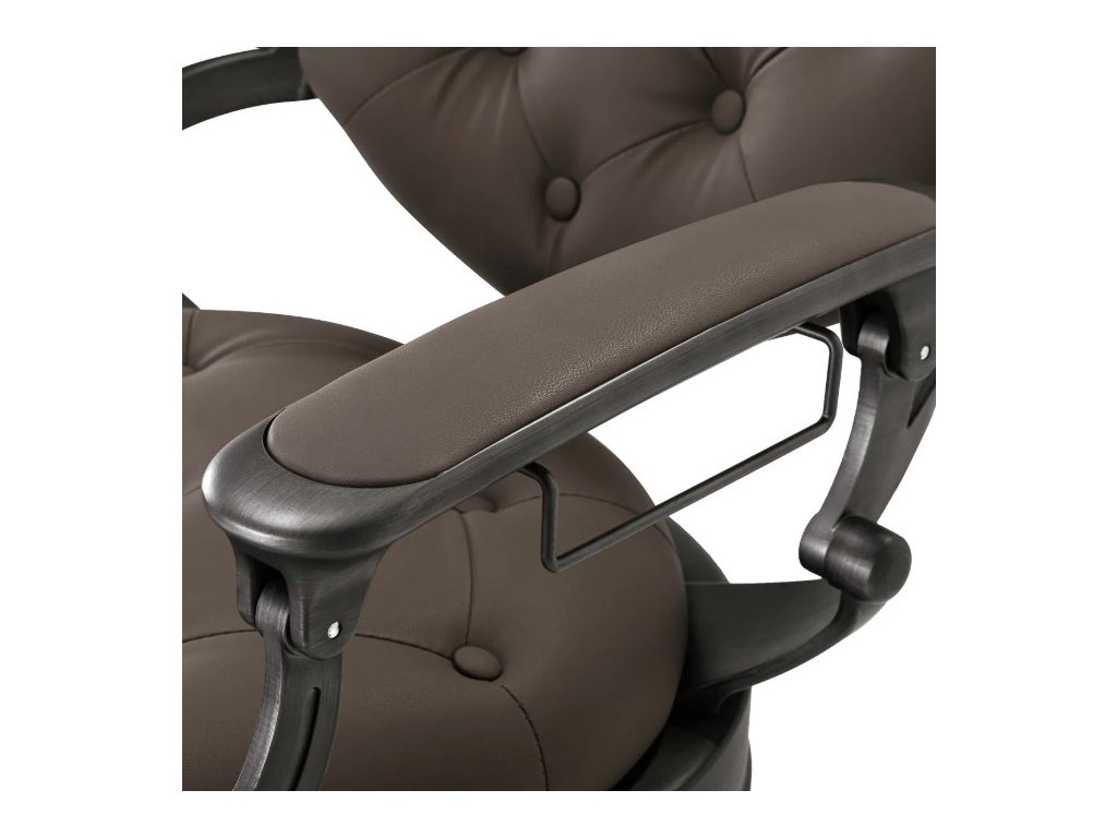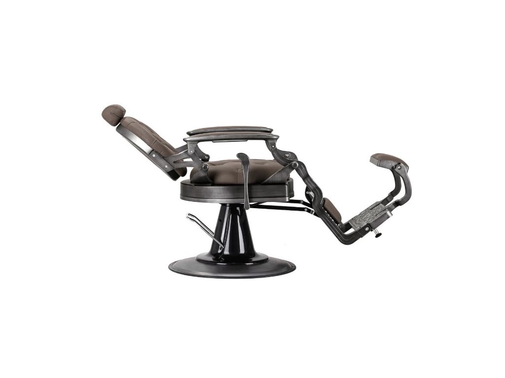 Pevná konstrukce základny zajišťuje stabilitu a vysoký komfort používání. Výplň sedáku z odolné pěny odolné proti deformaci a čalounění z na dotek příjemné syntetické kůže s matnou povrchovou úpravou zajišťují odolnost nábytku a jeho pohodlné používání po dlouhou dobu. Díky použitým materiálům je zařízení také odolné proti vlhkosti, trvanlivé a snadno se čistí. Potah v odstínech černé s prošíváním a ozdobnými knoflíky a zdobená podnožka mu dodávají jedinečný charakter. Křeslo s charakteristickým designem, odkazujícím na vintage styl, dokonale zapadá do atmosféry holičských salonů a zdůrazňuje jejich jedinečnou atmosféru.