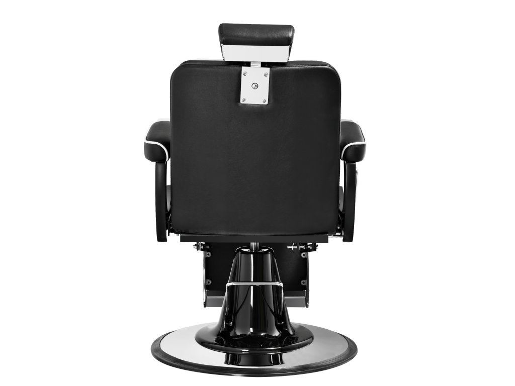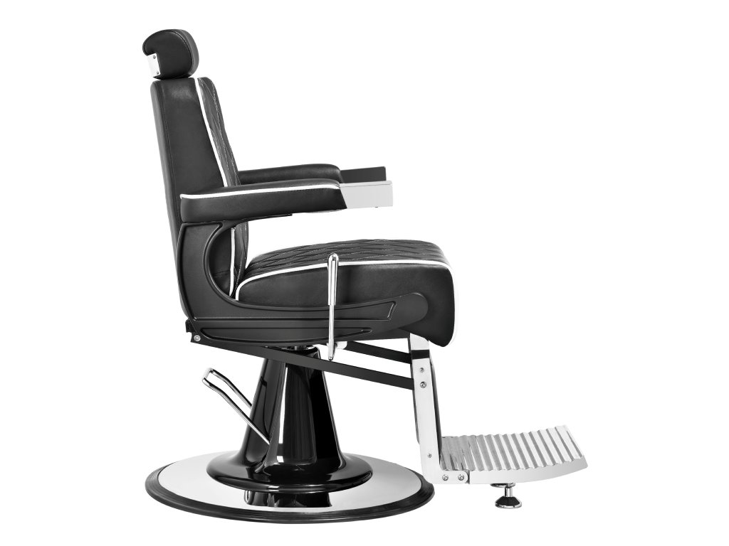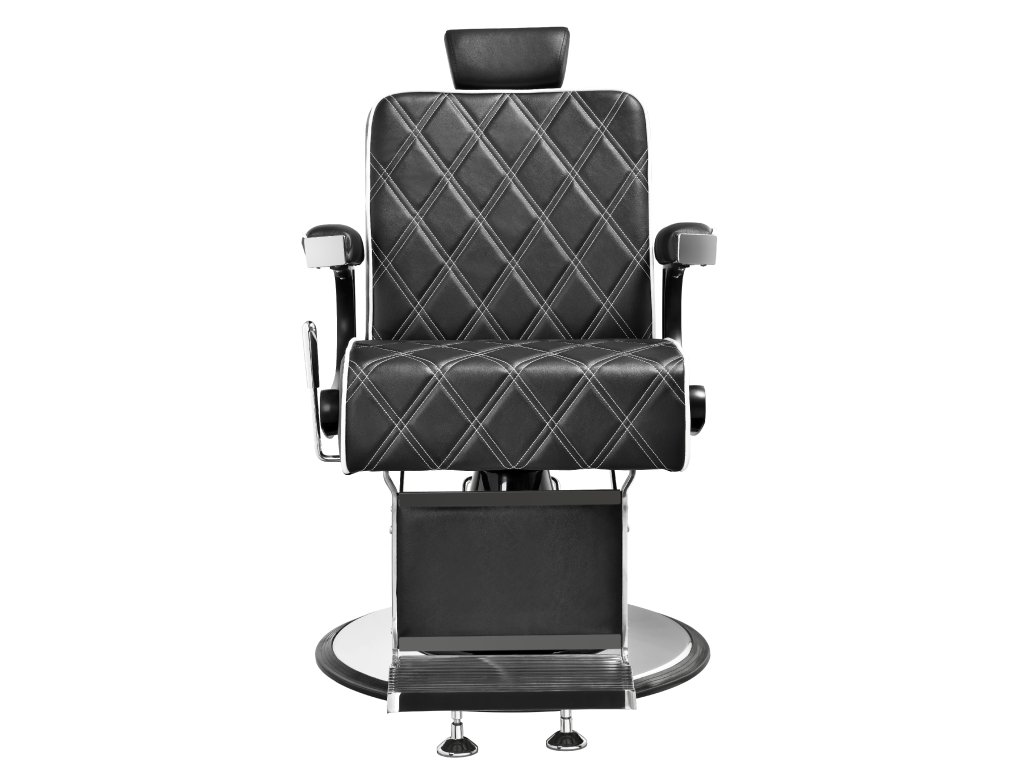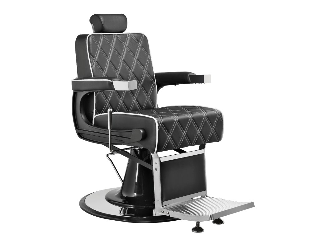 Elegantní holičské křeslo s podvozkem vyrobeným z vstřikovaných hliníkových dílů a pevnou kovovou vnitřní konstrukcí. Vybaveno chromovanou kulatou základnou a sedákem s pěnou s vysokou hustotou pro maximální pohodlí a odolnost. Čalounění s bílým prošíváním.