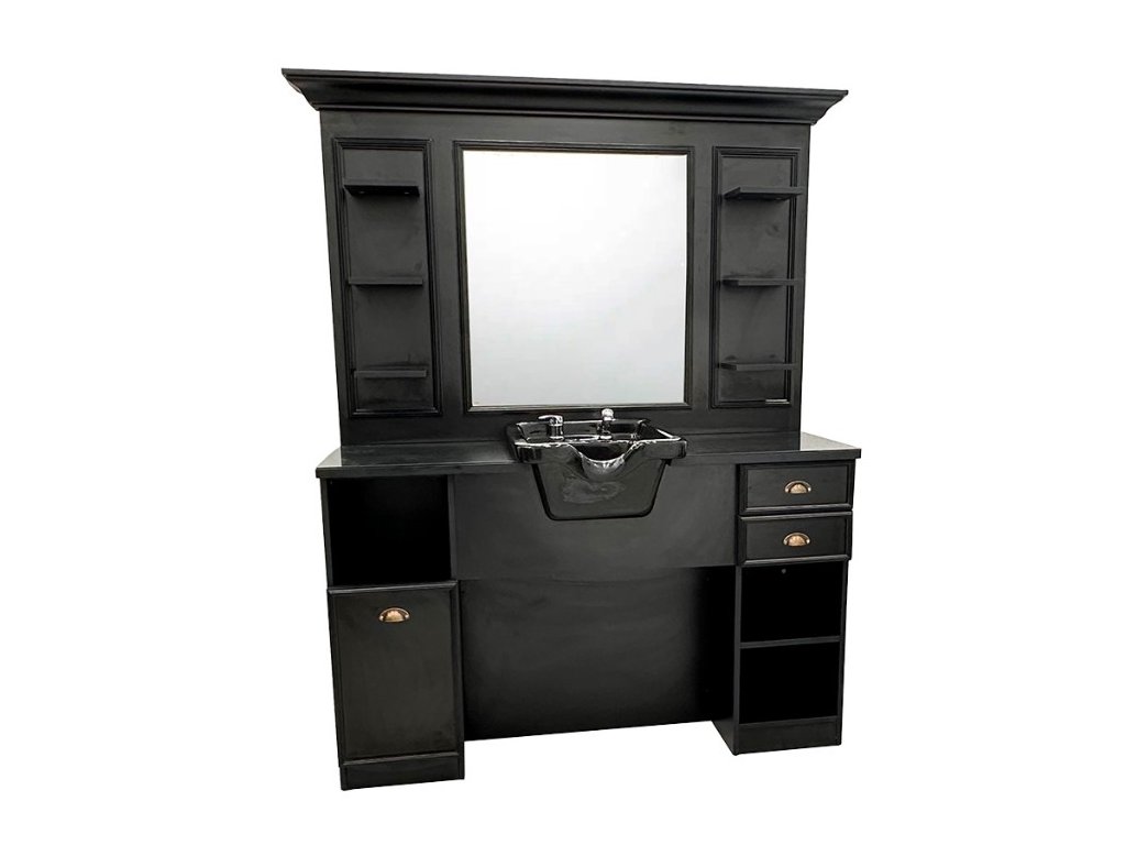 Vintage průmyslová holičská stanice Bansa od Weelko je perfektní volbou pro holičství, která chtějí spojit styl a funkčnost. Tento kus nábytku s robustní konstrukcí z dřevěné dýhy a hran z masivního dřeva poskytuje odolnost a stabilitu. Jeho vintage industriální design, zdůrazněný dekorativními lištami, dodává retro nádech. Je vybaven několika přihrádkami, policemi a integrovanou mískou na šampon umístěnou do voděodolné skleněné pracovní desky, což zajišťuje efektivní a organizovaný pracovní prostor.