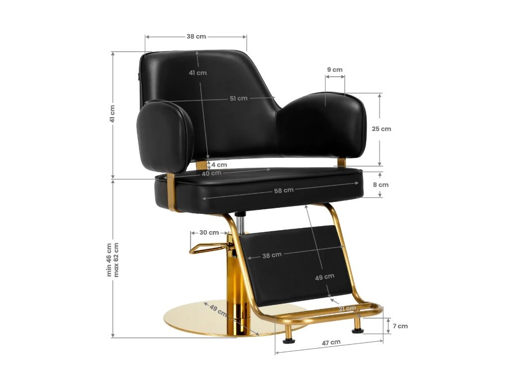Výškové nastavení je možné díky odolnému hydraulickému zdvihu, který umožňuje plynule nastavit úroveň sedáku v rozmezí 46-62 cm – i když na židli sedí zákazník. To zaručuje ergonomičtější práci a zajišťuje, že úroveň židle lze libovolně přizpůsobit výšce klienta i kadeřníka. Správně profilované opěradlo je čalouněno syntetickou kůží a umožňuje vám zaujmout pohodlnou polohu. To poskytuje vynikající oporu zad, což je důležité zejména při ošetřeních, která trvají mnoho hodin. Velkým plusem je otvor mezi opěradlem a sedákem. Usnadňuje udržování čistoty v salonu, umožňuje vám snadno vymést vlasy z každého koutu křesla a zároveň šetří čas na přípravu pracoviště mezi klienty.