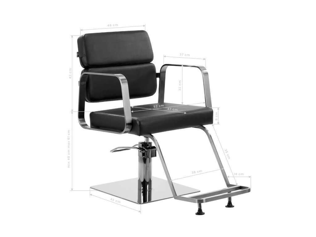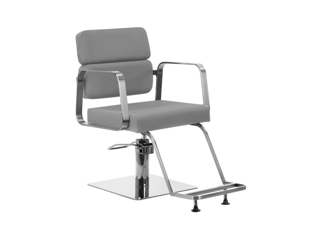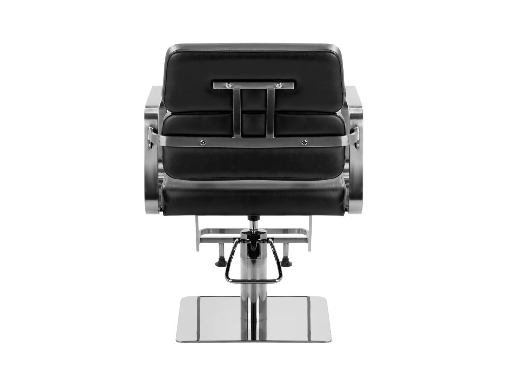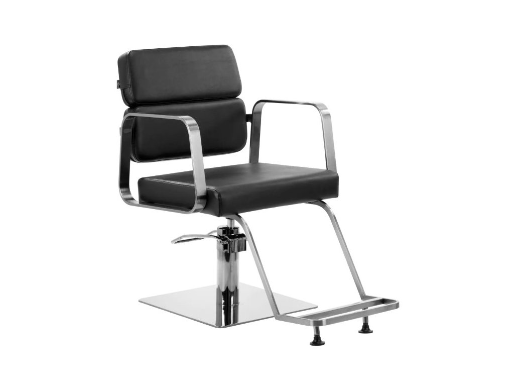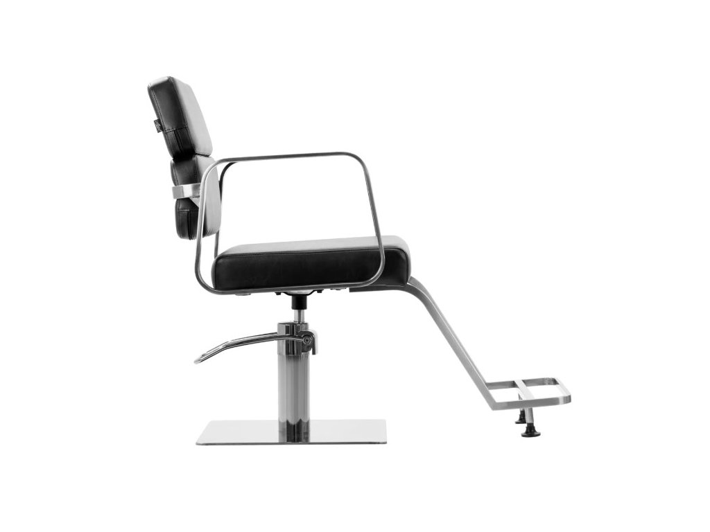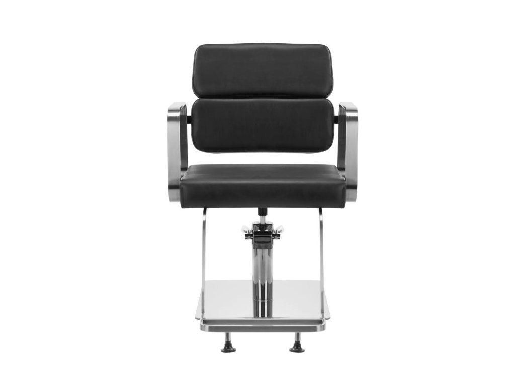 Plně otočný mechanismus, kterým je židle vybavena, zefektivňuje a zpříjemňuje práci kadeřníka. Pevná, plochá čtvercová základna zaručuje stabilitu během používání. Matný hladký povrch dodává kousku elegantní vzhled a usnadňuje jeho čištění. Pohodlné sedadlo s pěnovou výplní zajišťuje vysoký komfort používání, a to i během dlouhých hodin procedur. Geometrické kovové područky umožňují správné umístění ramen klienta – to znamená, že neskrývá hlavu v pažích ani se nehrbí – což výrazně usnadňuje provádění přesných ošetření, včetně stříhání. Stylová opěrka nohou určená pro tento model poskytuje stabilní oporu pro nohy uživatele.