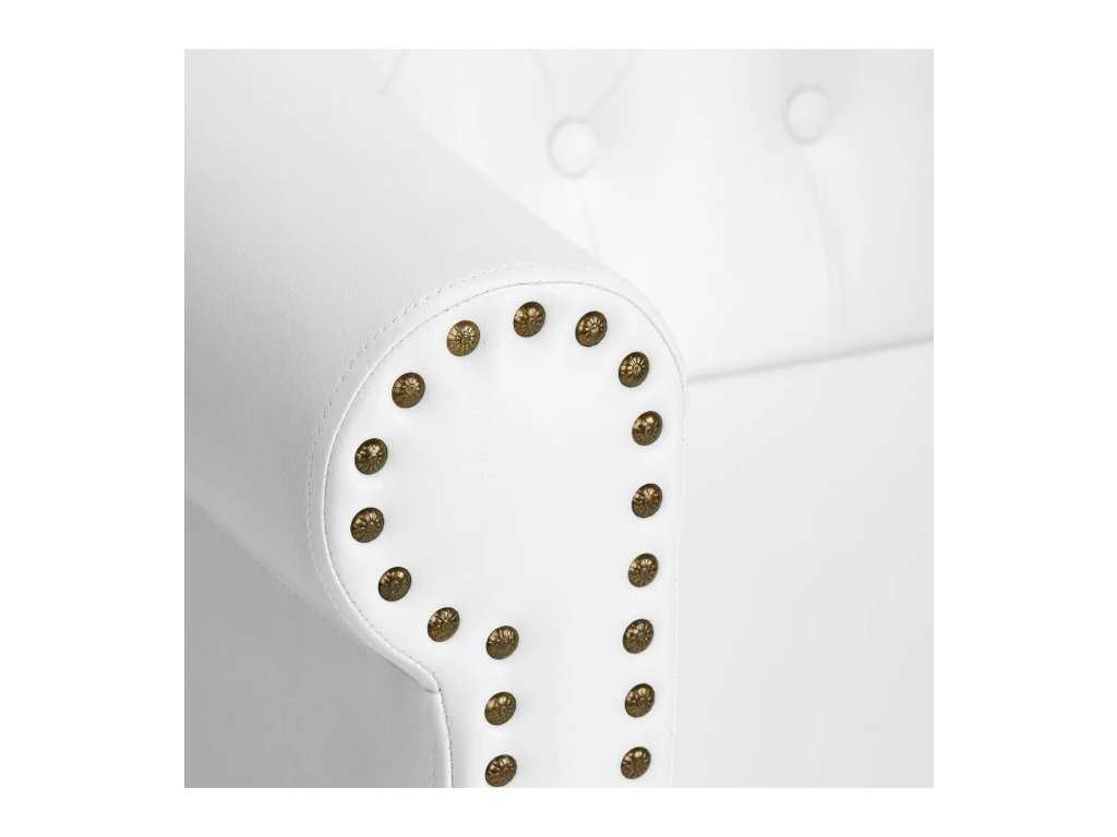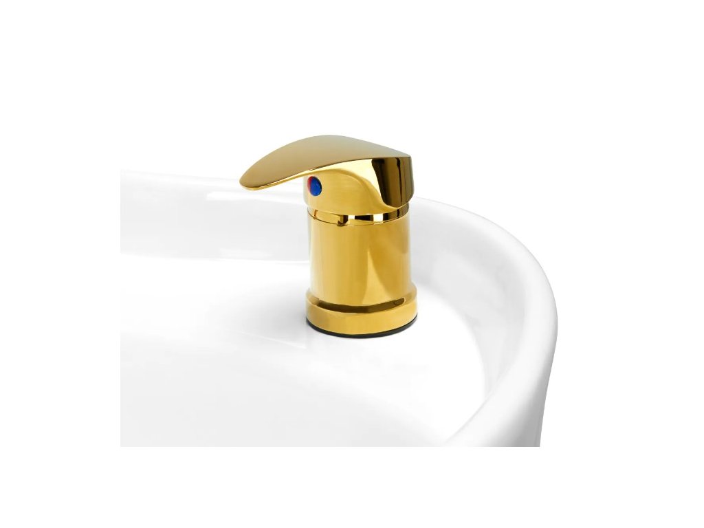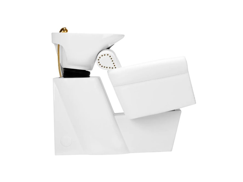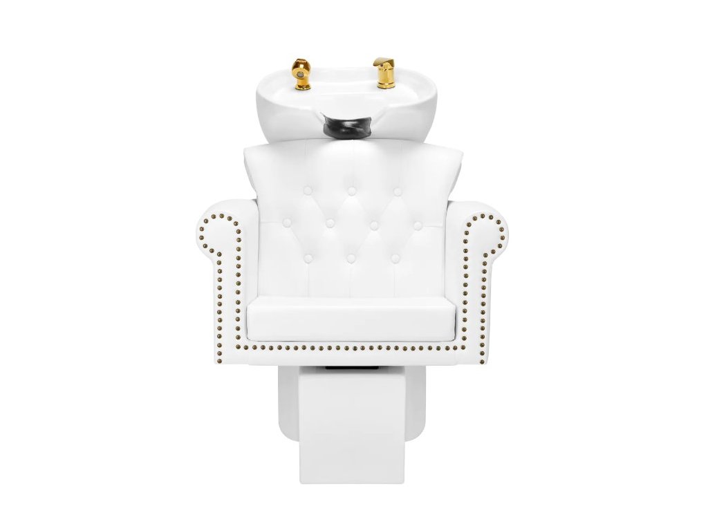 Správně profilované křeslo vyplněné odolnou pěnou poskytuje dostatečnou oporu, a tím i vysoký komfort používání. Područky umožňují správnou polohu ramen klienta. Na dotek příjemný potah ze syntetické kůže v odstínech bílé zajišťuje dlouholetou odolnost a snadné čištění. Originální, elegantní vzhled mycí linky s dekorativním prošíváním a zlatými prvky dodává interiérům jedinečný výraz. Součástí dodávky je kompletní svítidlo ve zlatém odstínu, včetně baterie, sprchové hlavice a speciálních hadic, které poskytují kompletní sadu nástrojů pro tuto práci.