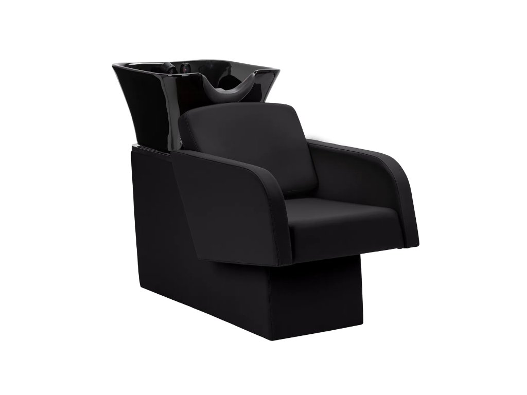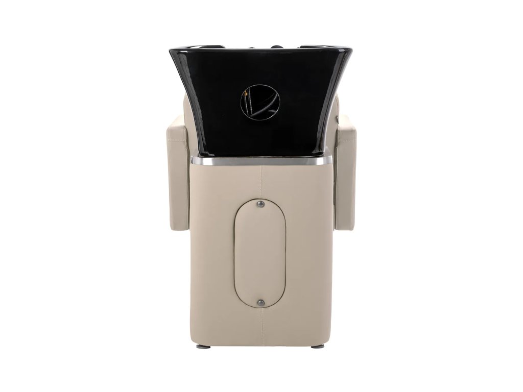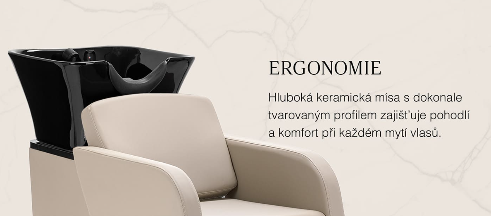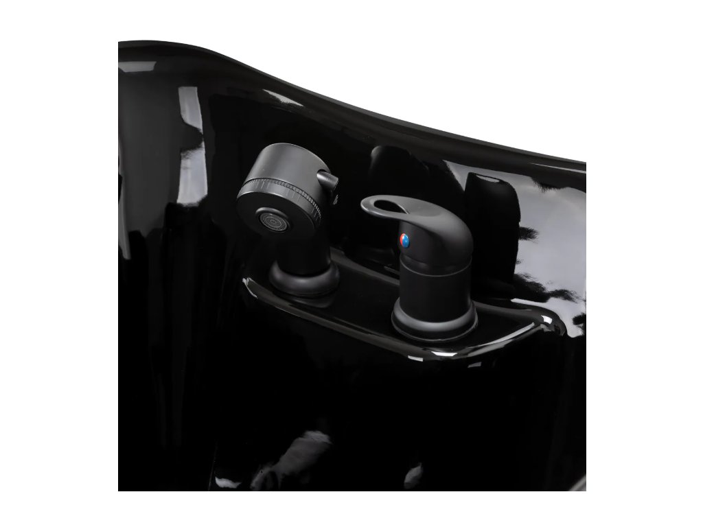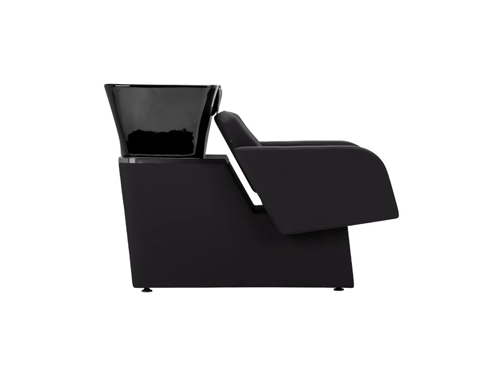 Černá keramická mísa dřezu s moderním tvarem a vhodnou hloubkou účinně zabraňuje stříkání vody a produktů používaných během ošetření, což umožňuje pohodlné a efektivní provádění široké škály služeb . Tvarovaný límec a šikmé opěradlo poskytují pohodlí a oporu při mytí vlasů , zatímco černý plastový kryt chrání klienta před studeným keramickým povrchem a zajišťuje příjemný zážitek během ošetření.