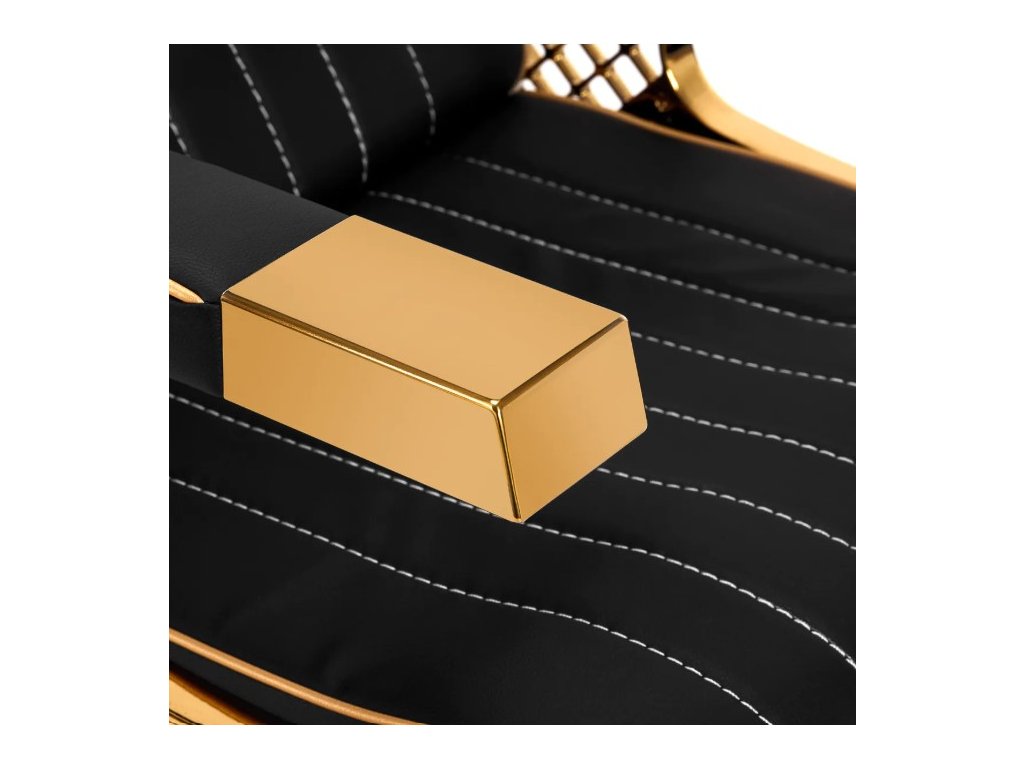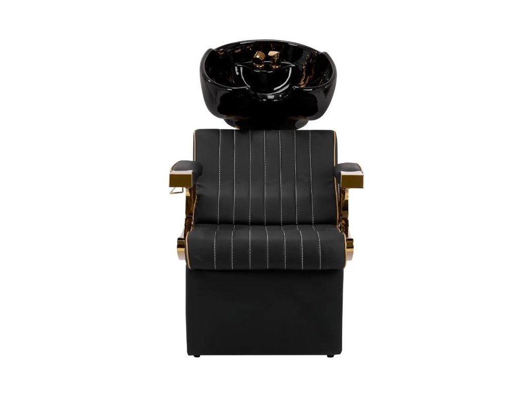 Správně profilovaná židle vyplněná odolnou pěnou poskytuje bederní oporu, a tím i vysoký komfort používání. Částečně čalouněné, zdobené područky umožňují správné umístění paží a ramen zákazníka. Potah ze syntetické kůže v odstínech černé s estetickým bílým prošíváním zajišťuje dlouholetou odolnost a snadné čištění. Originální, elegantní vzhled myčky dodává interiérům jedinečný výraz a zajímavě profilovaná základna a nohy dodávají stabilitu. Součástí dodávky je kompletní svítidlo ve zlatém odstínu, včetně baterie, sprchové hlavice a speciálních hadic, které poskytují kompletní sadu nástrojů pro tuto práci.