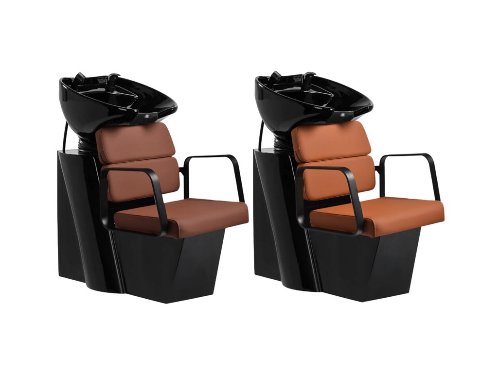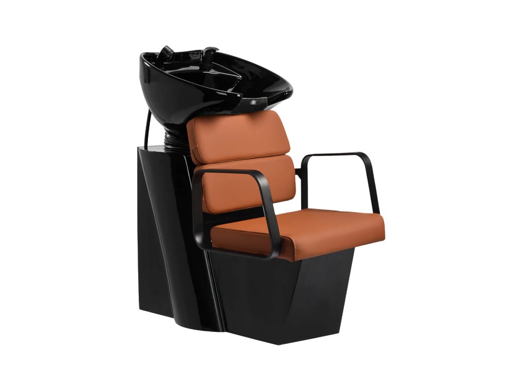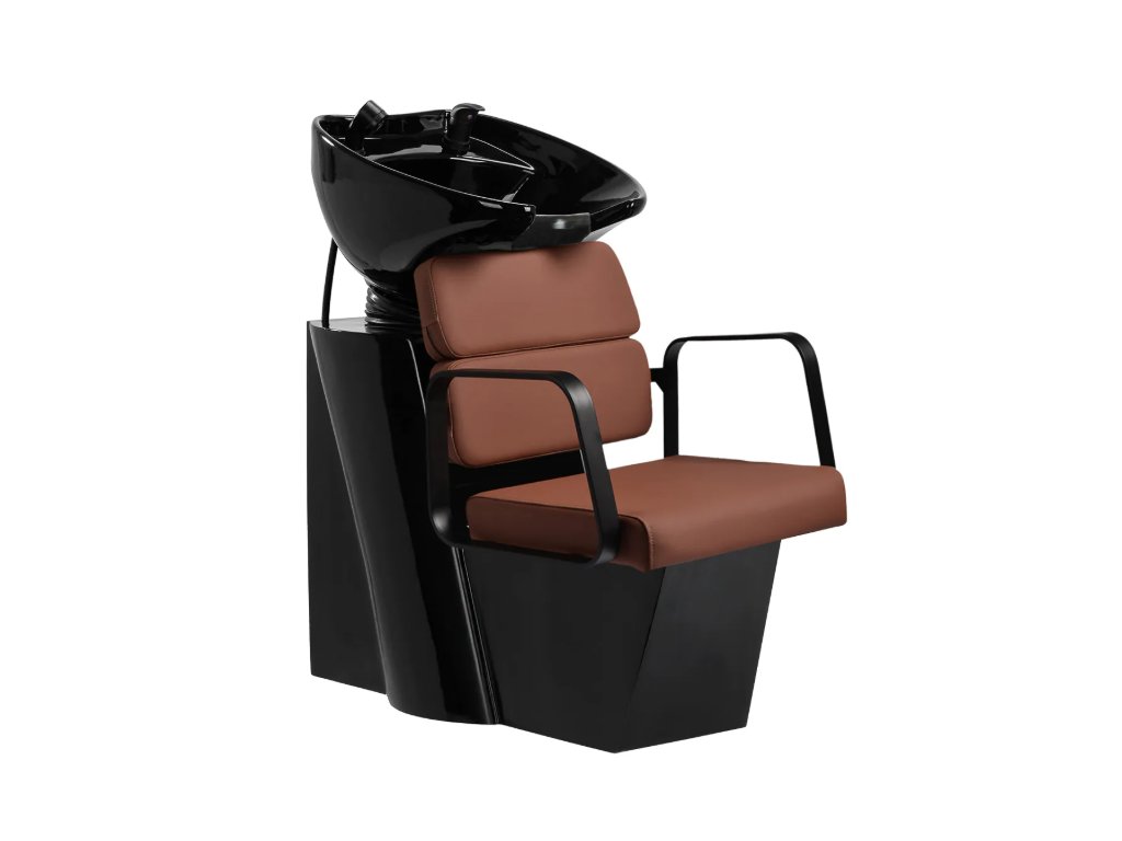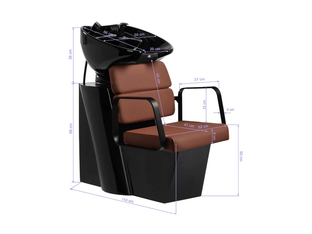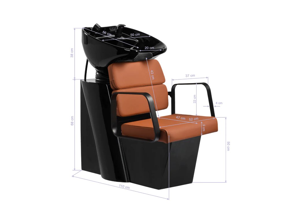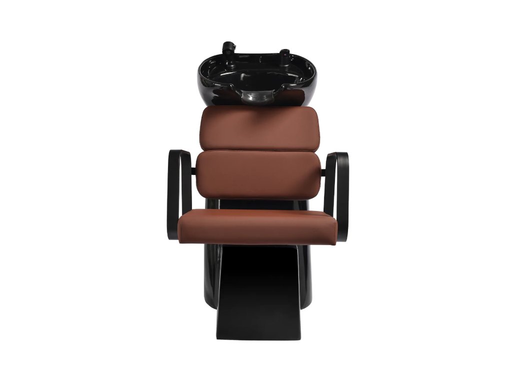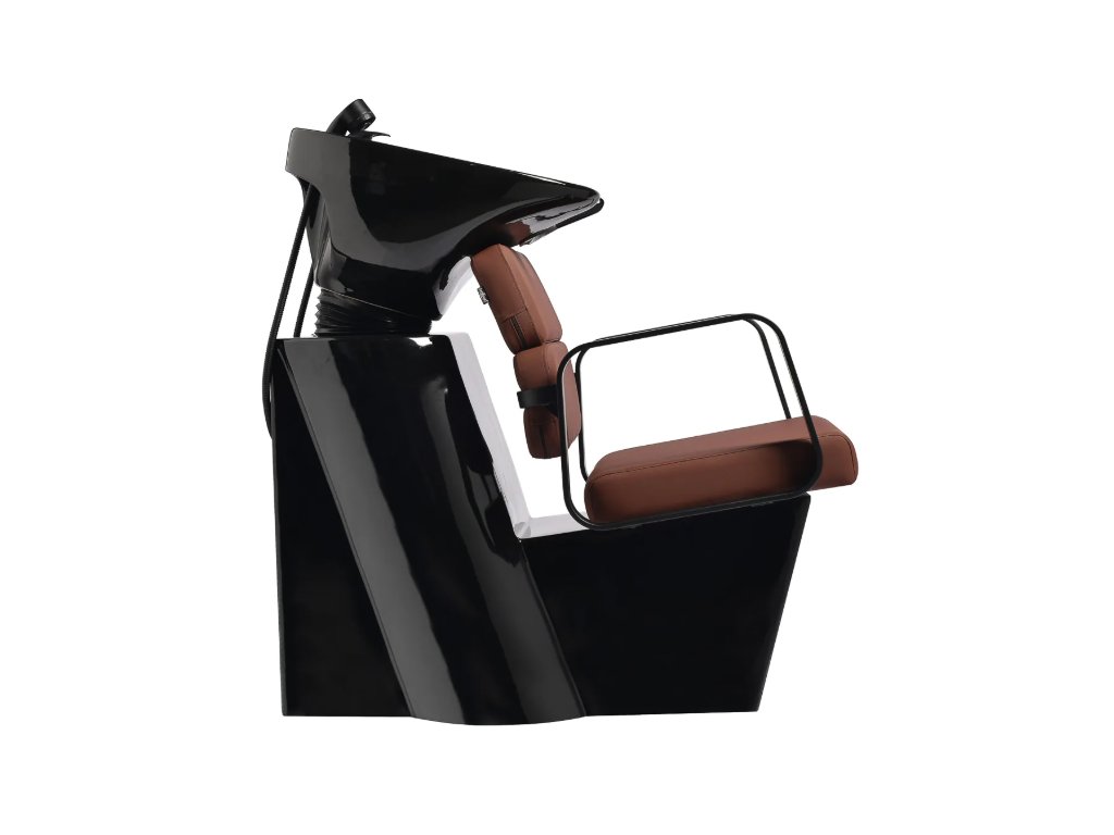 Profilované křeslo poskytuje správnou bederní oporu, a tím i vysoký komfort používání. Kovové područky v odstínech černé barvy s geometrickým tvarem umožňují správné polohování ramen klienta. Výplň z odolné pěny odolné proti deformaci a čalounění z na dotek příjemné syntetické kůže v odstínech hnědé zajišťují odolnost nábytku, snadné čištění a pohodlné používání po dlouhou dobu. Originální, elegantní design myčky dodává interiérům jedinečný nádech. Součástí balení je kompletní příslušenství v odstínech černé barvy, včetně baterie, sprchové hlavice a vyhrazených hadic, které vám poskytnou kompletní sadu nástrojů pro vaši práci.