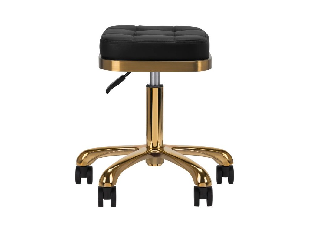 Jedinečná kosmetická stolička v černém provedení, prošívaný sedák a zlatá kovová povrchová úprava. Je výškově nastavitelný a má celohrannou základnu vybavenou pevnými kolečky.