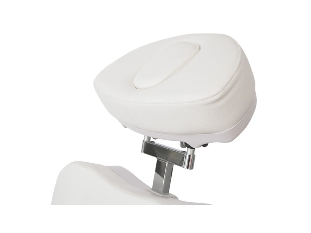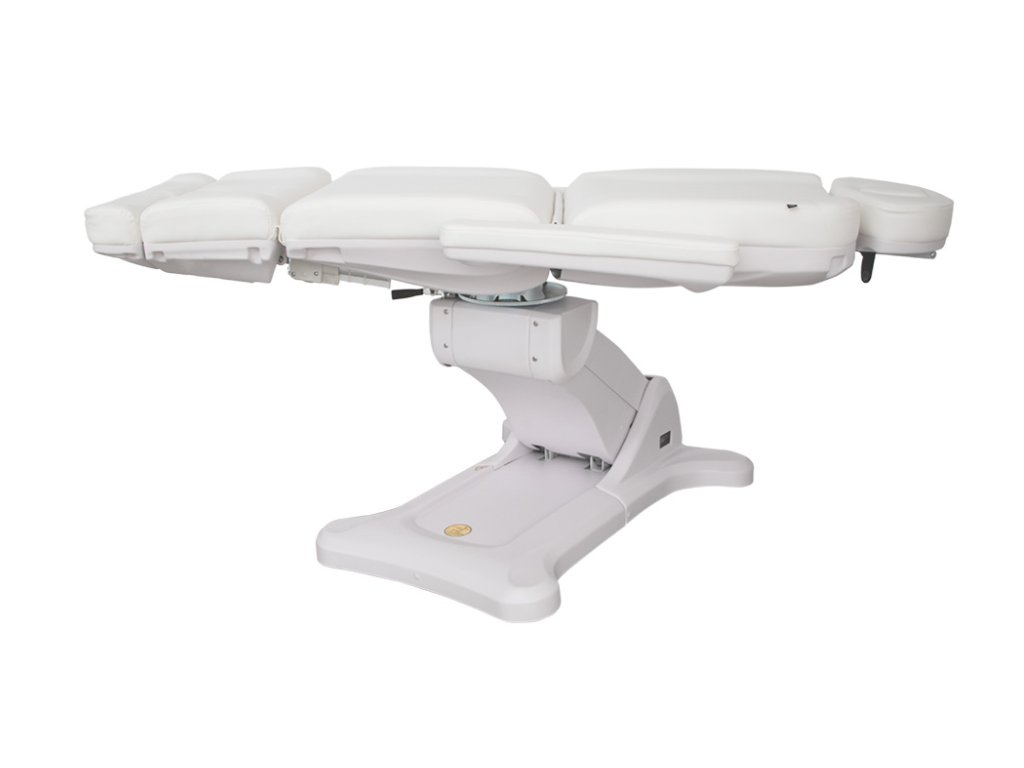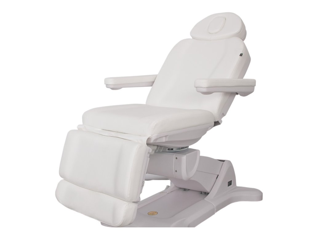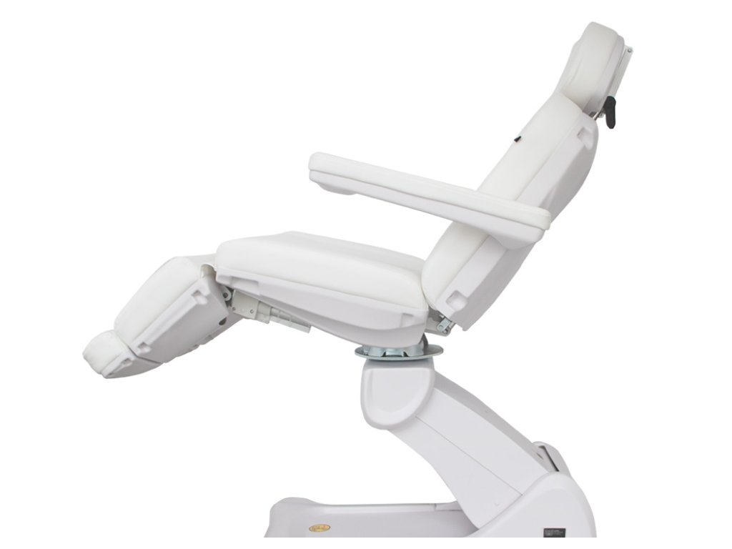 Luxusní křeslo s velmi stabilní základnou a vysokým komfortem. Speciální design, který umožňuje nejlepší nastavení výšky. 4 motory automaticky ovládají pohyby (výška, opěradlo, sedák, podpěra nohou).Sedadlo se otáčí kolem své osy o 240 ° a poskytuje tak potřebný prostor k práci, a to i v těch nejmenších místnostech. Reverzibilní ramena a nastavitelné opěrky hlavy a nohy. Bílá PU čalounění vysokou kvalitu a snadné čištění.