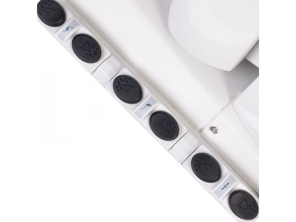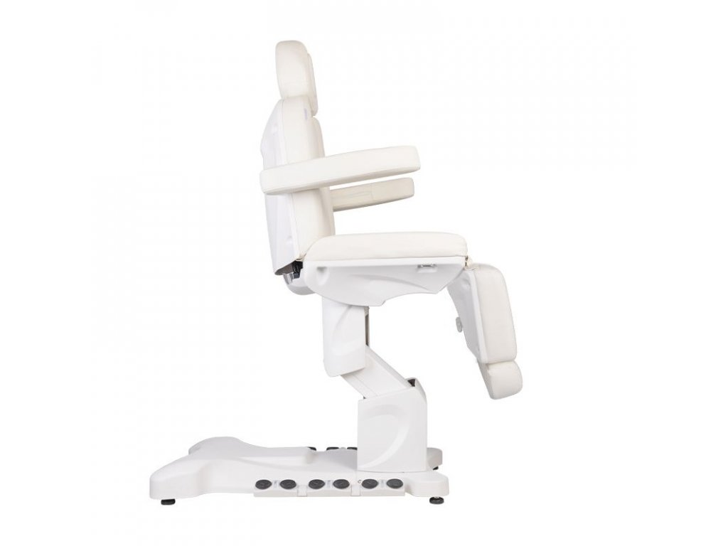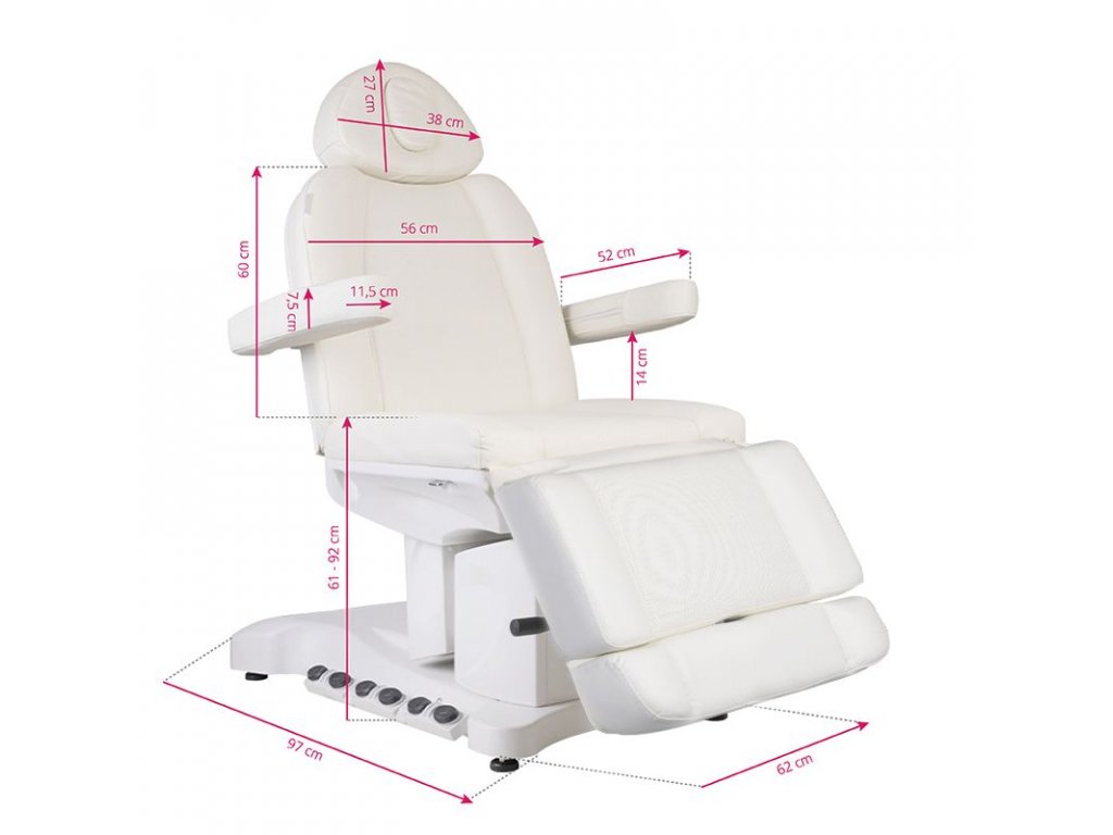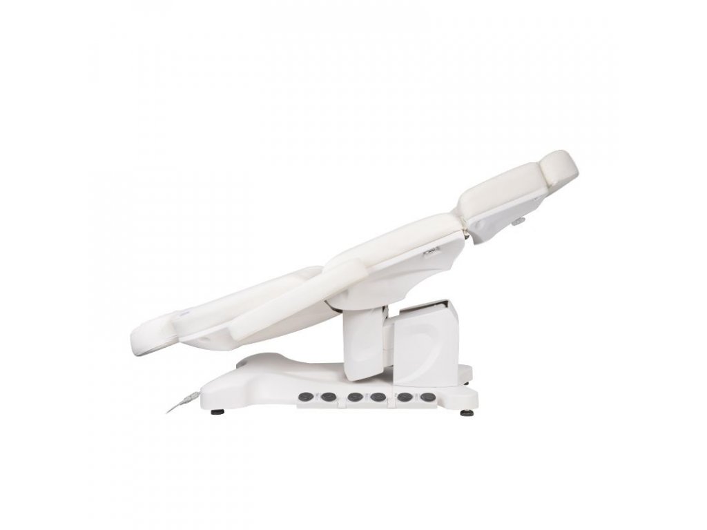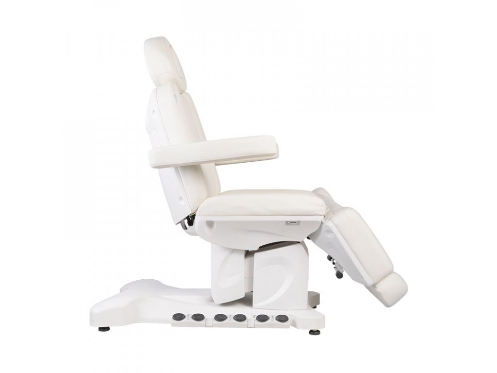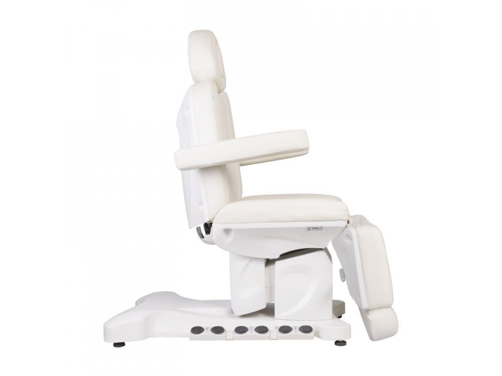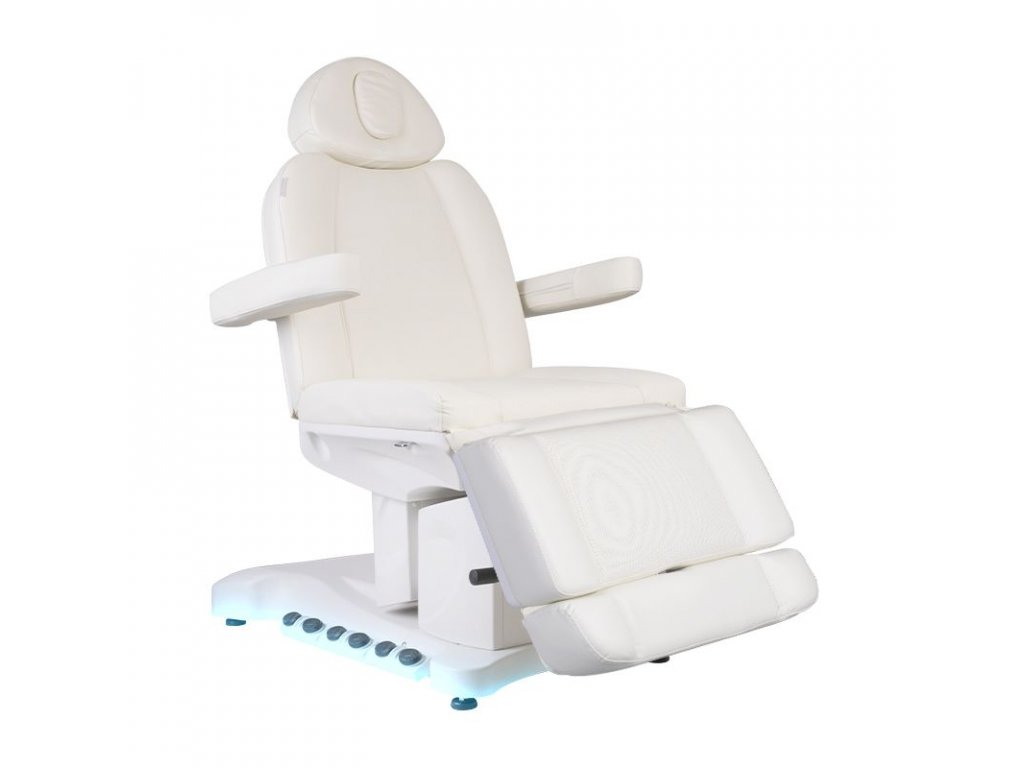 Unikátní elektrická kosmetické křeslo, ideální pro kosmetické a SPA salony. Díky nezávislým motorům vám umožňuje nastavit křeslo ve 3 rovinách pomocí dálkového ovladače a nožních spínačů, což umožňuje pohodlné provádění ošetření obličeje a těla. Pomocí dálkového ovladače můžeme použít naprogramovaná nastavení a spustit funkci vyhřívání opěradla. Křeslo využívá perforované čalounění, u jiných křesel neslýchané, a barevné LED osvětlení podstavce