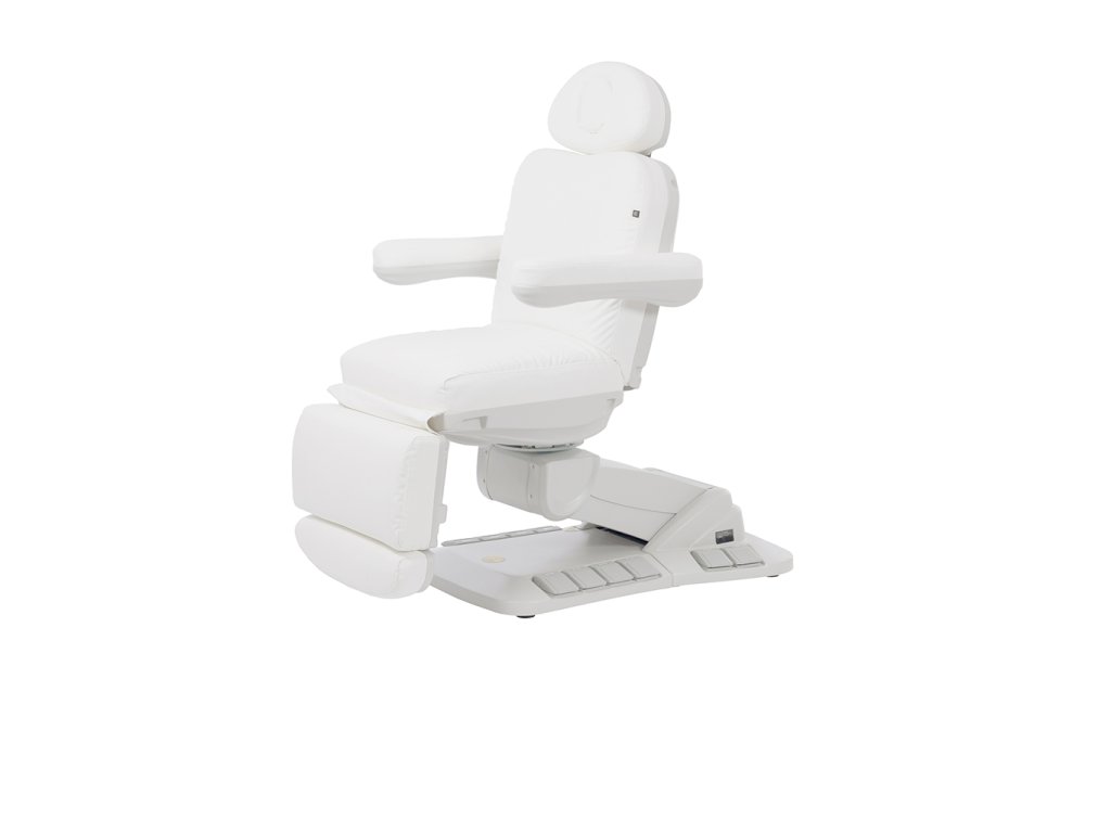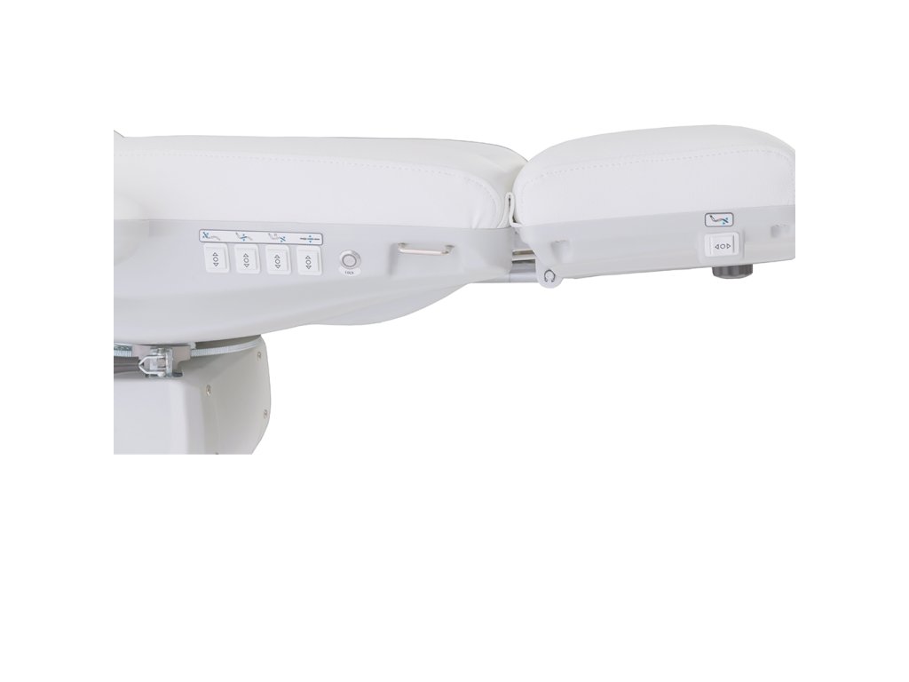 Luxusní kosmetické křeslo s velmi stabilní konstrukcí speciálně navrženou pro optimalizaci pracovního prostoru díky rotaci o 240º. 4 motory ovládají výšku, sklon opěradla, sedáku a opěrky nohou. Sklopné područky. Vestavěné tlačítkové panely a nožní ovladač umožňují kompletní ovládání všech funkcí z libovolného místa křesla. Součástí je bezpečnostní zámek a tlačítko nouzového zastavení. Toto křeslo také obsahuje funkci RESET pro uvedení křesla zpět do nulové polohy. Ultraměkké vysoce komfortní polstrování s bílým PU čalouněním vysoké kvality.