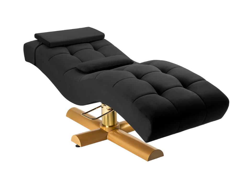 Ošetřovací křeslo je vyplněno pěnou s optimální tvrdostí, která zajišťuje ideální rovnováhu mezi měkkostí a stabilní oporou těla. Černé velurové čalounění podtrhuje elegantní a profesionální charakter vybavení . Pevná kovová základna v odstínech zlata zajišťuje trvanlivost a bezpečnost použití, zatímco prošívané švy a klasická barevná kombinace dodávají celku luxusní, nadčasový charakter. Design spojuje estetiku s funkčností, díky čemuž se křeslo perfektně hodí do profesionálních interiérů.