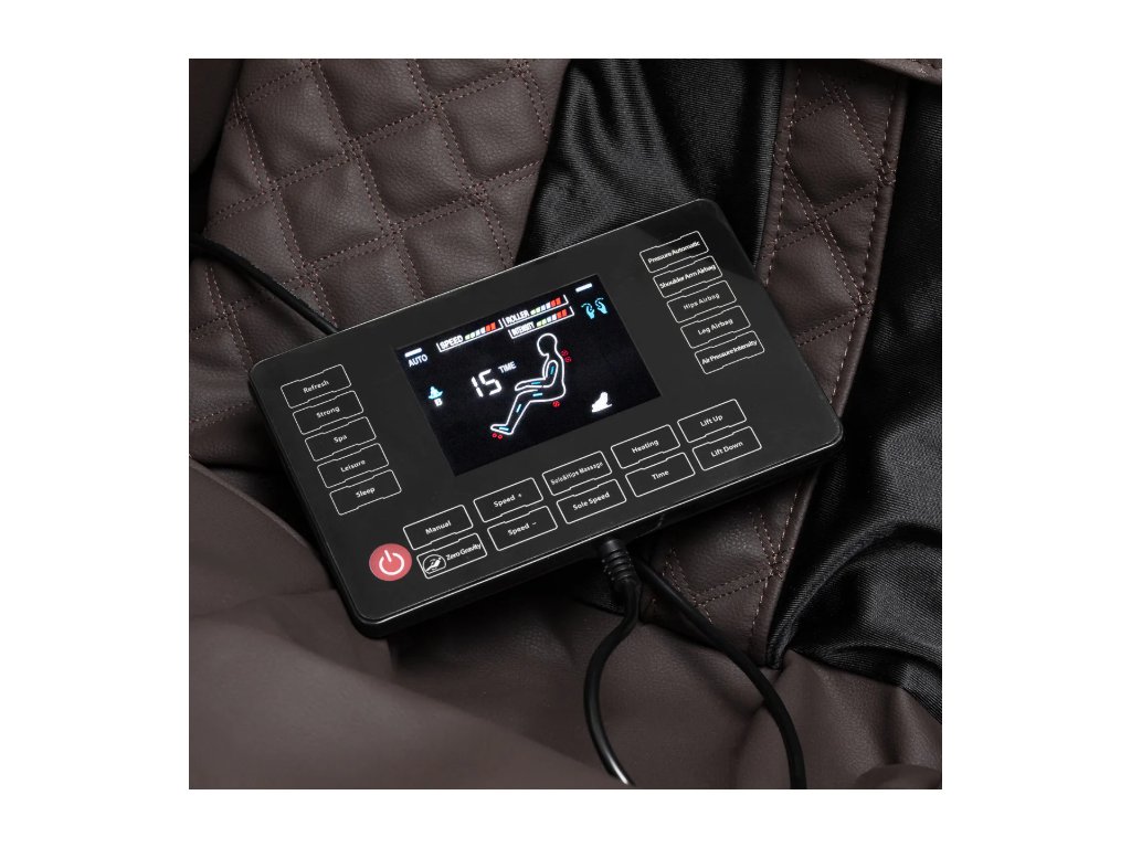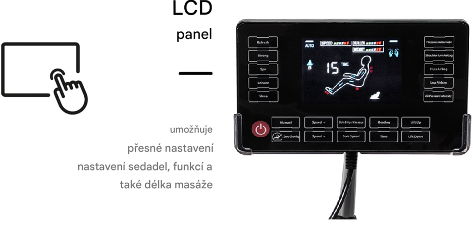 Přehledný ovládací panel s LCD obrazovkou zajišťuje snadné a intuitivní ovládání křesla . Panel lze pohodlně umístit na rukojeť namontovanou na pravé loketní opěrce nebo jej držet v rukou. Jasný displej zobrazuje aktuální provoz zařízení , včetně masírovaných oblastí, intenzity masáže, doby ošetření a zvoleného programu. Panel umožňuje přesné nastavení křesla a masážních funkcí a také výběr délky sezení , která může být 5, 10, 15, 20, 25 nebo 30 minut.