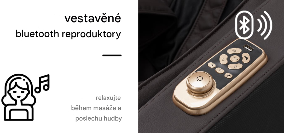 Pro ještě větší pohodlí a hlubší relaxaci nabízí masážní křeslo možnost přehrávat si během sezení vaši oblíbenou hudbu. Technologie Bluetooth umožňuje snadno připojit telefon k křeslu a přehrávat si oblíbené skladby prostřednictvím vestavěných reproduktorů . Uklidňující hudba je perfektním doplňkem masáže – zlepšuje vaši pohodu , umožňuje vám uniknout od každodenních starostí a poskytuje relaxaci nejen tělu, ale i mysli .
