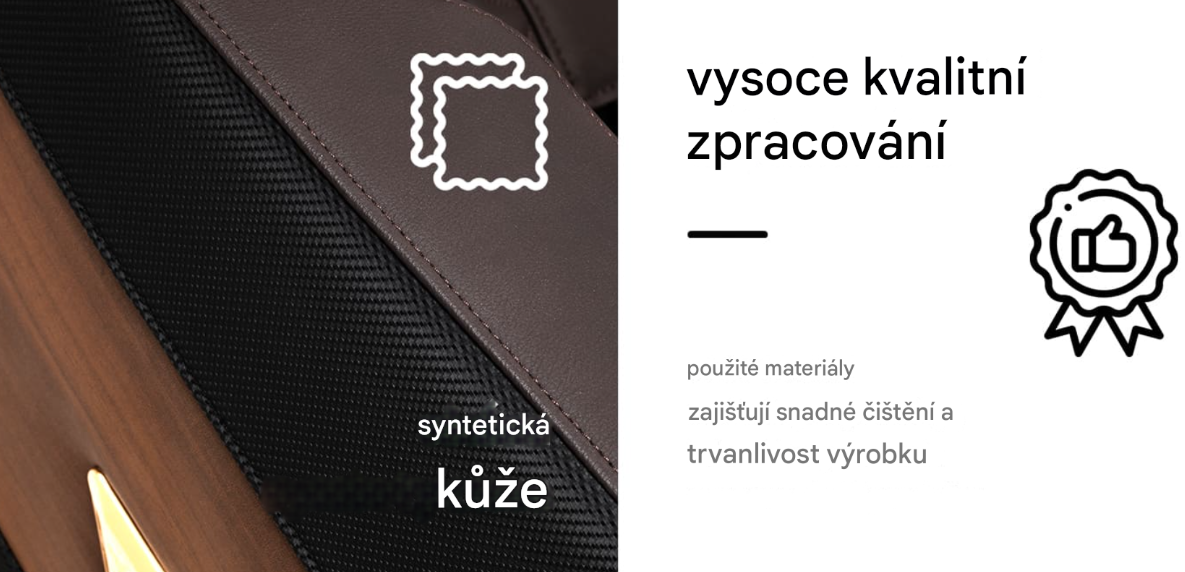 Interiér křesla je čalouněn měkkou, tmavě hnědou imitací kůže . Tento materiál je vysoce odolný vůči vlhkosti a snadno se čistí , což zajišťuje pohodlné používání. Kombinace syntetické kůže imitující dřevo a texturovaného materiálu na vnější straně křesla je poutavá a dodává mu jedinečný a elegantní vzhled . Pečlivě vyrobené prošívání zdůrazňuje stylový design, zatímco robustní konstrukce zajišťuje dlouhou životnost . Tento kompaktní model s estetickým vzhledem se bez problémů hodí do jakéhokoli interiéru. Masážní křeslo Sakura 306A je perfektním řešením pro chvilku relaxace – zejména po náročném dni nebo intenzivním tréninku.