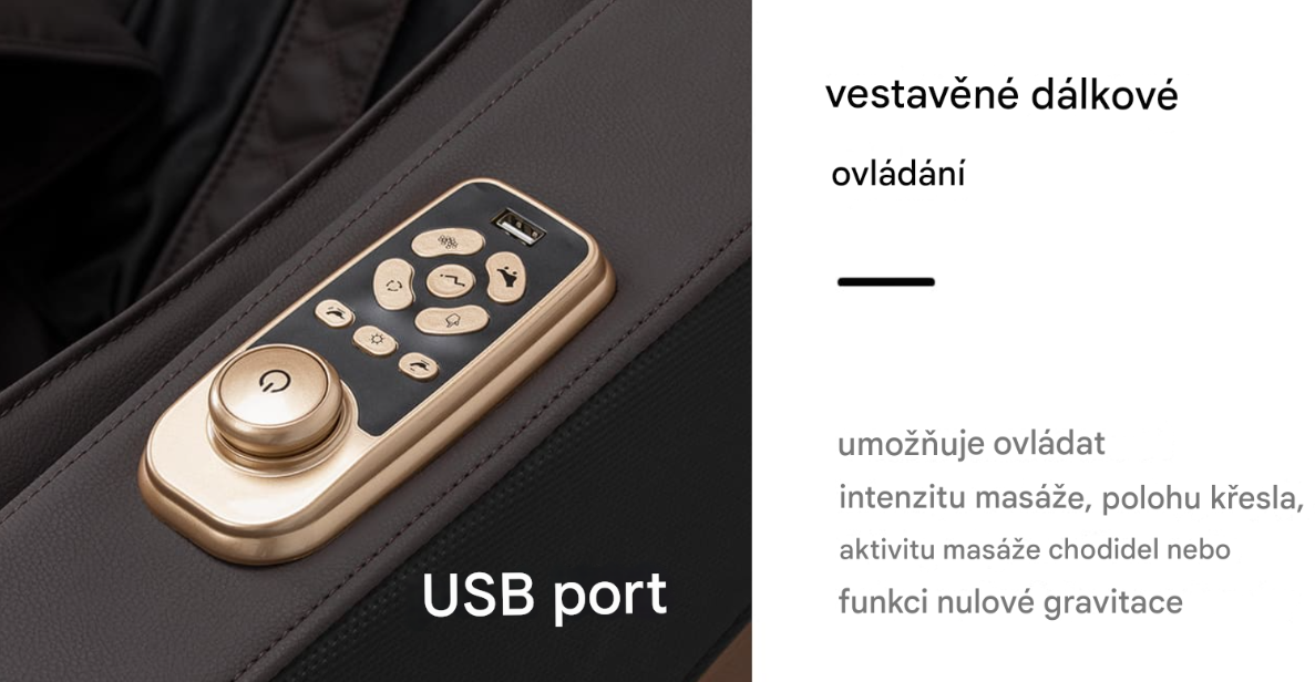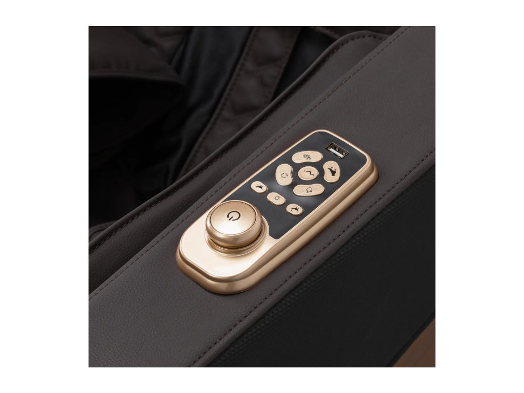 Křeslo je vybaveno tlačítky na levé loketní opěrce pro pohodlné ovládání nastavení. Vestavěné praktické dálkové ovládání umožňuje kdykoli během ošetření upravit určité parametry masáže , včetně polohy křesla, intenzity masáže chodidel a funkce nulové gravitace. Pro ještě větší pohodlí má křeslo USB port , který umožňuje nabíjet telefon během používání.