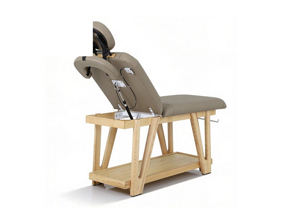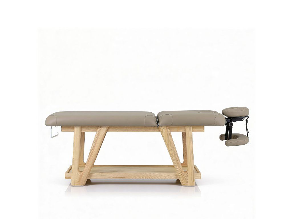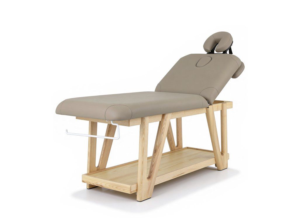 Pevná dvoudílná dřevěná masážní postel s robustním a přírodním designem, ideální pro masážní, wellness a tělová centra. Masivní dřevěný rám se spodní policí a integrovaným držákem na papírové role. Součástí je vysoce pohodlná polstrovaná matrace a nastavitelná opěrka hlavy s nastavením výšky, úhlu a hloubky. Nastavitelné područky pro větší pohodlí klienta. Čalouněná vysoce kvalitní bílou PU.