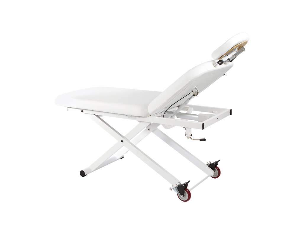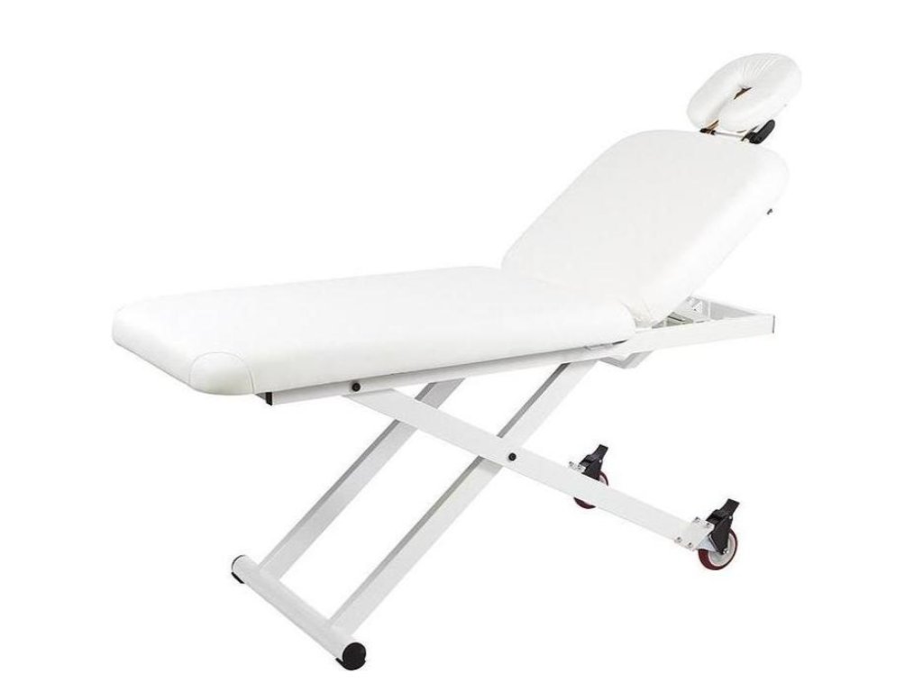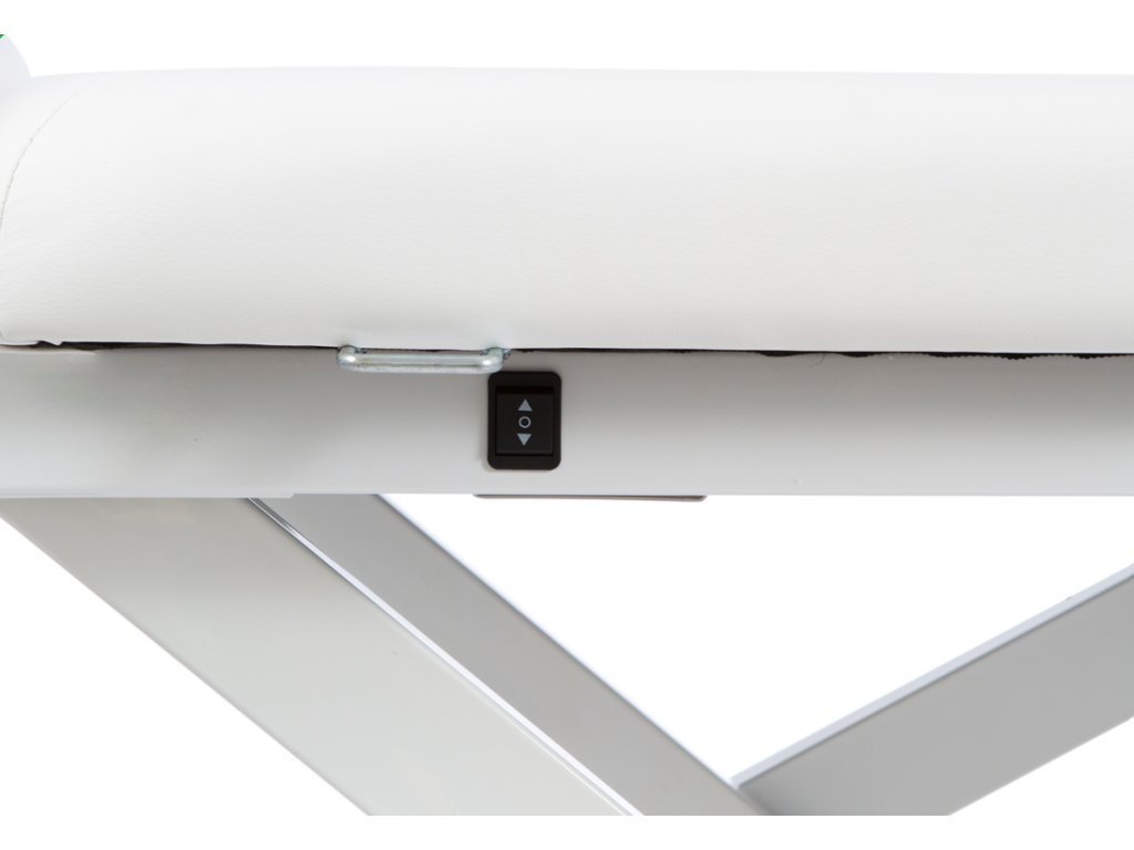 2-dílné masážní lehátko. Opěradlo je nastavitelné mechanicky a výška lehátka se automaticky nastaví pomocí elektromotoru. Nastavitelná opěrka hlavy. Robustní kovový rám s kolečky pro usnadnění jeho přemísťování. Bílé PVC čalounění s vysokou kvalitou a pro snadné čištění.