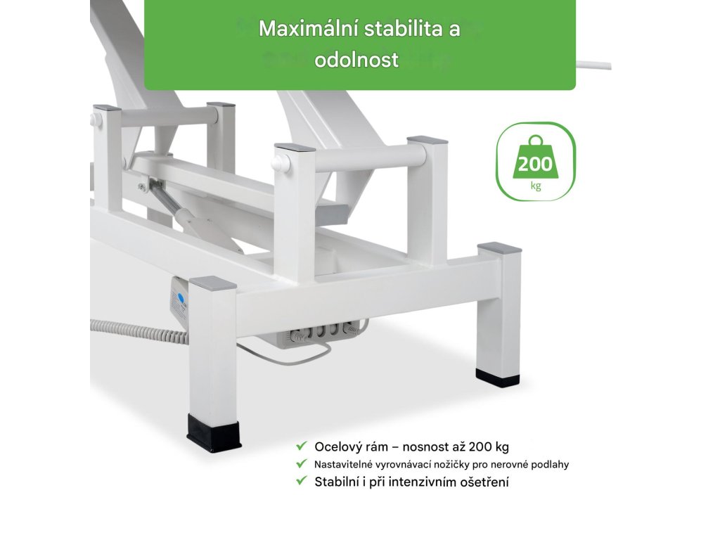- Odolný rámec: Stůl Fortis 2 je navržen pro vynikající stabilitu a odolnost. Konstrukce rámu umožňuje maximální zatížení až 200 kg, což zajišťuje bezpečnost během léčby, a to i pro pacienty s větší tělesnou hmotností.