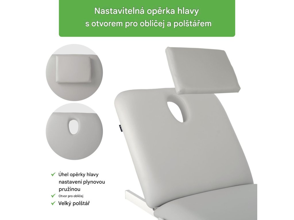 - Nastavitelné opěradlo s otvorem na obličej a hlavovým polštářem: Úhel sklonu opěradla je nastavitelný a mechanismus plynových pružin zajišťuje tiché a přesné polohování pacienta tak, aby vyhovovalo potřebám terapie. Otvor pro obličej ve stole umožňuje volné dýchání v poloze "vleže". V případě potřeby otvor zakrývá velký polštář, který poskytuje pohodlí pacientovi v poloze "na zádech" nebo na boku.