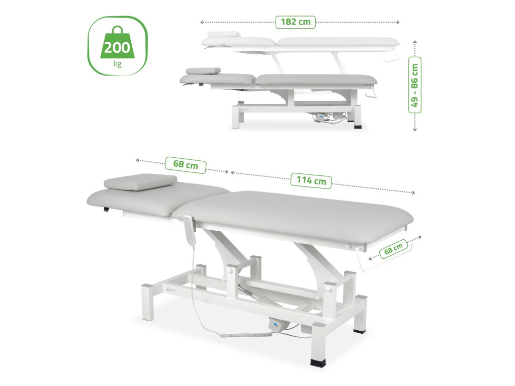 - 2dílná stolní deska: Pohodlný povrch o rozměrech 182 cm x 68 cm se skládá ze dvou částí: opěrky hlavy a hlavní plochy stolu. Nastavitelná opěrka hlavy umožňuje polohování oblasti krku pacienta.